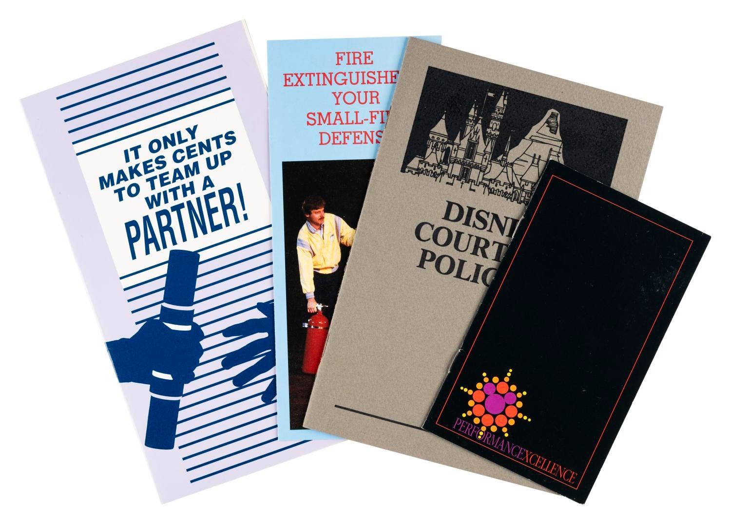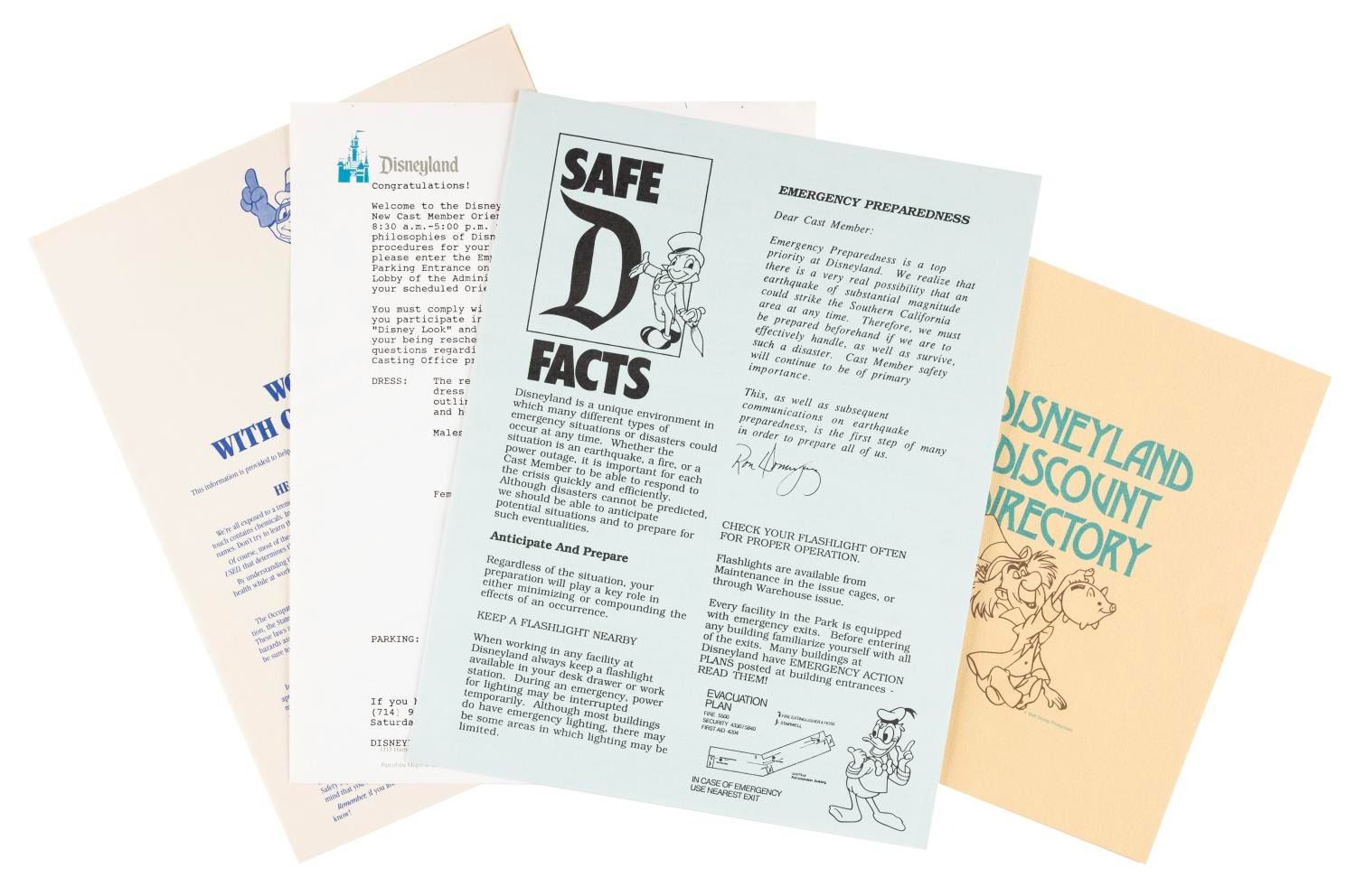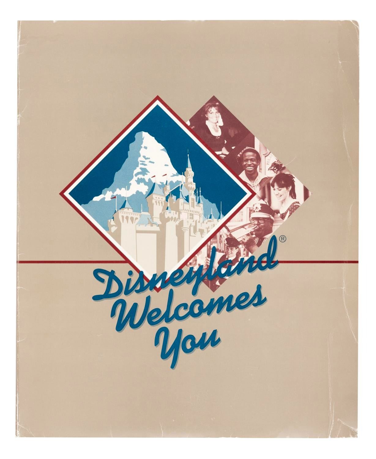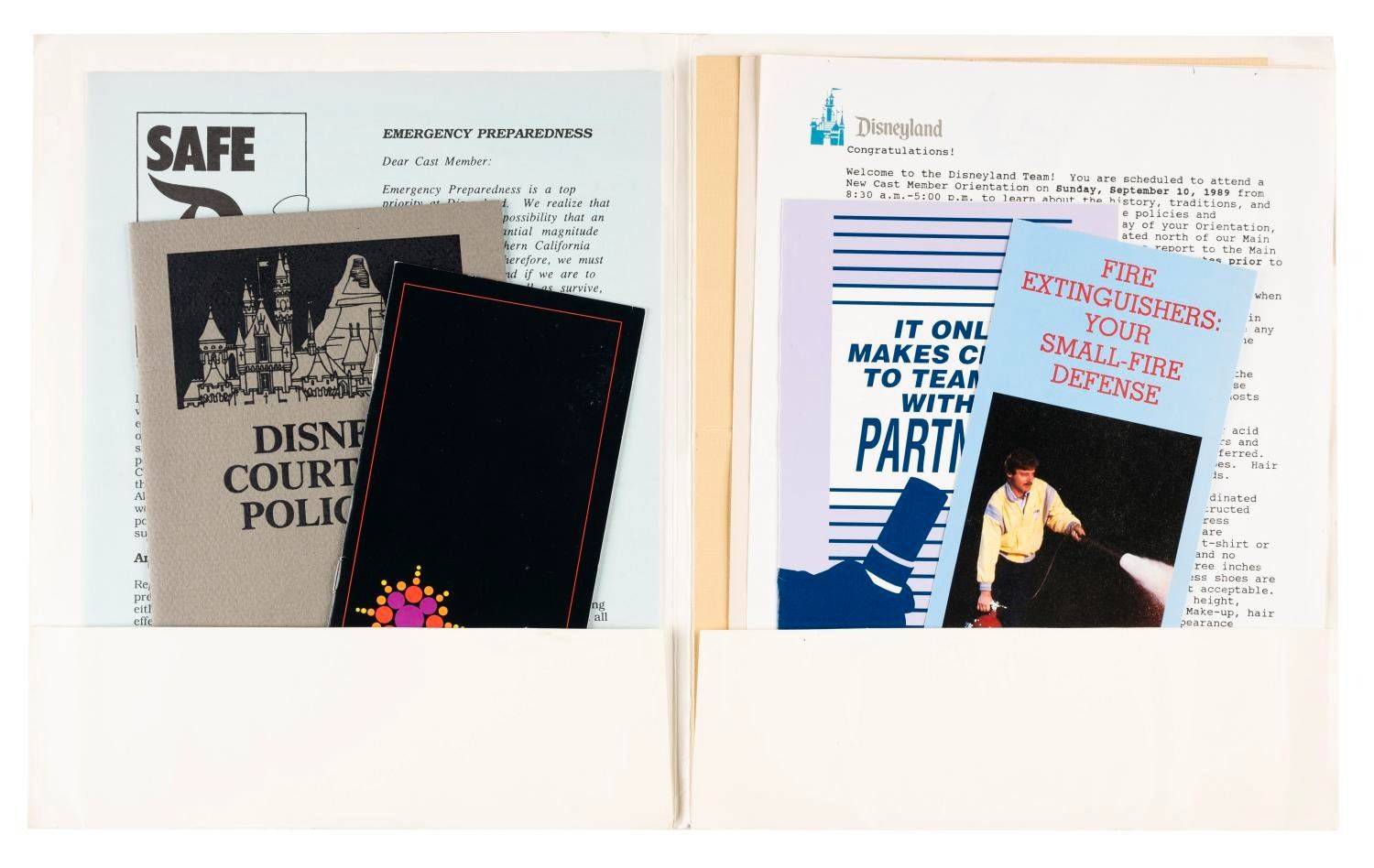 (Disneyland, 1989-1994) A Disneyland Welcomes You orientation folder for new Cast Members. The contents include a Disneyland Discount directory, a Safe D Facts Flyer, and several other flyers on Disneyland policies and safety procedures. Measuring 9.5" x 11.5" overall, the folder is in fair condition with wear overall, while the contents are in very good to fine condition.