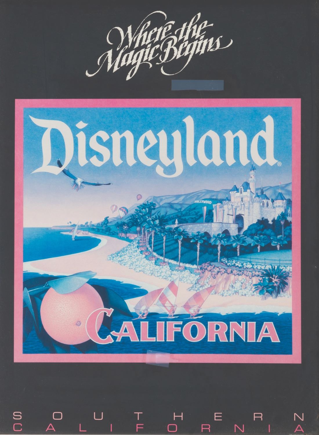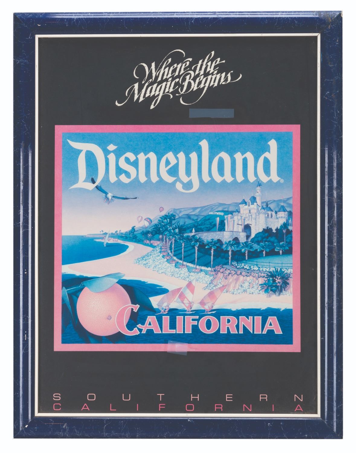 (Disneyland, 1988) A print titled Where the Magic Begins promoting Disneyland as part of Southern California's travel appeal. The poster features Sleeping Beauty Castle near the beach, even though the Disneyland Resort is quite far from the California shoreline. This design was later reused on crates given to members of the press for the opening of Disney's California Adventure. Measuring 18" x 24" in a 20.25" x 26.25" frame, the print is in very good condition with light wear, while the frame displays in good condition with stains, scuffs, and wear.