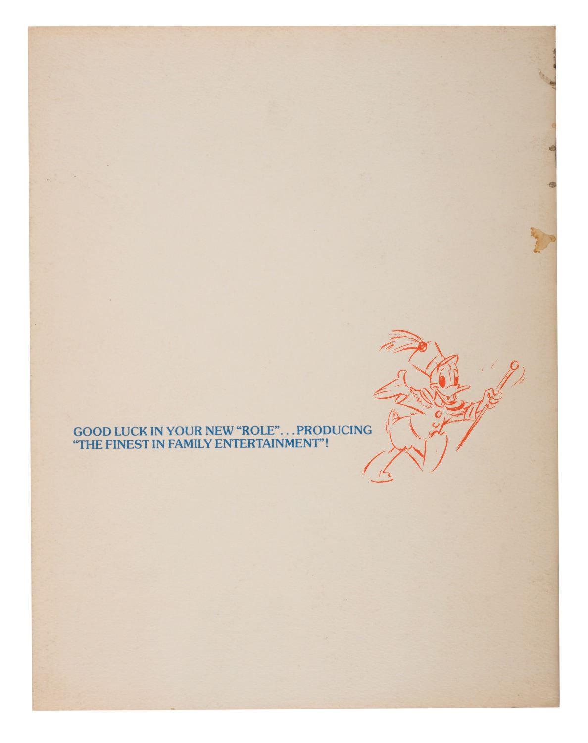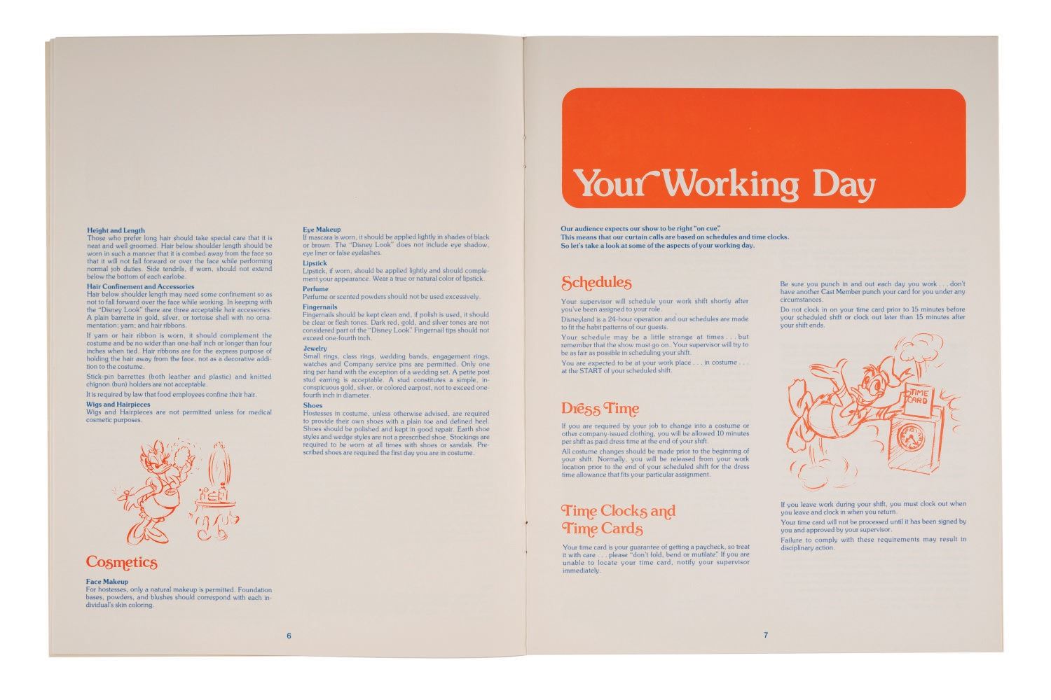 (Disneyland, 1979) An orientation booklet issued to new cast members titled Disneyland & You. The staple-bound 20-page guide introduces new hires to the "Disney Way" and features reminders on grooming standards, stage presence, company taboos, cast benefits, activities, and more. Measuring 11"x8.5", the booklet is in good condition with spots of discoloration along spine and throughout, and minor wear to the cover.