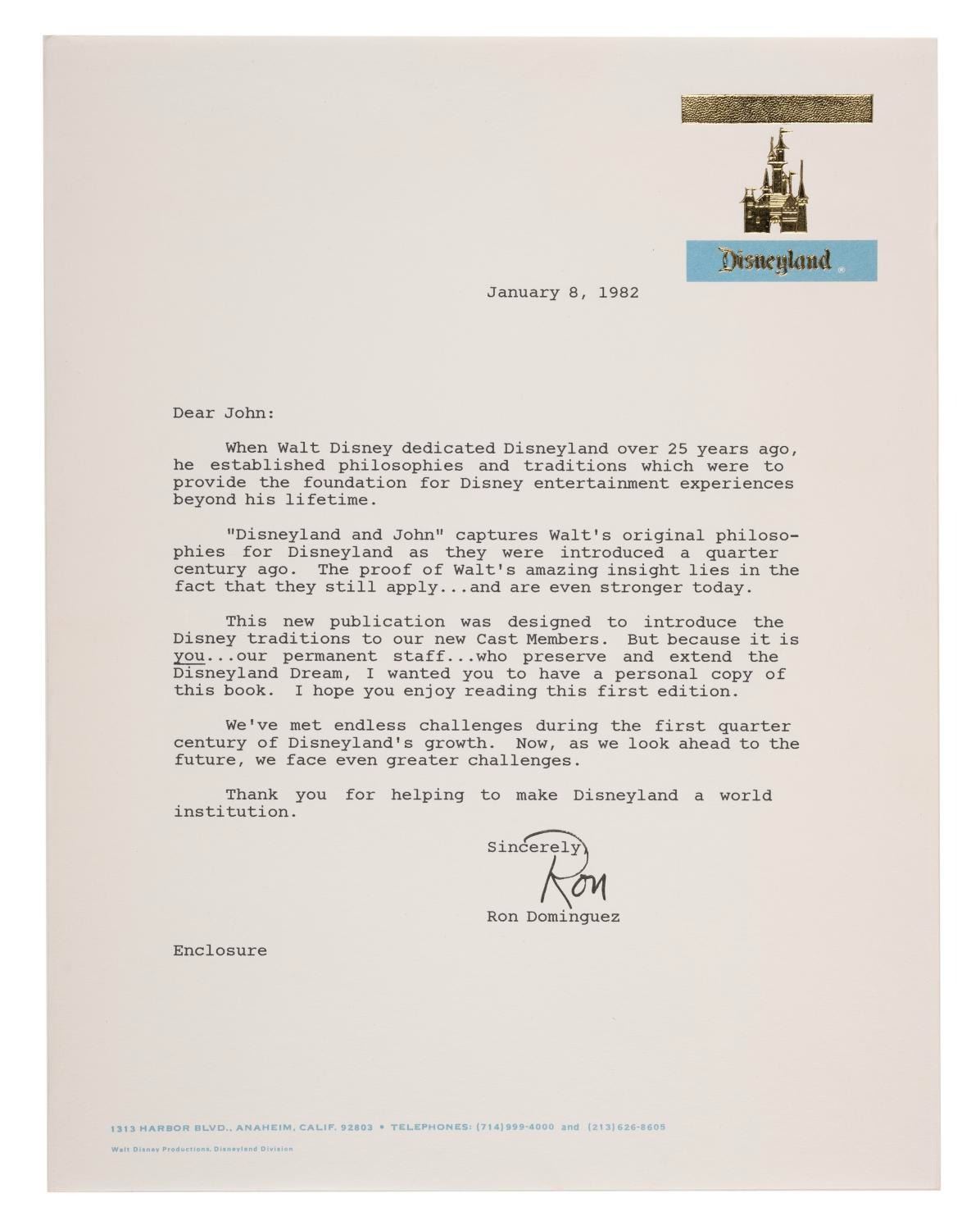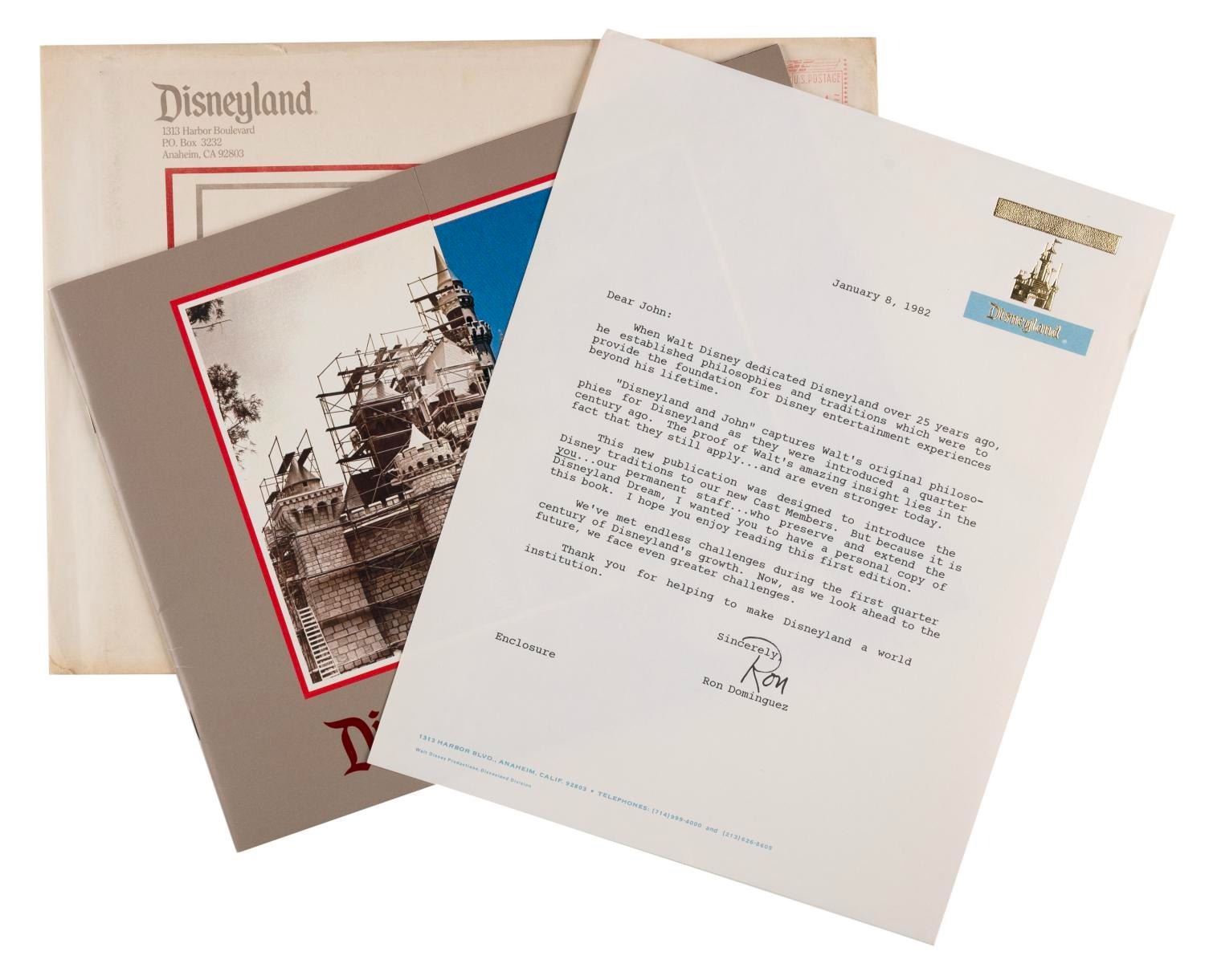 (Disneyland, 1981-82) A Cast Member Welcome to Disneyland guidebook published by Disney University to educate new hires on the policies, practices, and procedures of Disneyland. This booklet displays the original recipient's name on the cover in the bottom-right corner, and a personalized company thank-you letter enclosed within. Measuring 8.5" x 11", the book and letter are in very good condition with light wear from use.