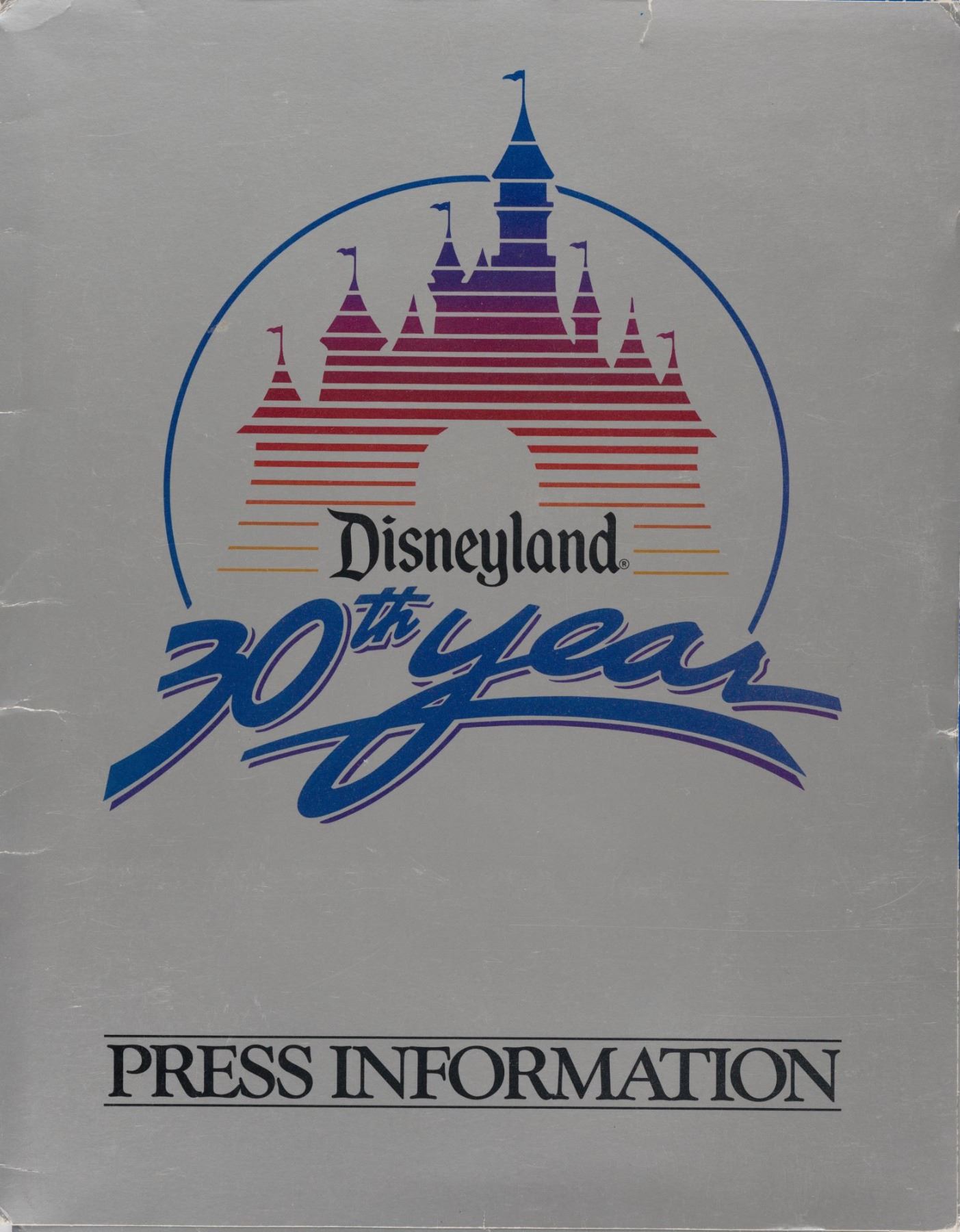 (Disneyland, 1985) A Disneyland 30th anniversary press kit folder originally used to house information and photos regarding the Parks’ special events and attractions during the anniversary. The 12” x 9” folder is in good condition with wear along the edges and spine.