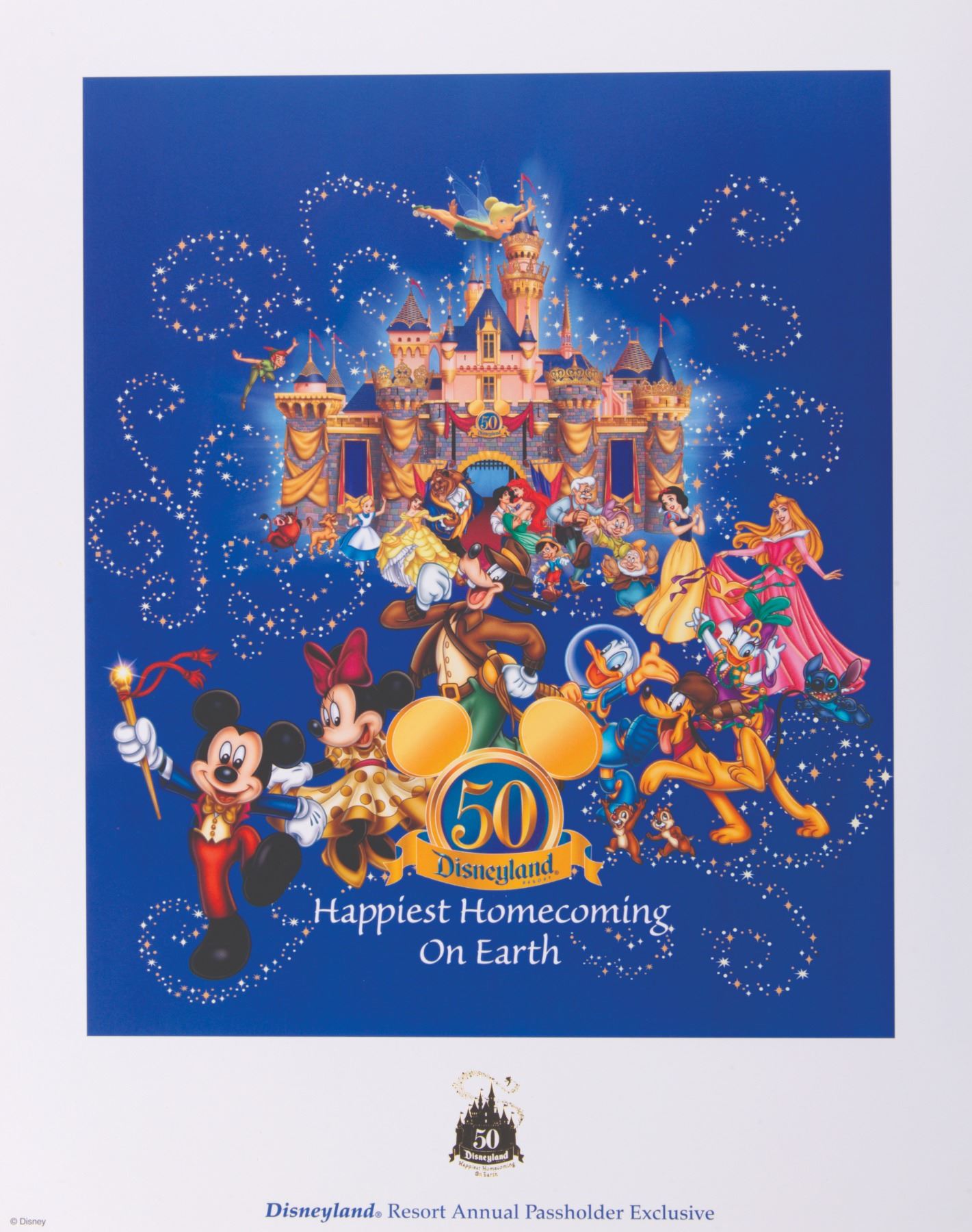 (Disneyland, 2005) An Annual Passholder exclusive lithograph released by Disneyland Resort in celebration of the Park's 50th Anniversary. "The Happiest Homecoming On Earth" depicts characters before the Sleeping Beauty Castle as it appeared in that anniversary year. With an image size of 10.75" x 9" on 11" x 14" archival paper, the lithograph is in fine condition.