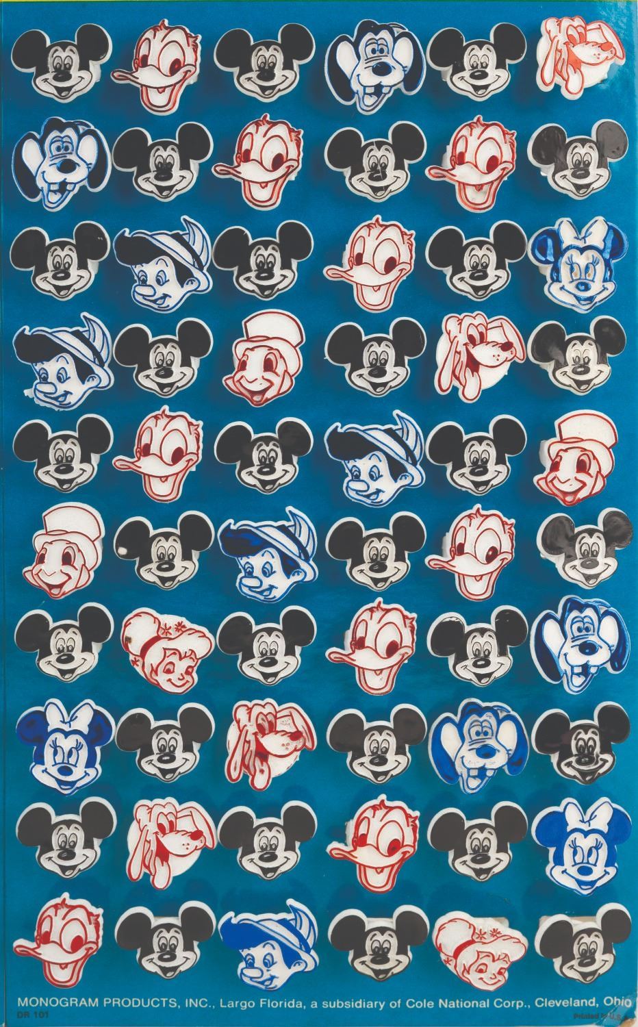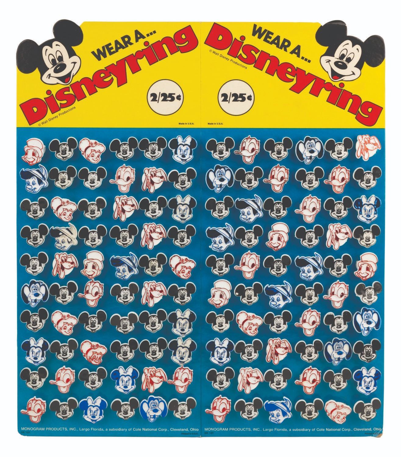 (Monogram Products, 1970s) A full store display for toy rings of Mickey Mouse, Minnie, Donald Duck, Goofy, Pluto, Jiminy Cricket, Pinocchio, and Tinker Bell. In total 120 of the plastic rings are included, each measuring 1” x 1” and under with an adjustable band. Measuring 13.5" x 15.5", the display is in very good condition with light edge wear. The rings are in very good condition, with a few exhibiting spots of color loss from scuffing or original production flaws.