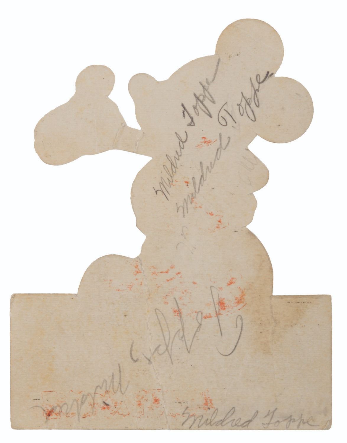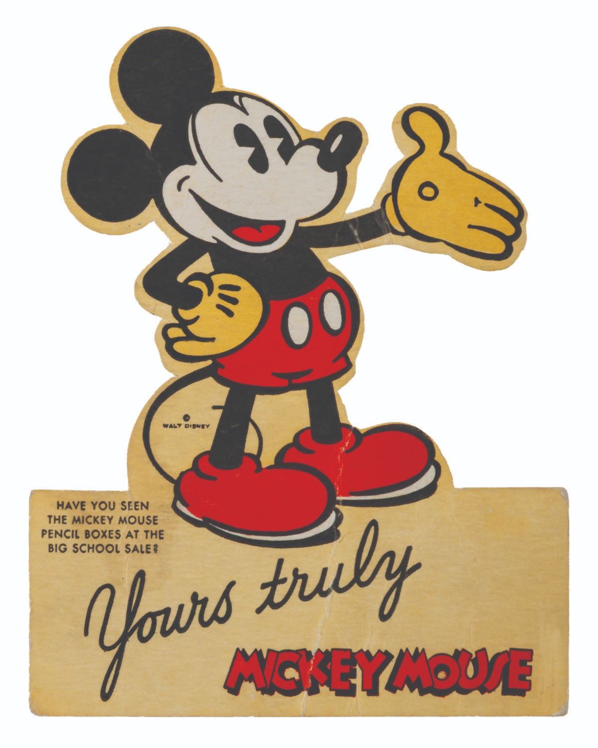 (Dixon, 1930s-40s) A Yours Truly Mickey Mouse sign, used for in-store display to promote Dixon pencil boxes. Measuring 4" x 5", the sign displays in good condition with creases throughout, edge wear, discoloration from age, and pencil inscriptions and soiling on the reverse.