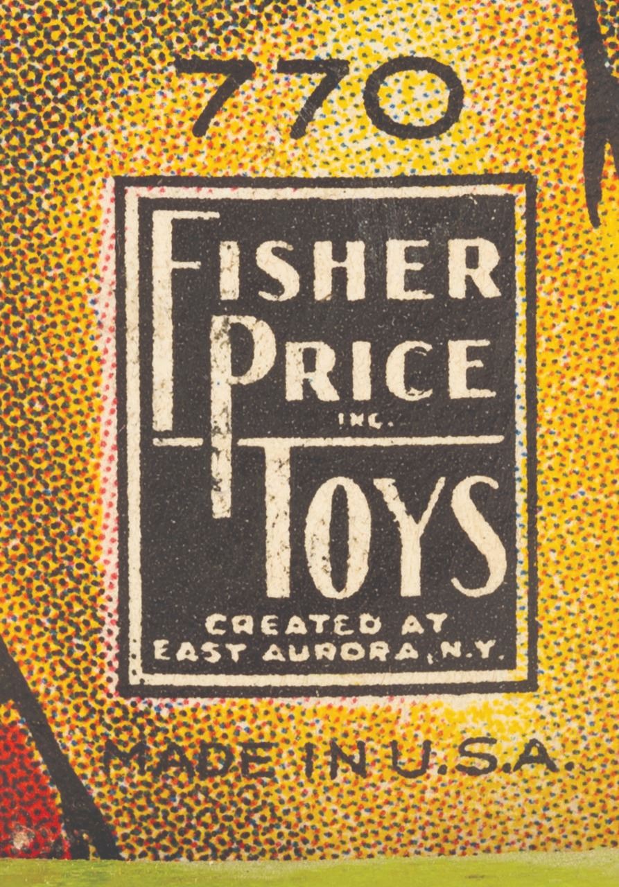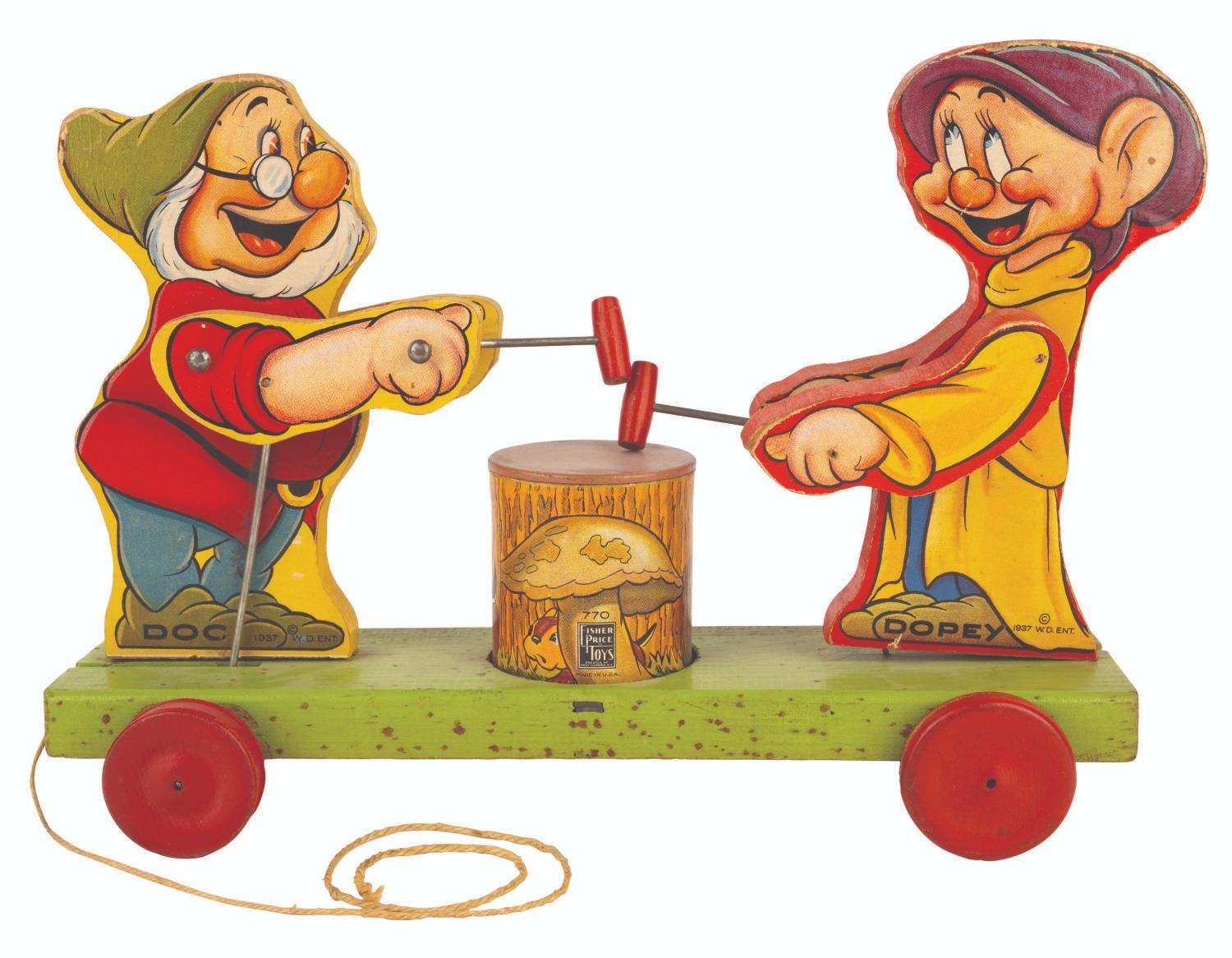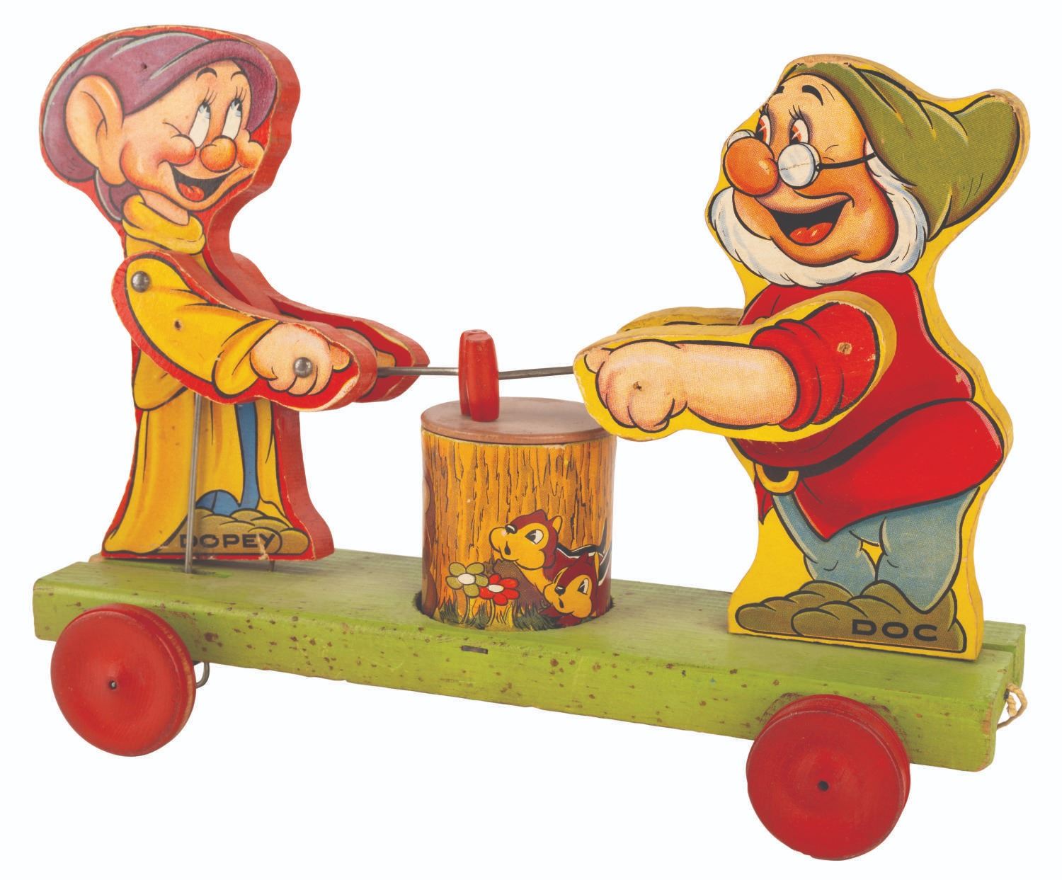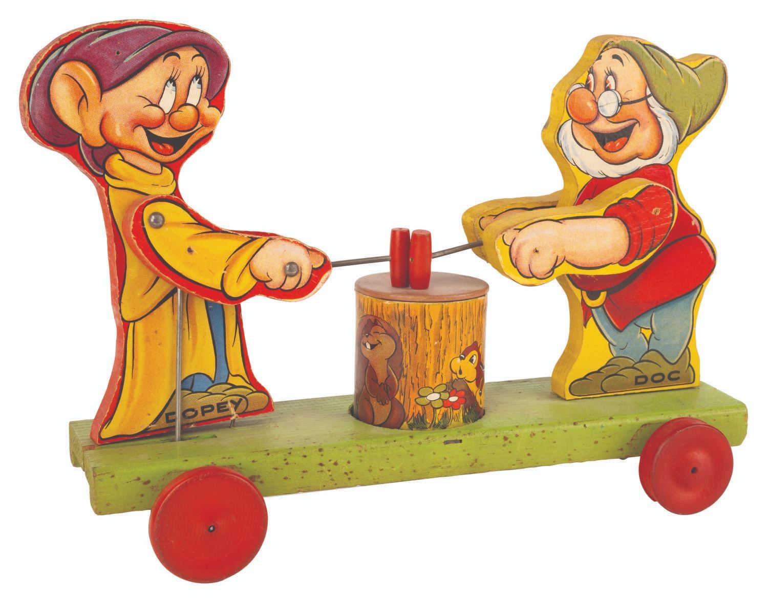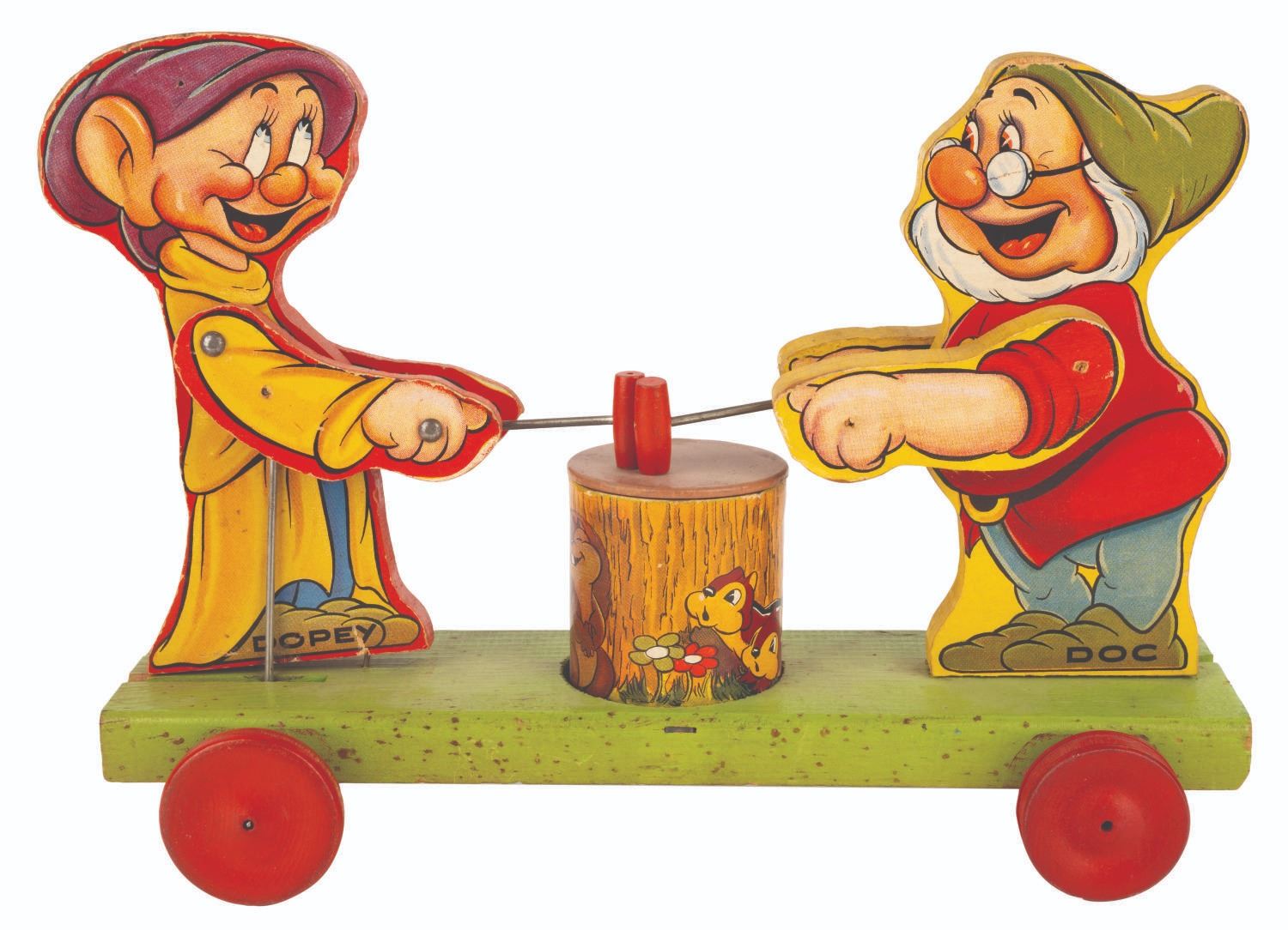 (Fisher-Price, 1938) A Doc & Dopey Dwarf #770 pull toy released by Fisher Price shortly after the release of "Snow White and the Seven Dwarfs." When pulled, Doc and Dopey take turns hitting the tree stump between them with mallets. Measuring 4" x 12" x 8" tall, the toy is in very good working condition with light wear from use considering the age, and some spotting of finish to the green base.