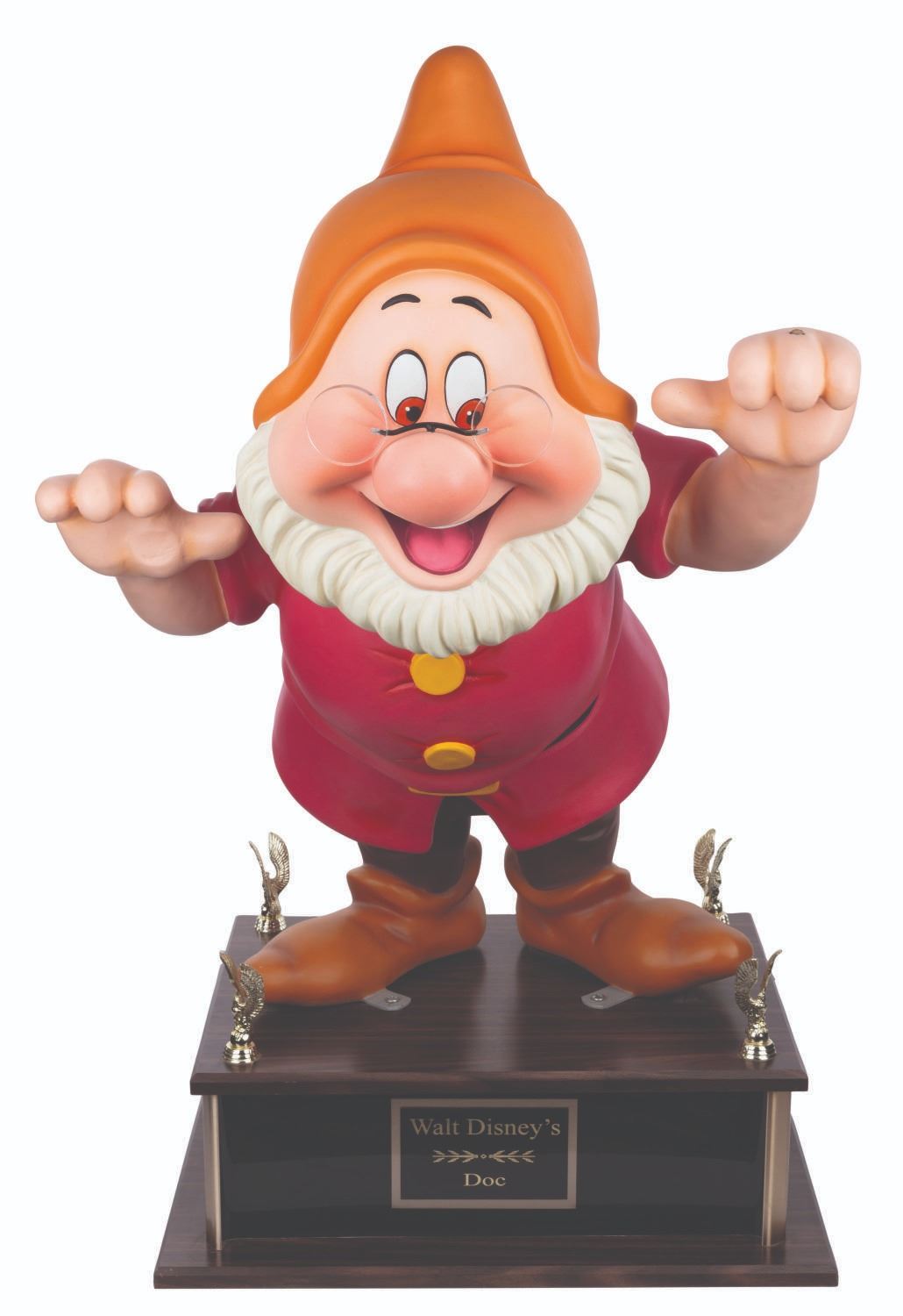 (Disney, 1987-2000s) An original fiberglass Disney Store display figure of Doc from “Snow White and the Seven Dwarfs.” Measuring 22” x 23” x 29” tall on a 20” x 7” x 16” deep custom base for a full height of 35”, the figure displays in very good condition with wear and scuffs, including a black scuff on the nose, and an intended hole in the left hand for display purposes. Due to size and weight, this item will require special shipping arrangements. Please inquire before bidding.