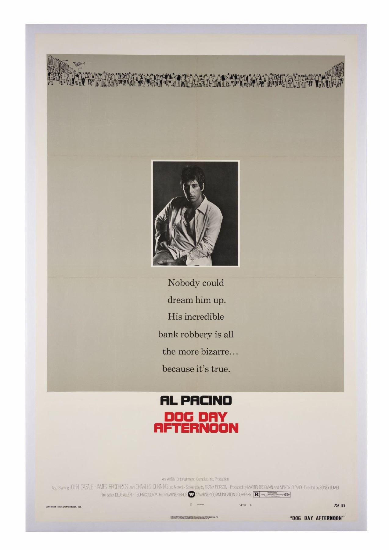 (Warner Bros., 1975) An original release one sheet poster for "Dog Day Afternoon" starring Al Pacino. Measuring 27"x41", the poster is linen backed and in good condition with some creasing and wear from being folded.