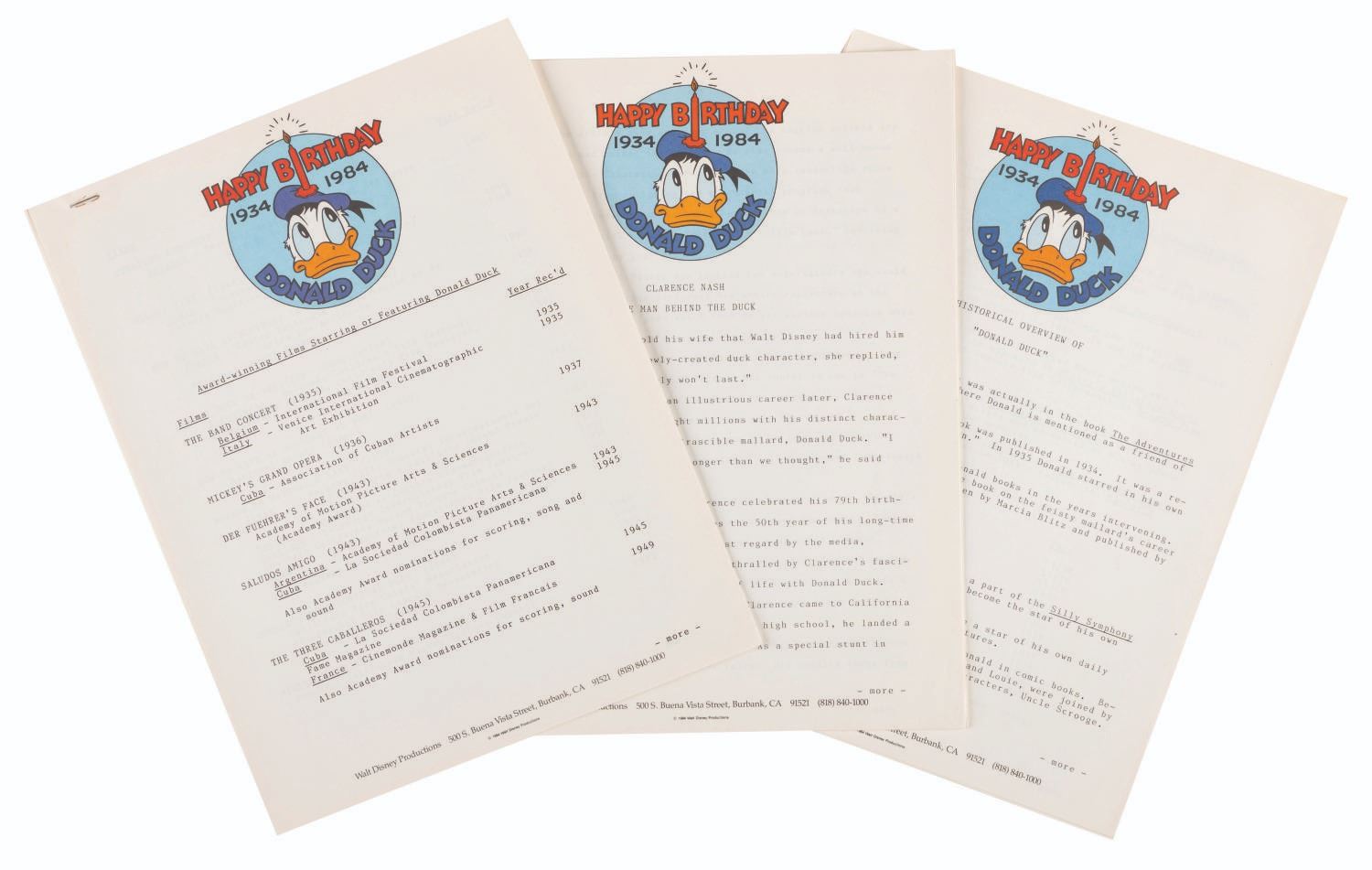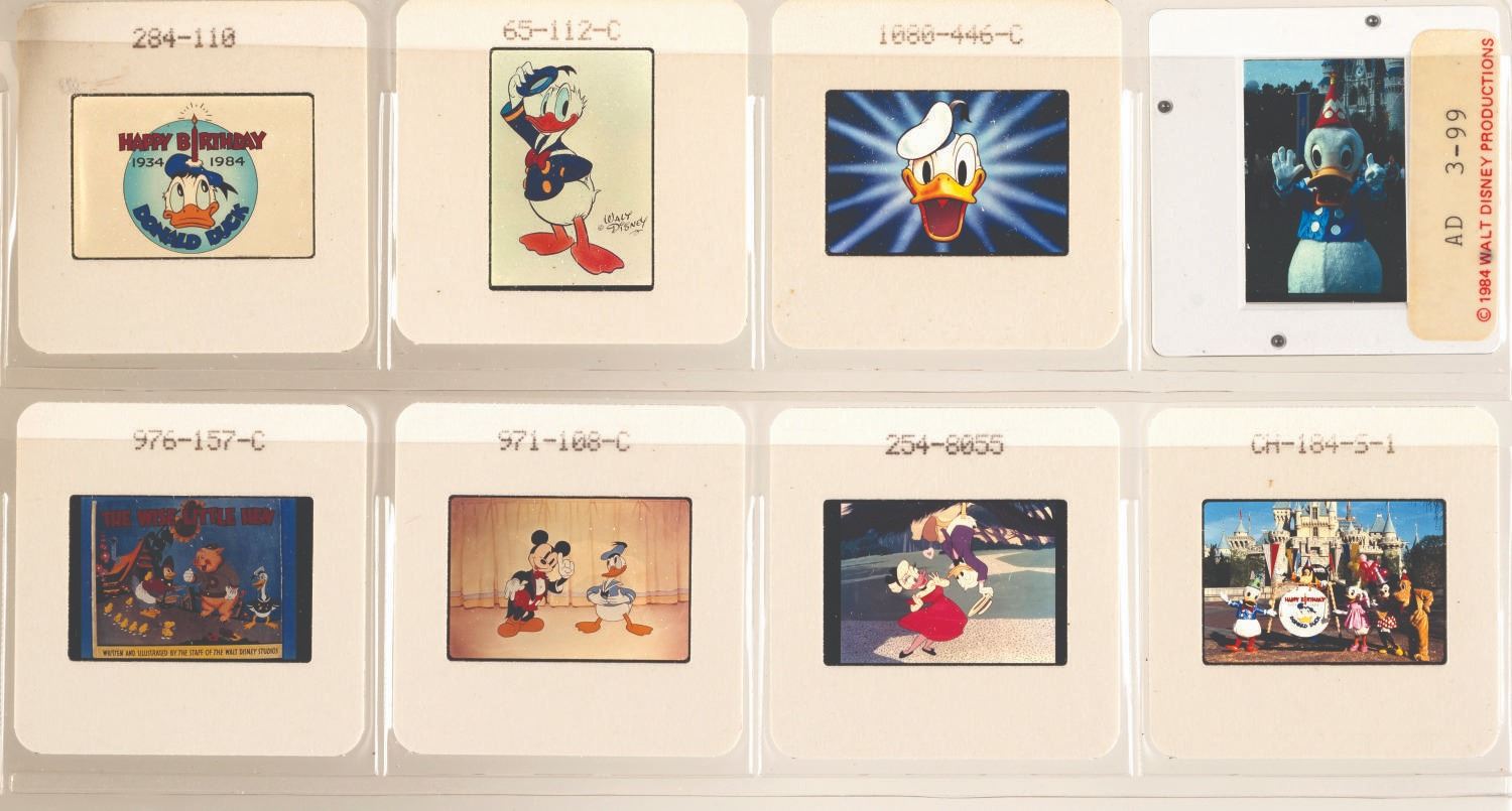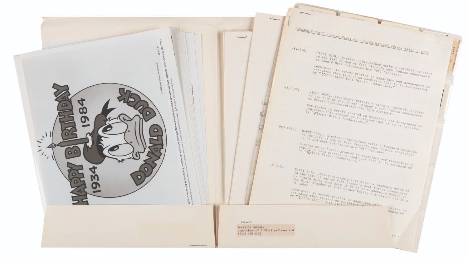(Disneyland, 1984) A Donald Duck's 50th birthday press kit, including eight color slides, nine 8” x 10” photographs, and five press releases documenting Donald’s career. Measuring up to 9"x12", the documents and folder are in very good condition with light creasing, edge wear, and discoloration from age and handling. The slides and photographs are in fine condition.