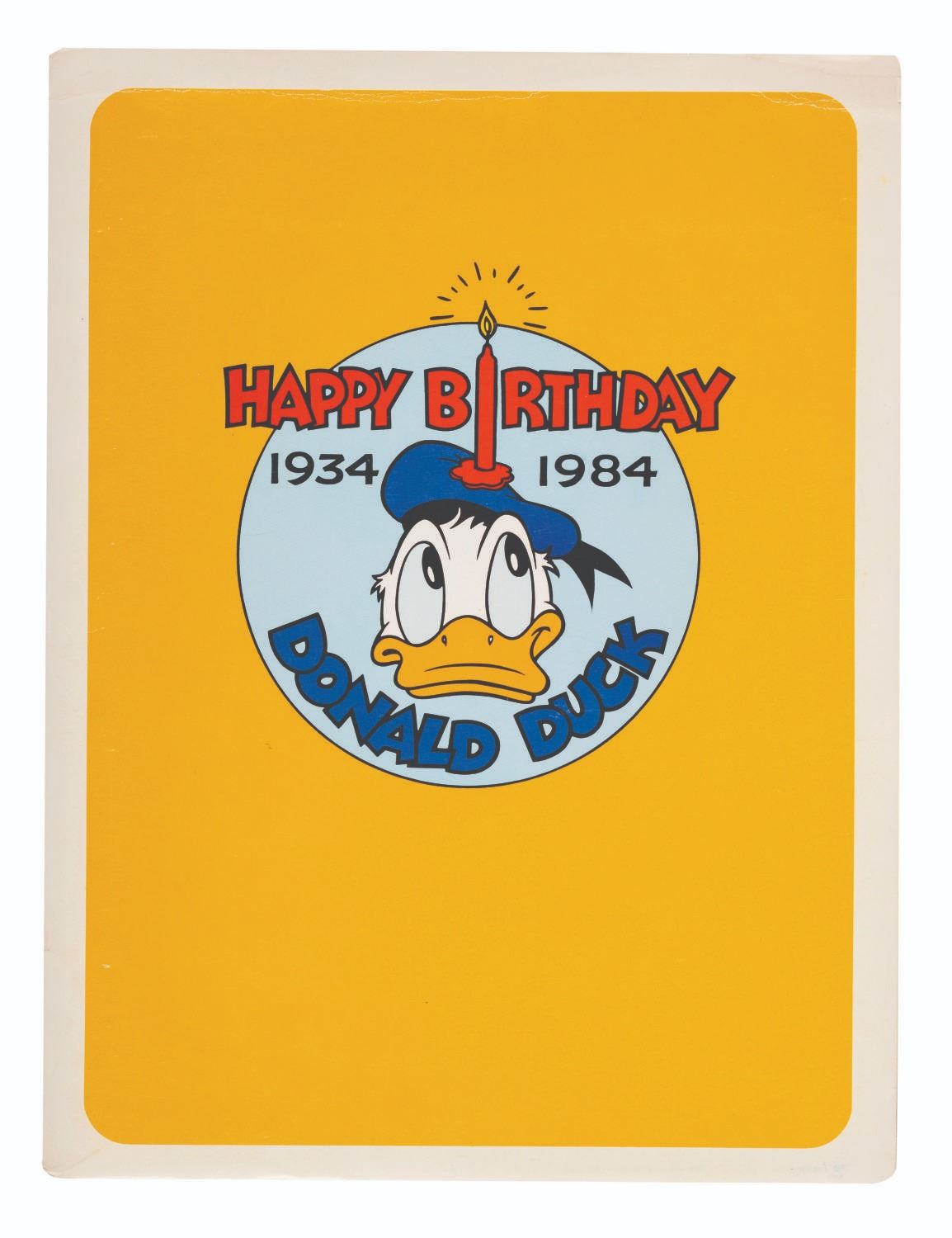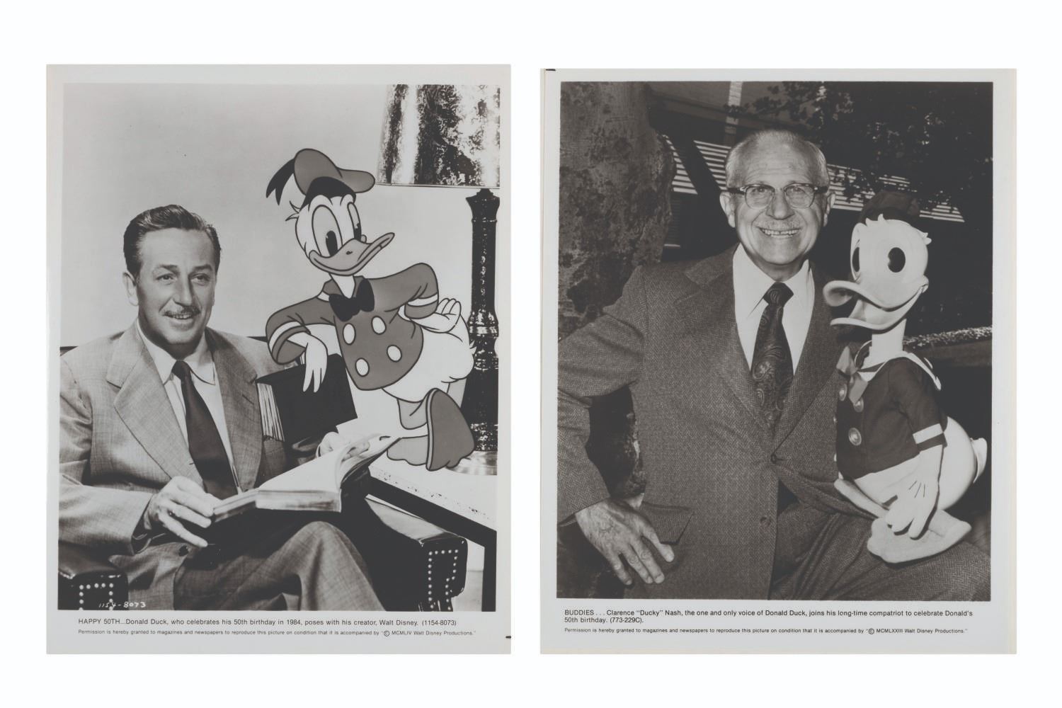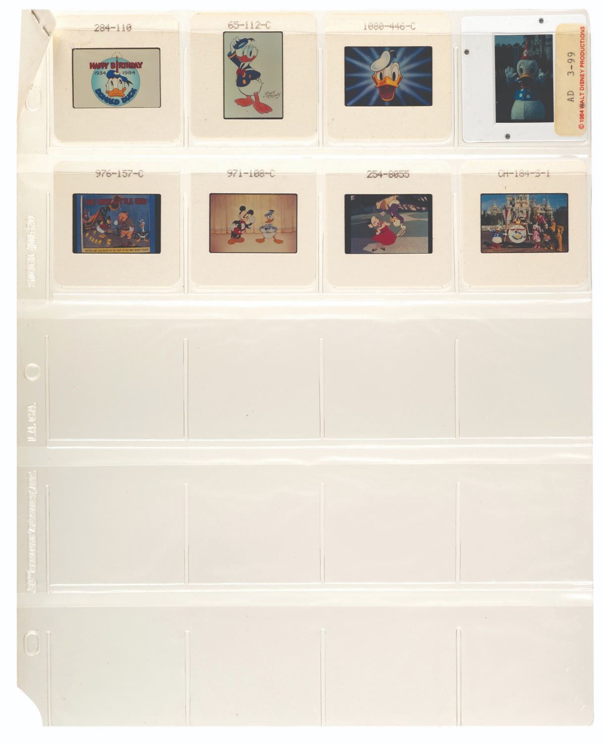(Disneyland, 1984) A Donald Duck's 50th birthday press kit, including eight color slides, nine 8” x 10” photographs, and five press releases documenting Donald’s career. Measuring up to 9"x12", the documents and folder are in very good condition with light creasing, edge wear, and discoloration from age and handling. The slides and photographs are in fine condition.