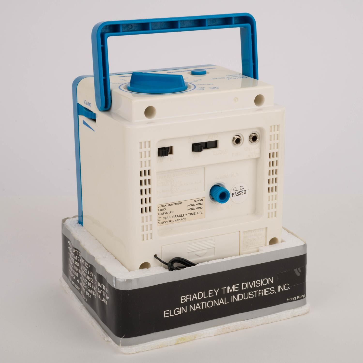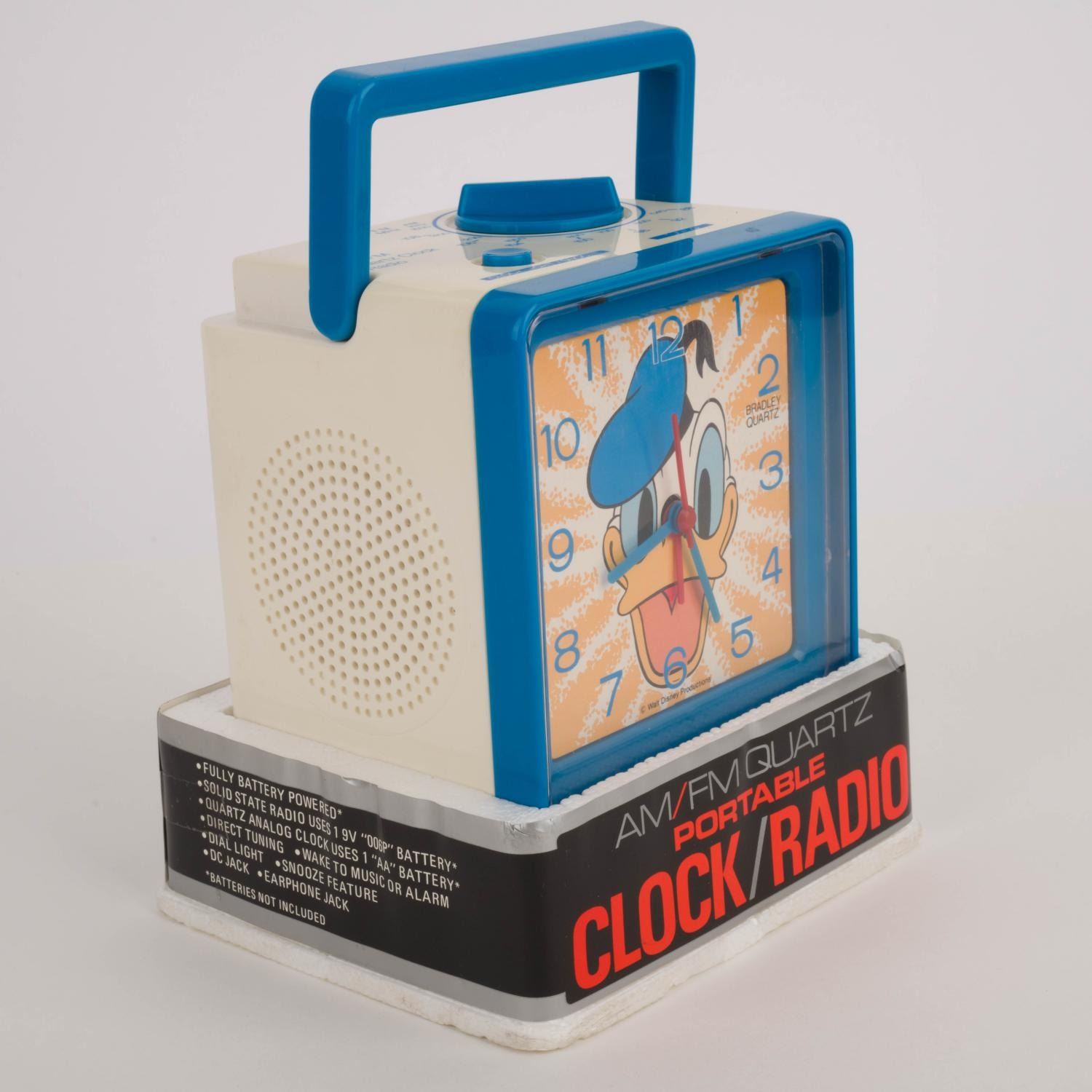 (Bradley Time, 1980s) A vintage Donald Duck alarm clock. Featuring the often ill-tempered Duck looking particularly jovial, the AM/FM alarm clock radio measures 4.5" x 4" and 4.5" tall. The clock is in very good untested condition, in the original packaging, which measures 5.5" x 5" and 6.5" tall. The packaging is in good condition with discoloration and other age-related wear.