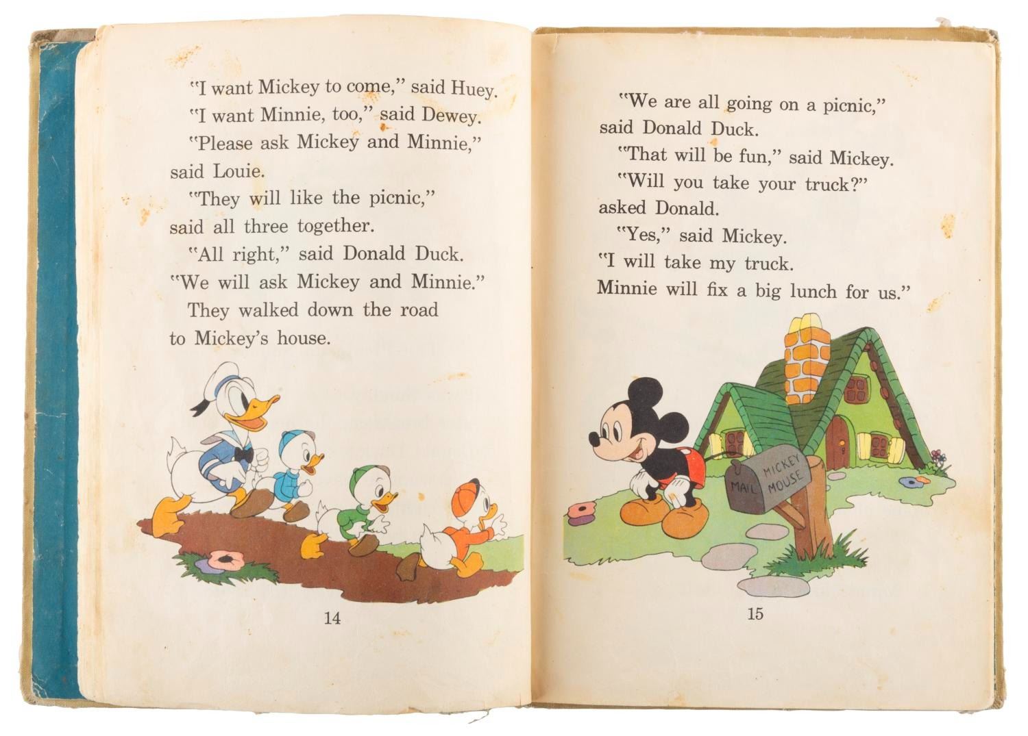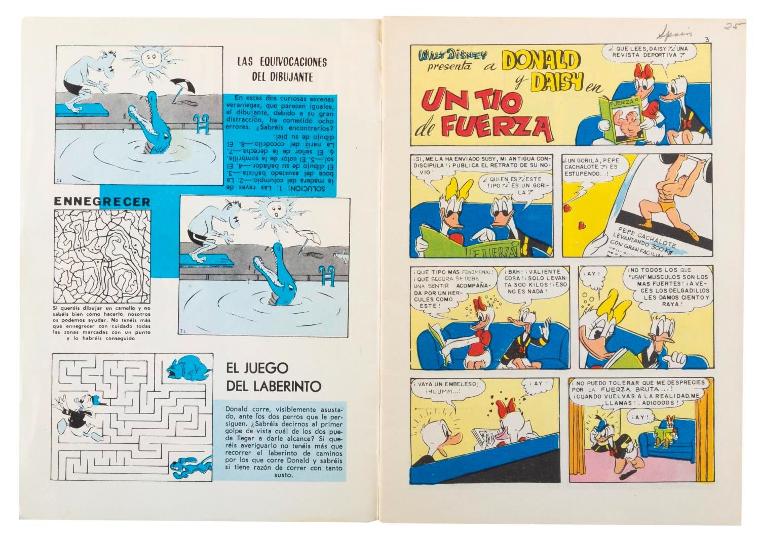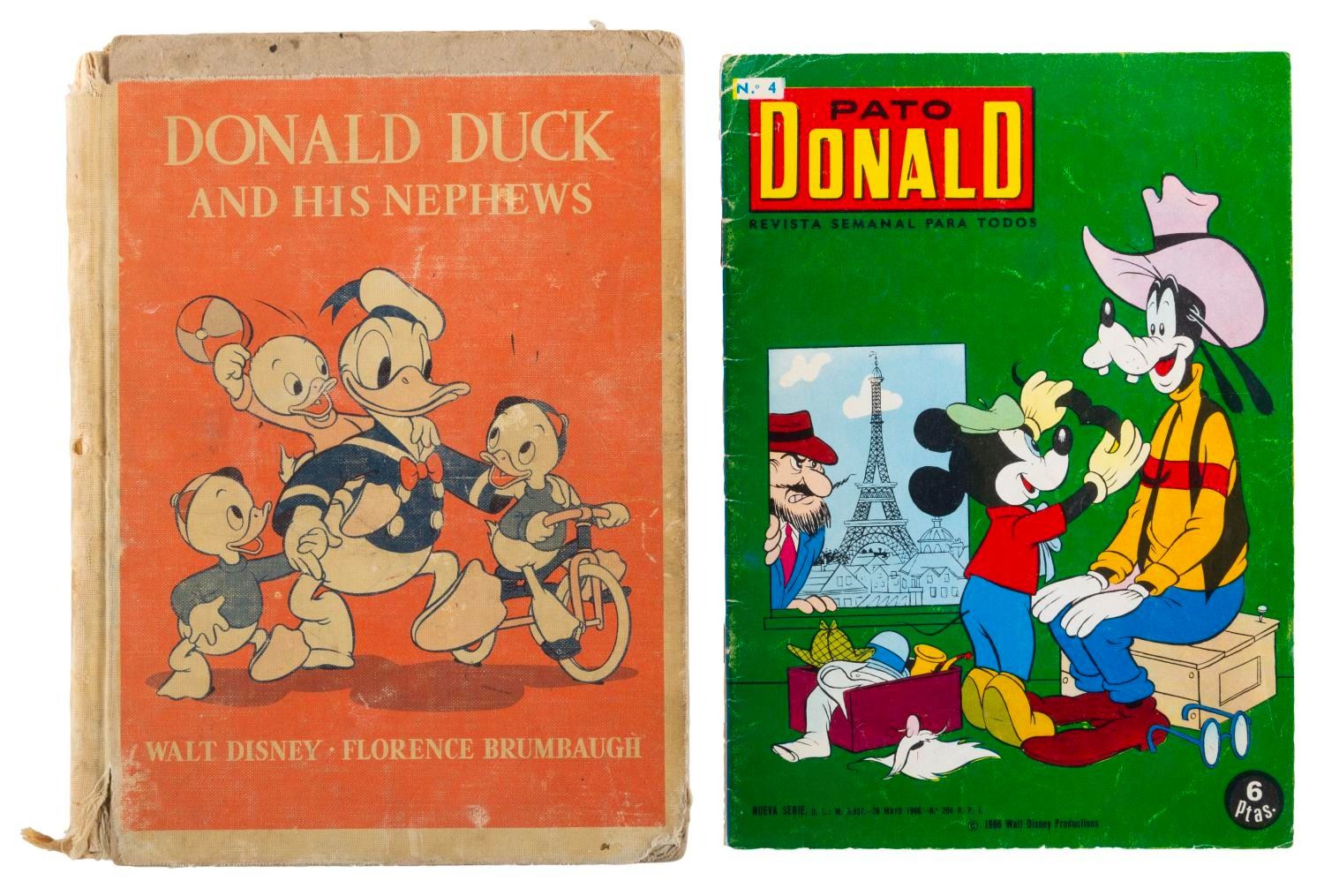 (Heath/Disney, 1940/66) A 1940s Donald and His Nephews storybook published by Heath, and a Spanish-language Donald Duck comic from 1966. Measuring 6.25” x 8.5” and 6” x 8.5” respectively, the book and comic are in fair to good condition with heavy edge wear, tear, and creases to both, and heavy fraying, torn binding and pages, stains, and writing in ink and colored pencil to the book.