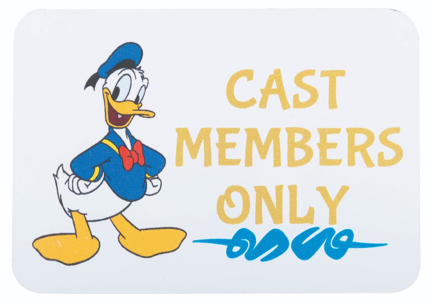 (Disney Parks, 2000s) A Cast Member's Only sign featuring an unusually happy Donald Duck, used to designate areas that are closed to park Guests. Measuring 7” x 10”, the metal plate sign is in very good condition with one slightly bent corner, light scuffing, and adhesive residue.