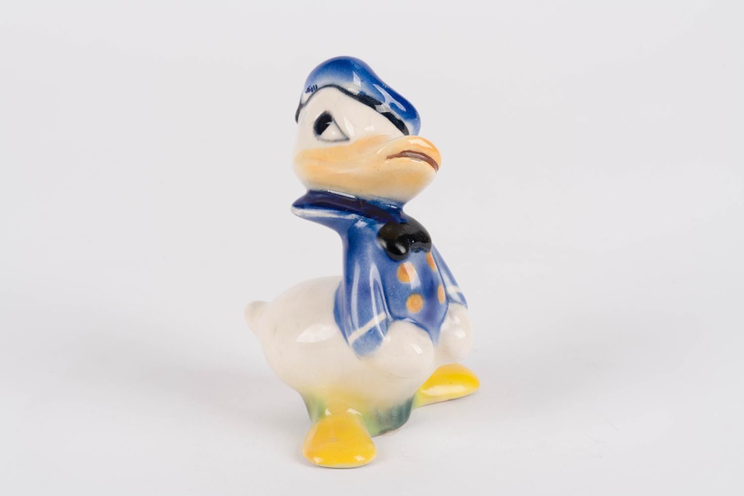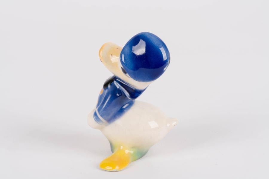 (Shaw, 1940s) A painted glazed ceramic figurine of Donald Duck by Shaw Pottery. Measuring 3" x 3.25" and 4.25" tall, the ceramic is in good condition with crazing and light wear from age.
