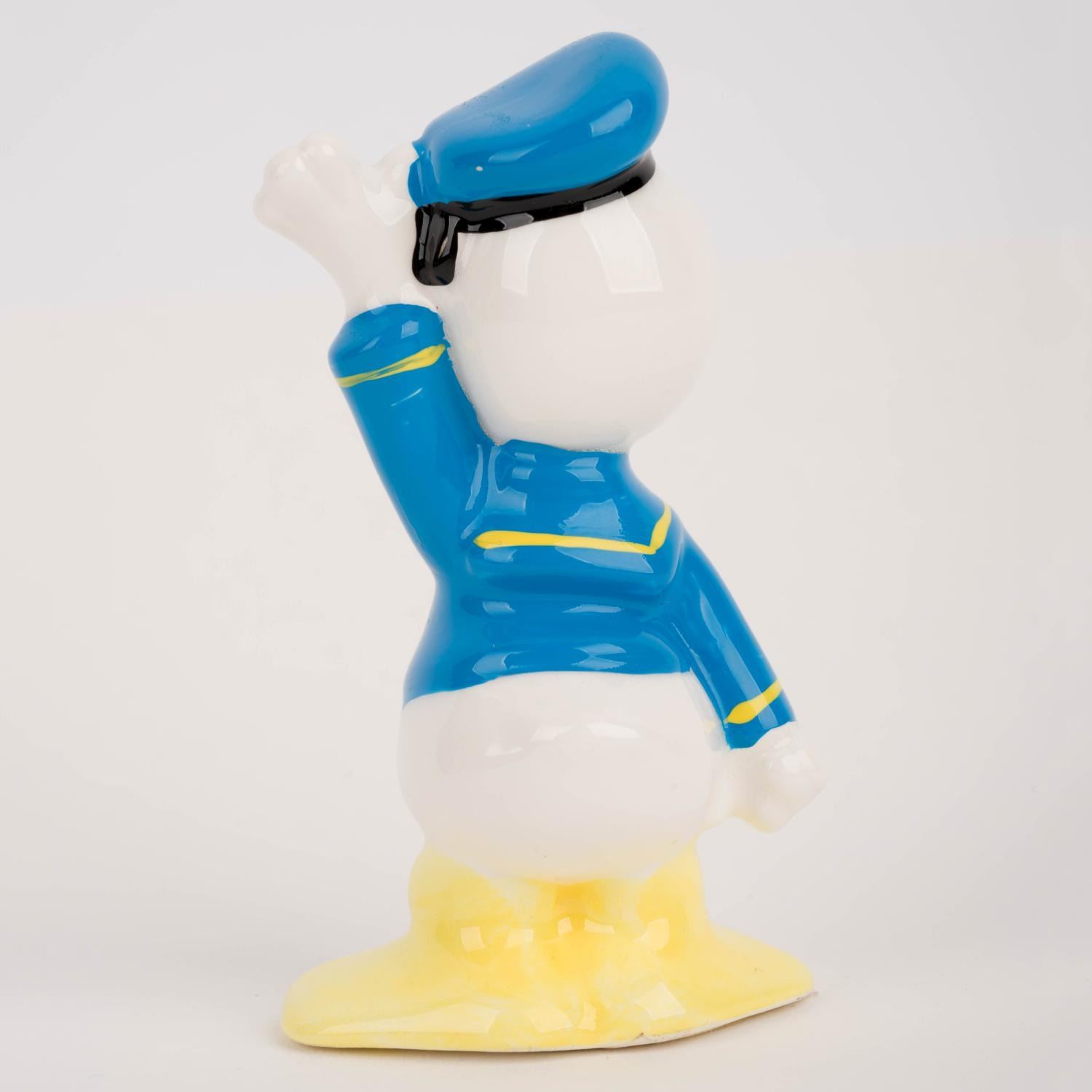 (Disney, 1985) A ceramic figurine of Donald Duck. Featuring the hot-headed Donald looking particularly jovial, the figurine was sold at the Disney Parks in the mid-1980s. Standing 3" tall, the figurine is in very good condition with a tiny white spot at the front of his blue cap.