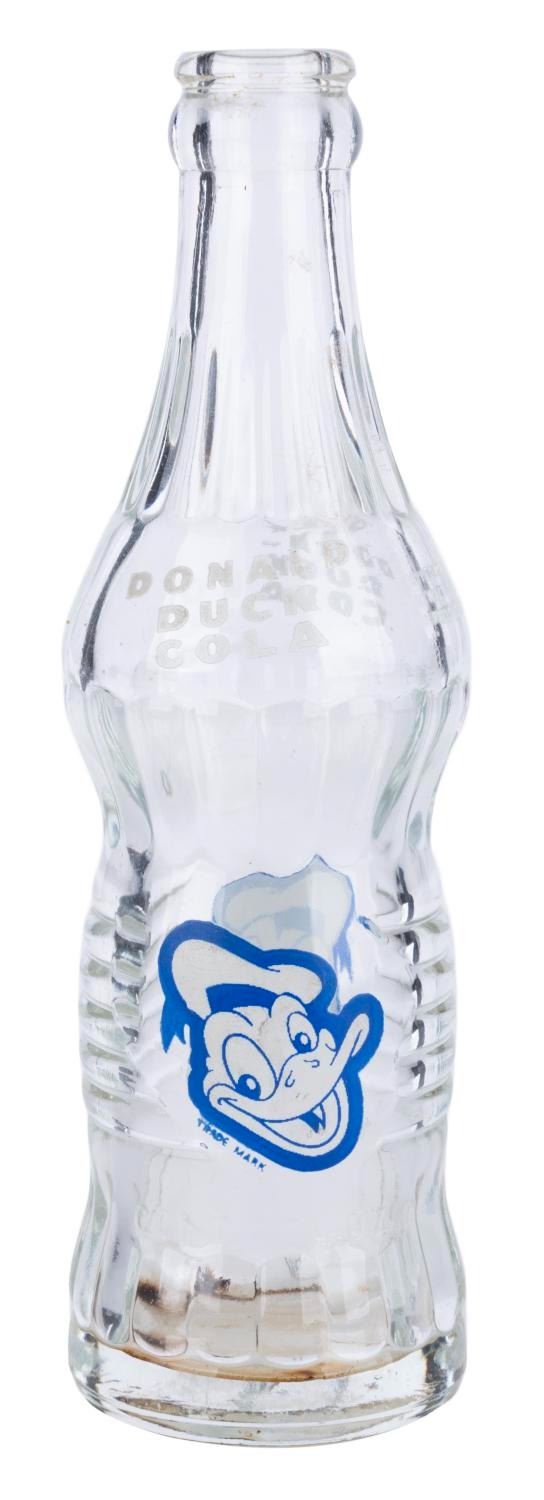 (Commercial Beverage Co.,1940s/50s) A Donald Duck Cola Bottle. Measuring 8” tall, this bottle is in very good condition, with minor staining to the interior of the glass.