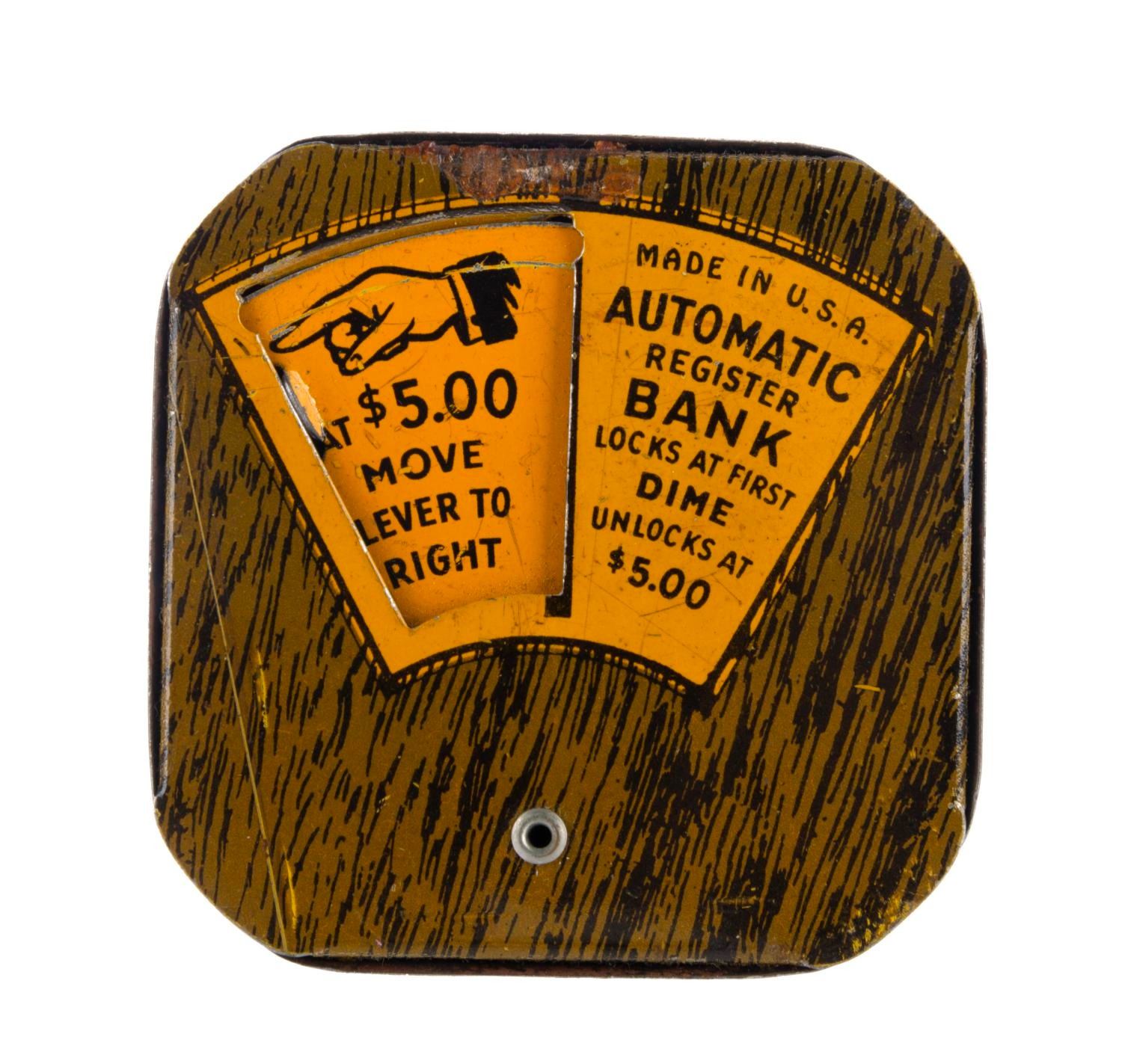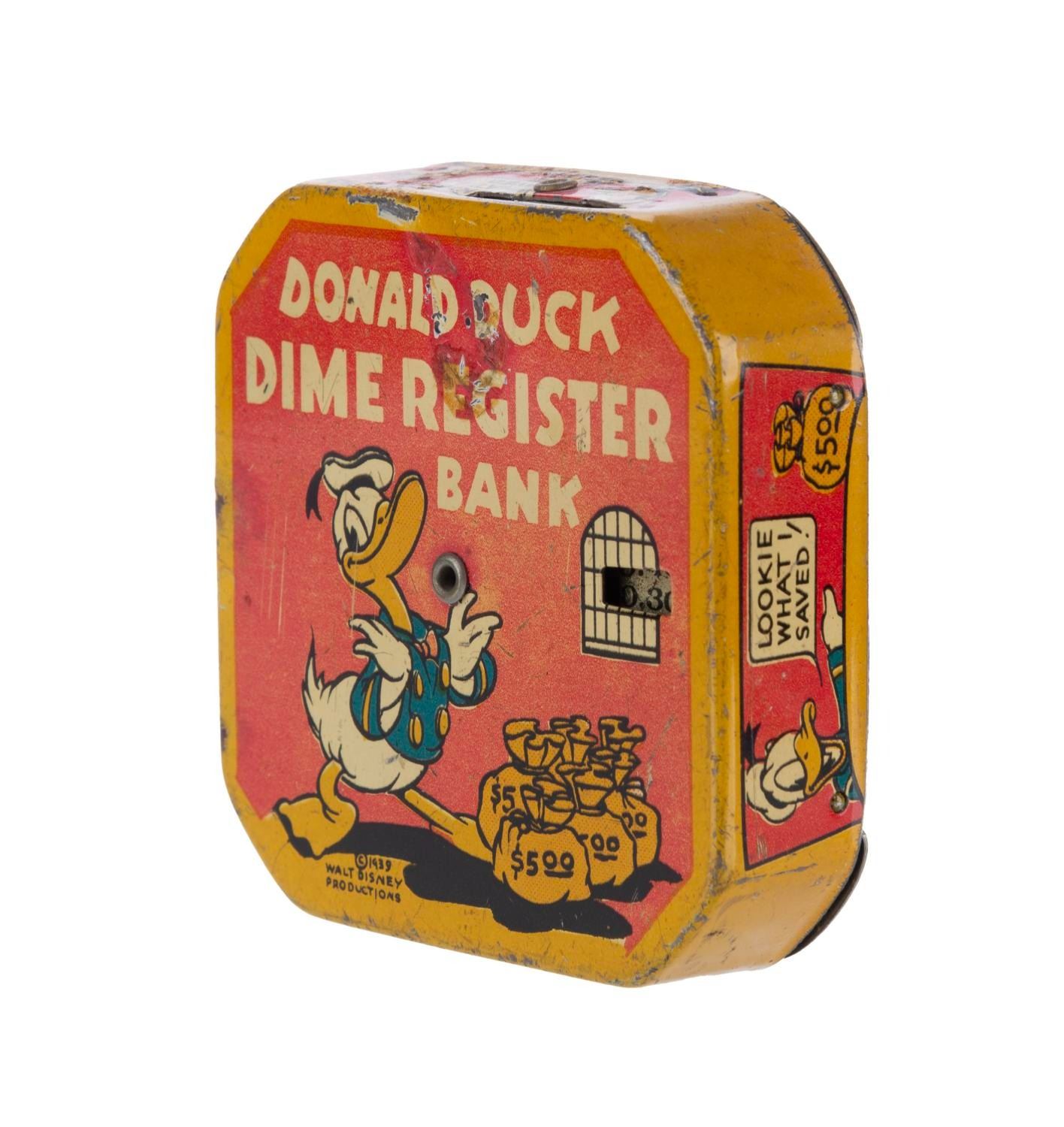 (Disney, 1939) A tin-litho Donald Duck Dime Register Bank. An embedded reel counter tallies the dimes inserted, and the bank can only be opened once $5.00 is saved. Measuring 2.5"x2.5" x.5", this piece is in good condition with surface wear, oxidation, and minor residue retention to its tin-lithographic elements.