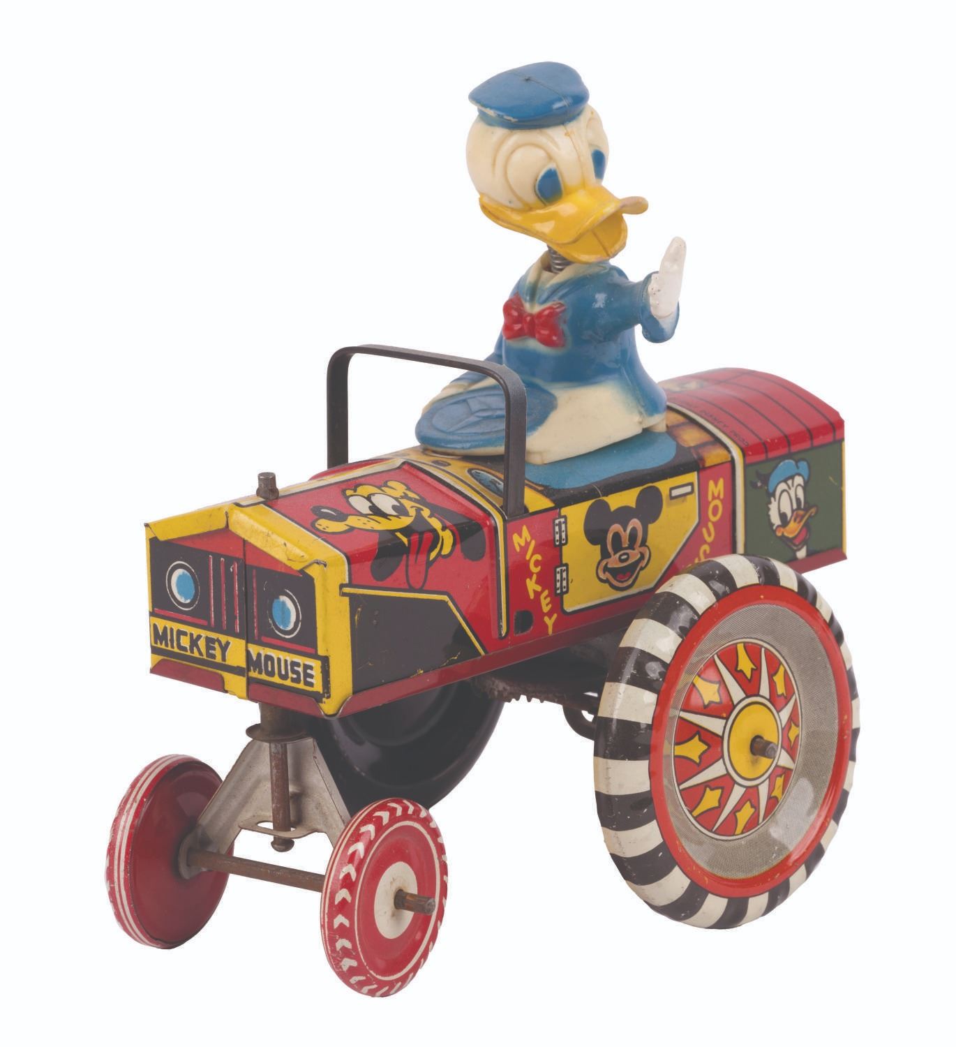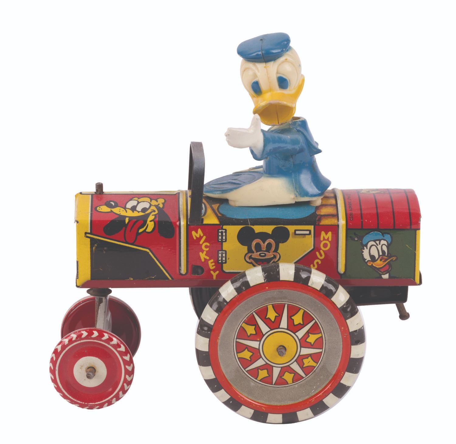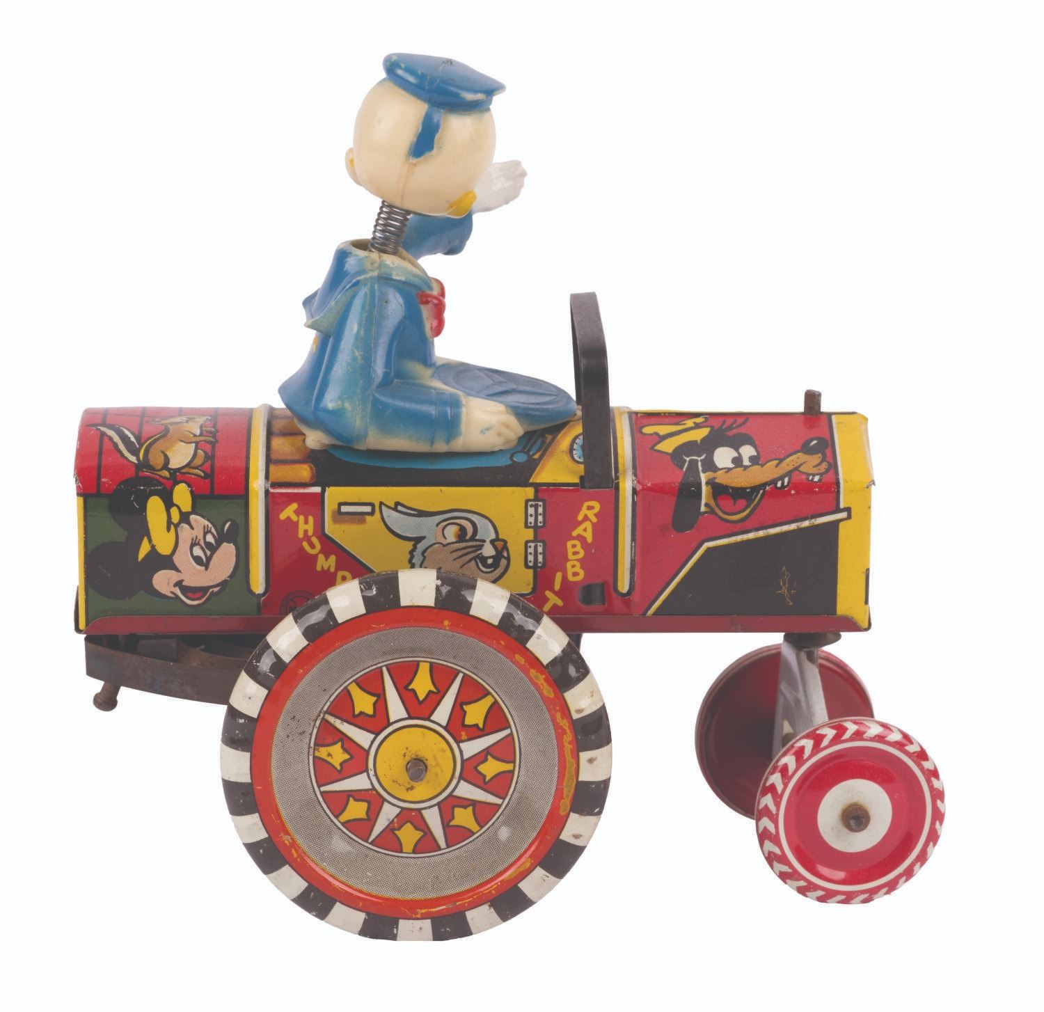 (LineMar, 1950s) A Disney Dipsy Car featuring tin-litho imagery of Disney characters with a plastic-headed Donald Duck at the wheel. Measuring 3.5" x 5.5" x 6" tall, the toy is in good working condition with light scuffs and scratches, and light oxidation to unpainted metal elements.