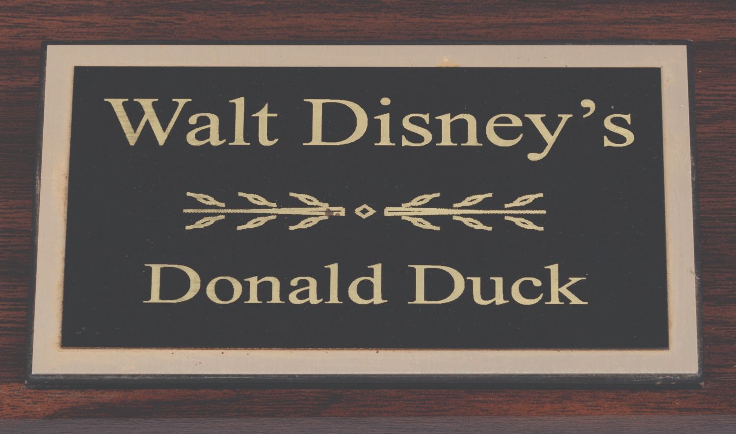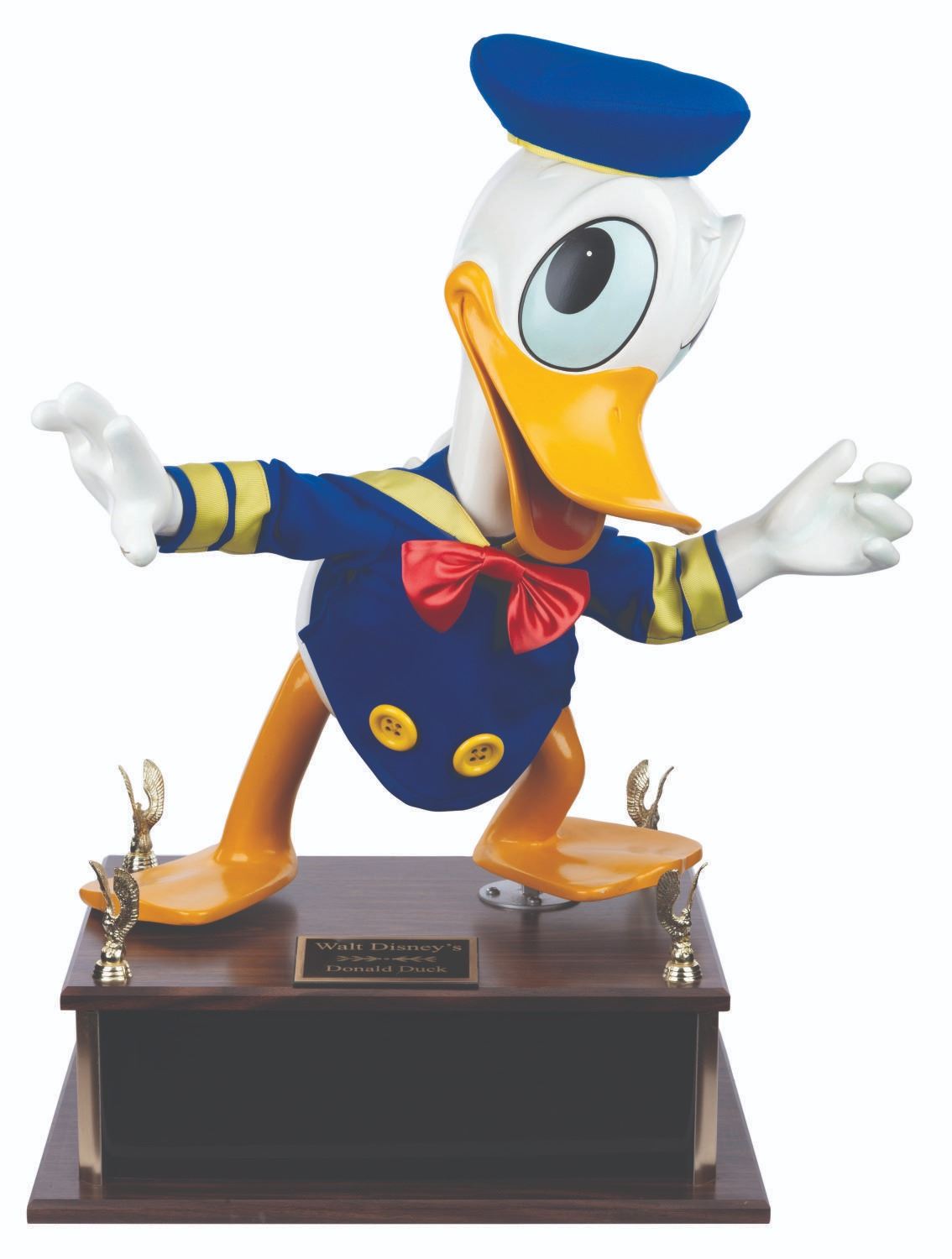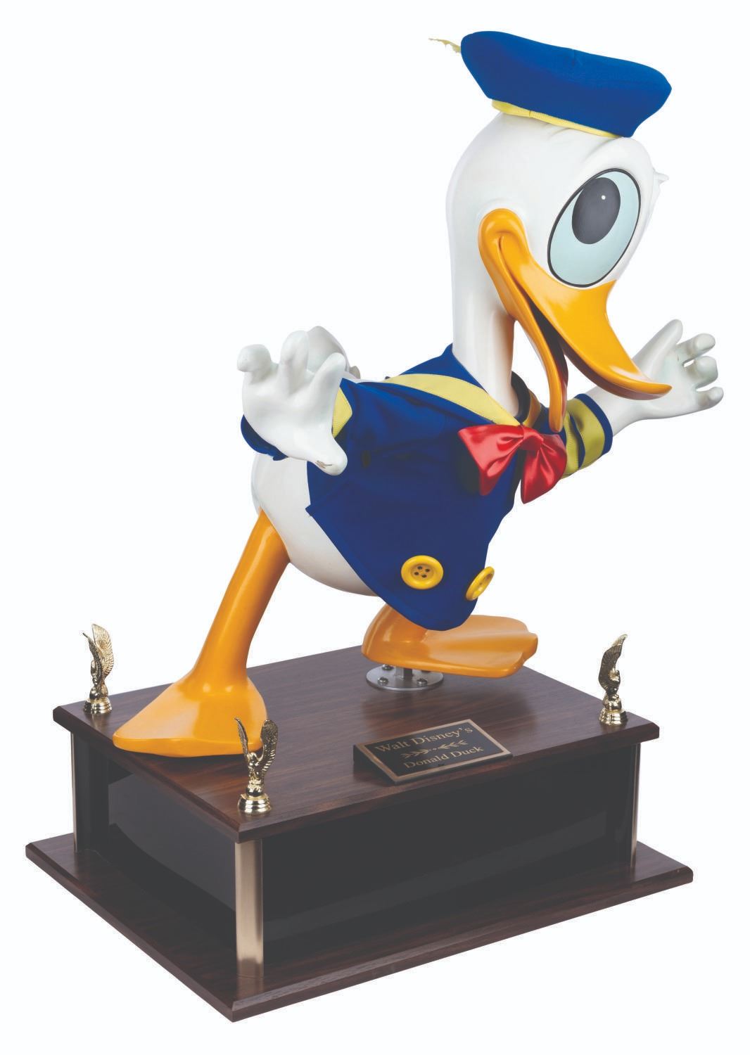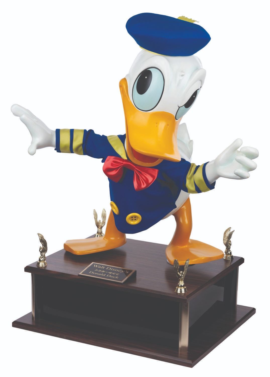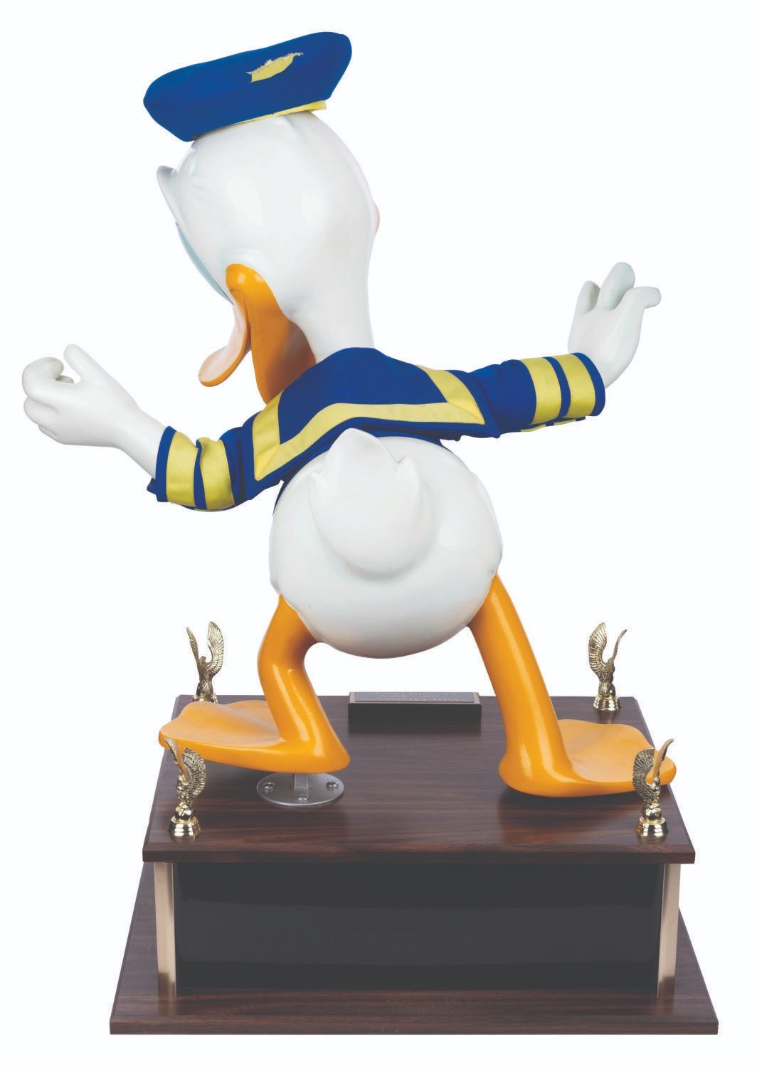(Disney, 1987-2000s) An original Disney Store display figure of Donald Duck with fabric clothing and a removable felt hat. Measuring 16” x 23” x 25” tall on a 20” x 7” x 16” deep custom base for a full height of 31”, the fiberglass figure displays in very good condition with light wear, frays on the hat ribbon, and heavy scuffs, notably on the hands. Due to size and weight, this item will require special shipping arrangements. Please inquire before bidding.