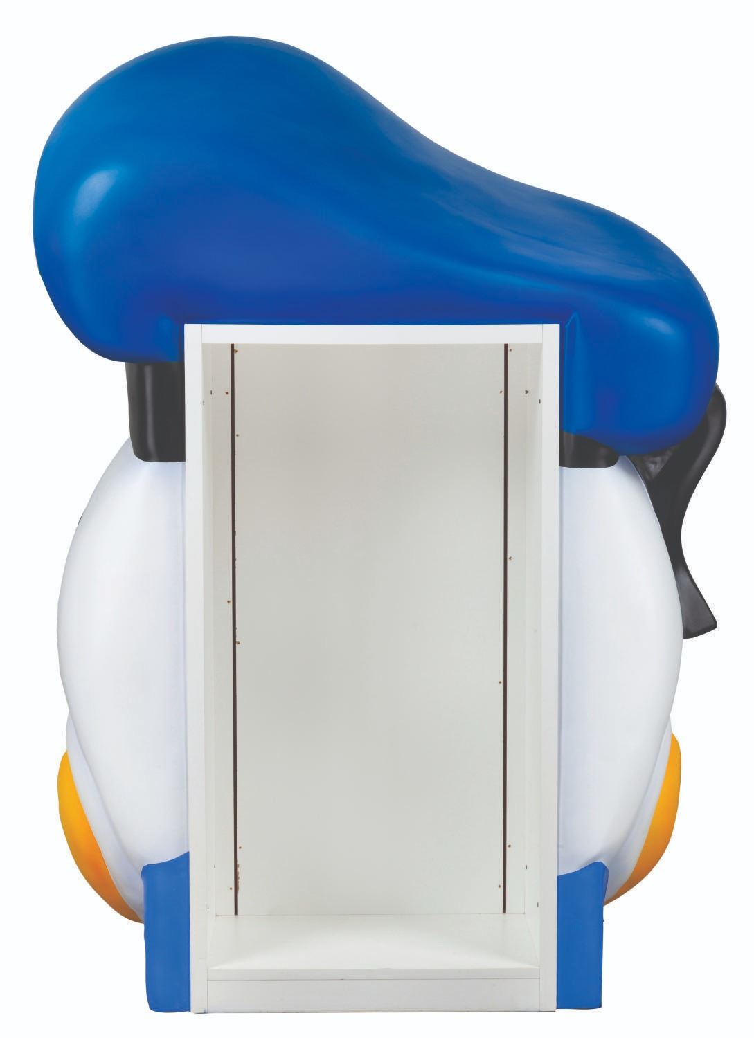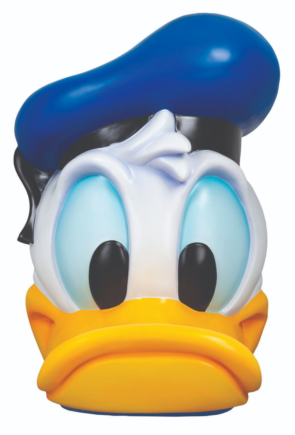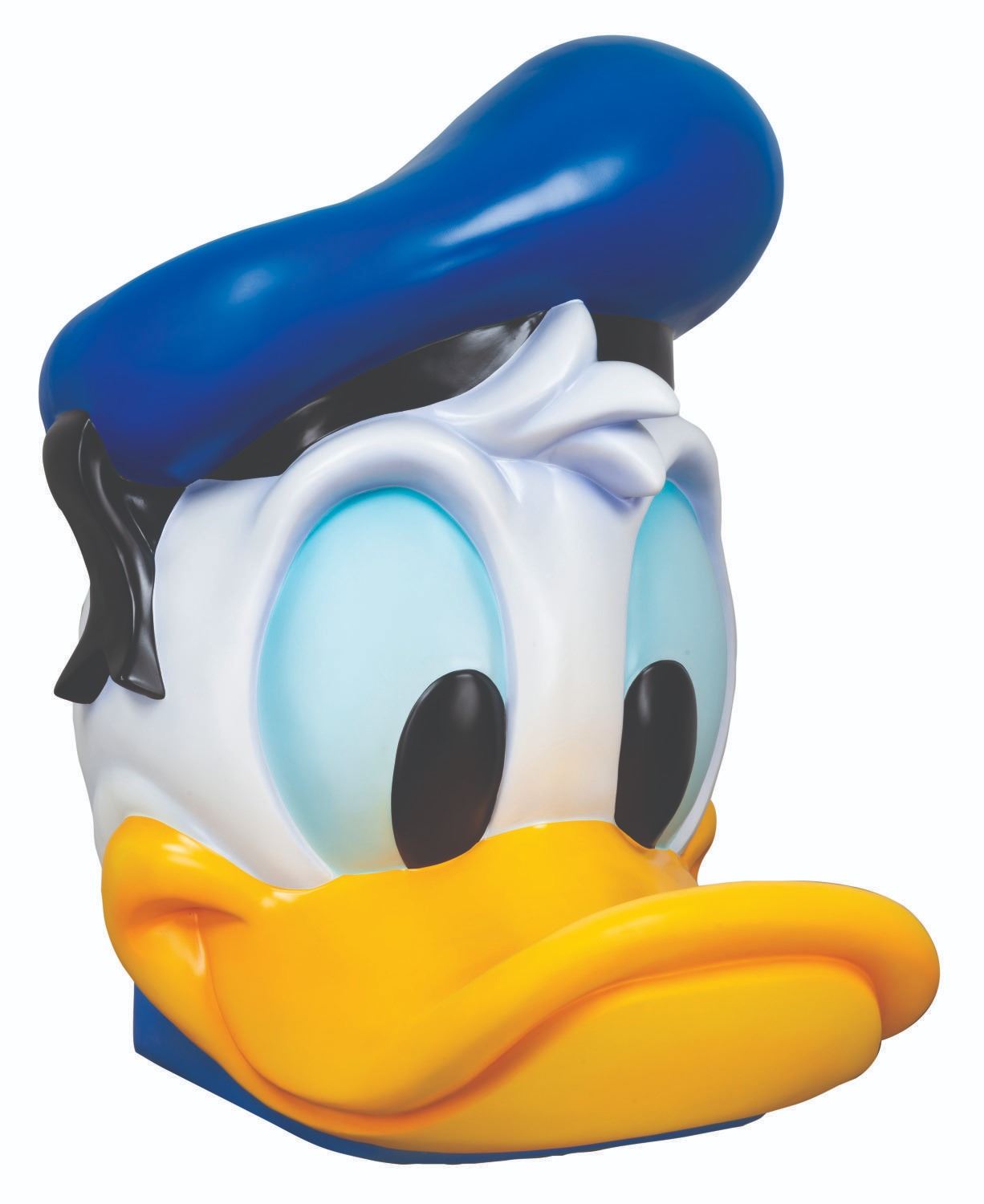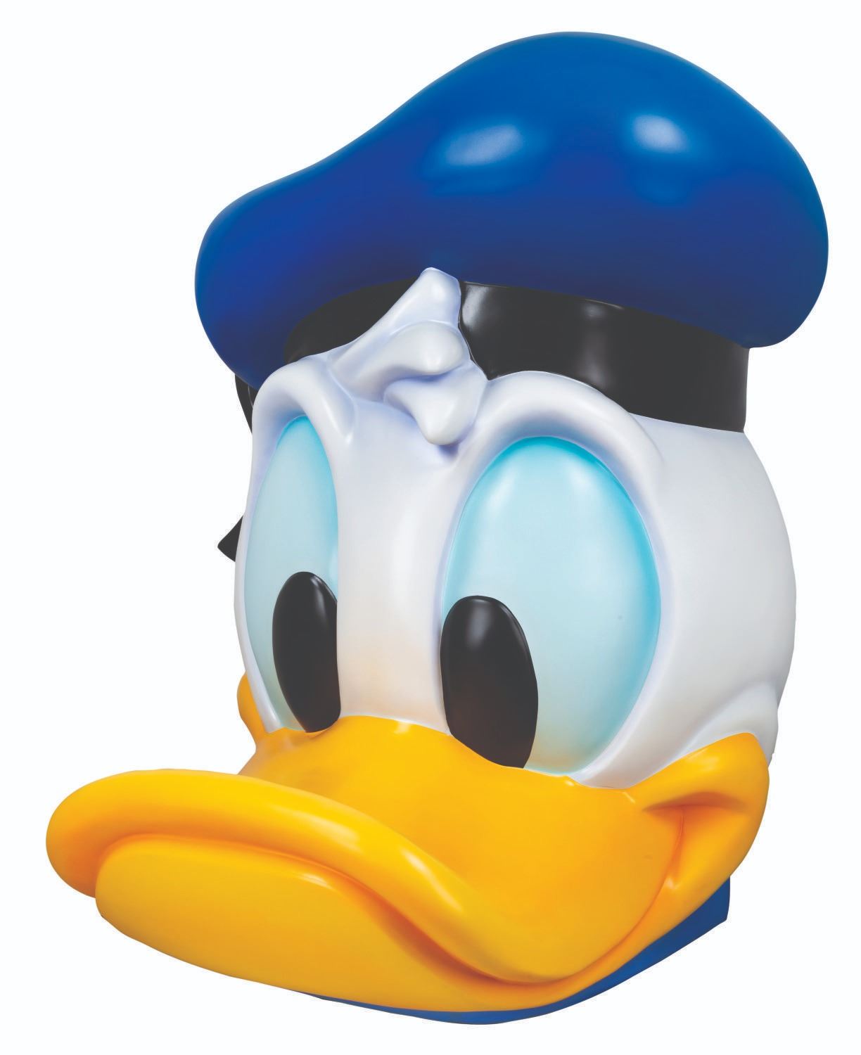 (Disney, 2005-2007) A gigantic Disney Store merchandise display in the shape of Donald Duck's head. Manufactured by Tivoli Too, this over 6-foot tall piece was made during the period when The Children's Place owned Disney Stores. The reverse of Donald's head features ample space to install shelving, making it both a stylish and practical accent piece for every Disney collection. Measuring 44" x 49" x 67" tall, the figure is in very good condition with light soiling from storage and wear to the shelving area from a previous configuration. Due to size and weight, special shipping arrangements are required. Please inquire before bidding.