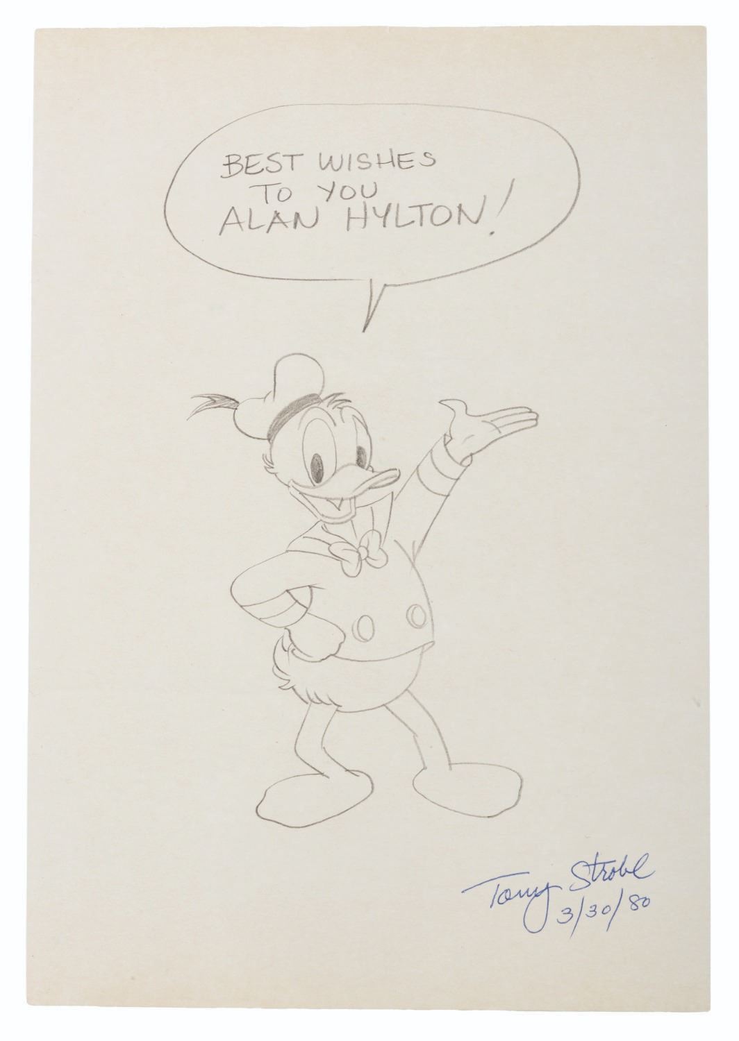 (Strobl, 1980) A Donald Duck drawing accomplished in pencil and signed in blue ink by Disney comic artist Tony Strobl. With a character image size of 4” x 5.25” on a 7.5” x 11” piece of paper, the art is in very good condition with light wear and folds from mailing.