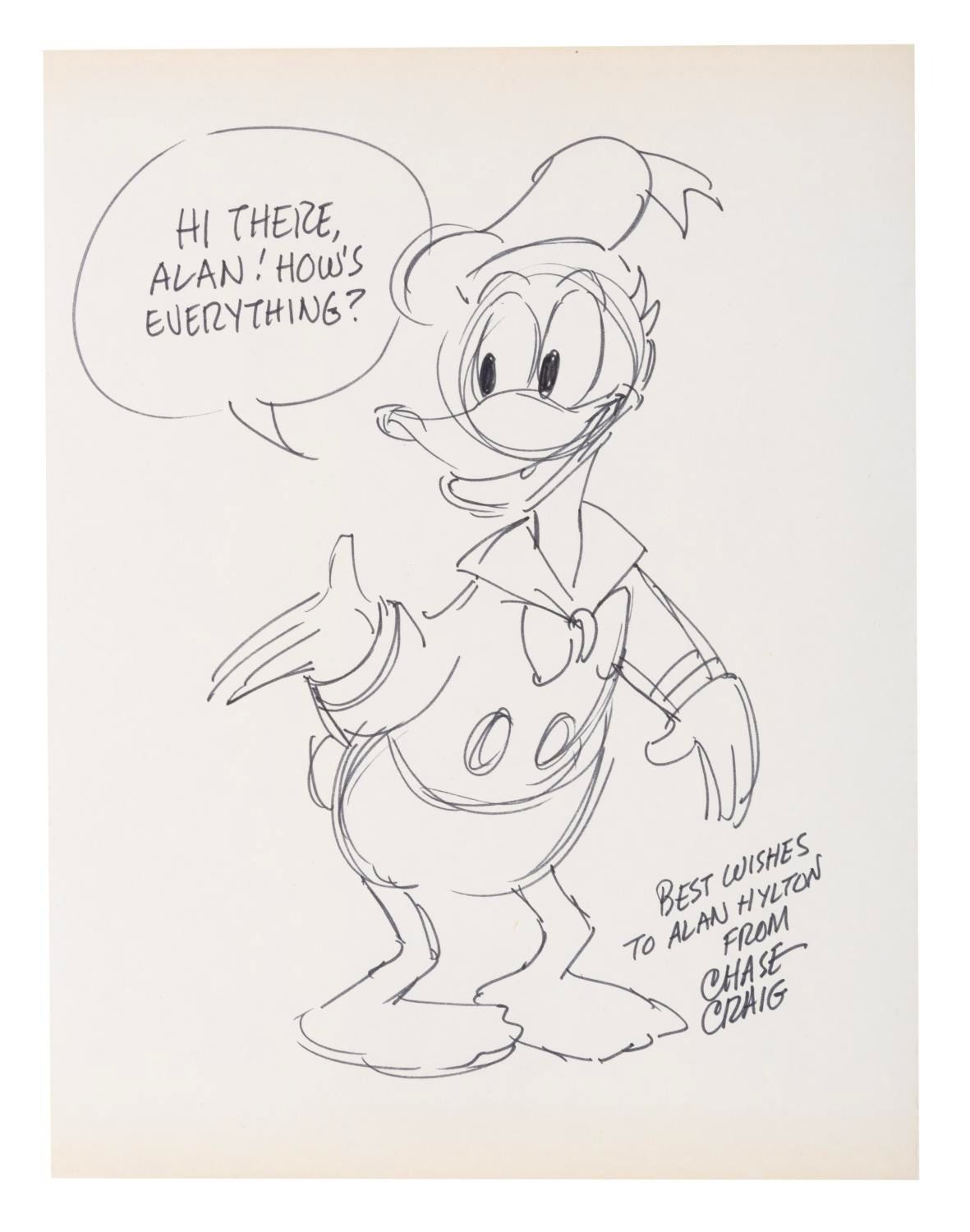 (Craig, 1970s-80s) A drawing in ink of Donald Duck by writer and cartoonist Chase Craig, signed with a dedication to Alan. Craig is known as writer and editor for Disney Dell and Gold Key comic books, including serving as Carl Bark's last and longest-serving editor. Measuring 11” x 8.5”, the drawing is in very good condition with two very light horizontal creases from being mailed.