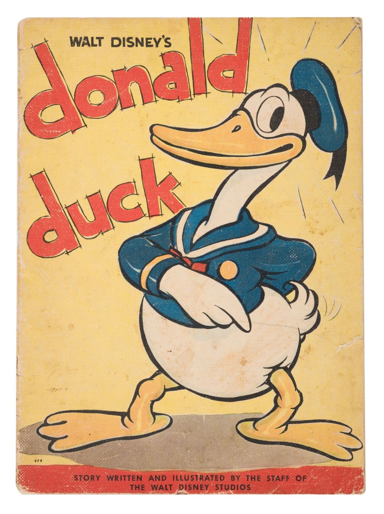 (Whitman, 1935) A Donald Duck Linen-Like Book by Whitman Publishing. The "Walt Disney’s Donald Duck Book" was manufactured of durable "linen-like" material and is a perfect example of the work being produced during Kay Kaymen's outstanding tenure as Merchandise Director for Walt Disney. Measuring 12.5” x 10, the book is in fair condition, with spots of discoloration, a 1" tear to cover and 4" split cover spine, and wear to edges and corners from use.