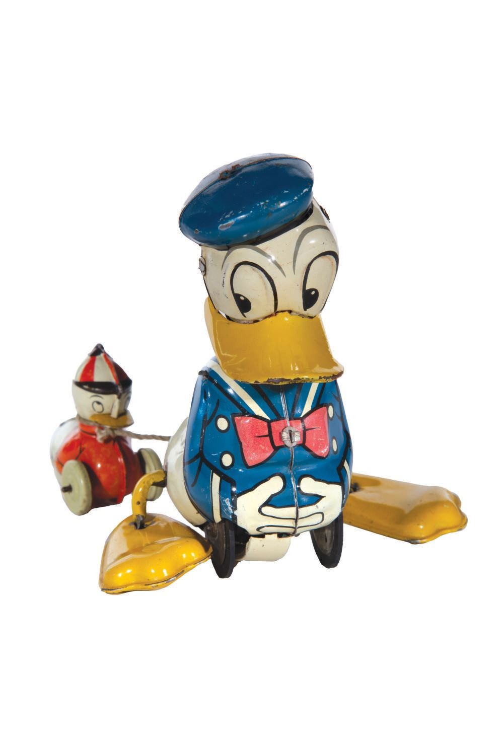 (Linemar, 1960s) A Donald Duck and nephew friction tin toy by Linemar. When rolled backwards and released, Donald waddles forward quacking while pulling his nephew behind. Tested for function, the toy does work. Measuring 5"x6.5"x5" high, the toy is in good condition with spots of wear, and small spots of oxidation particularly inside the bill.