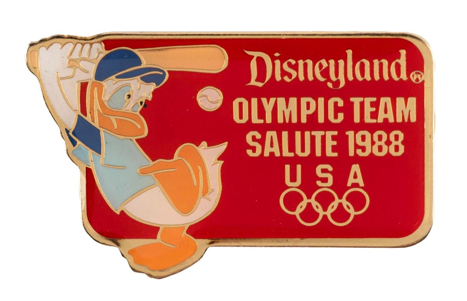 (Disneyland, 1988) A Disneyland Olympic Team Salute 1988 pin, featuring Donald Duck playing baseball. Measuring 1.5” wide, the pin is in very good condition.