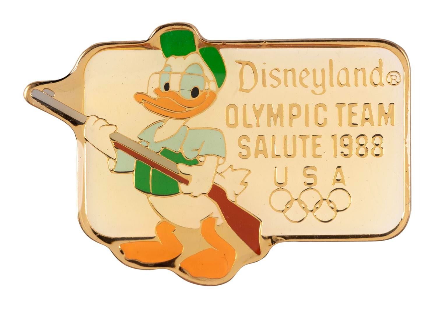 (Disneyland, 1988) A Disneyland Olympic Team Salute 1988 pin featuring Donald Duck competing in shooting. Measuring 1.25" wide, the pin is in very good condition with color shift from age.