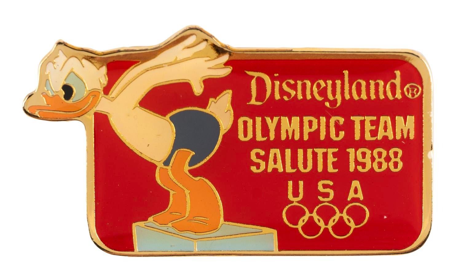 (Disneyland, 1988) A Disneyland Olympic Team Salute 1988 pin, featuring Donald Duck about to swim. Measuring 1.5” wide, the pin is in very good condition with color shift from age.