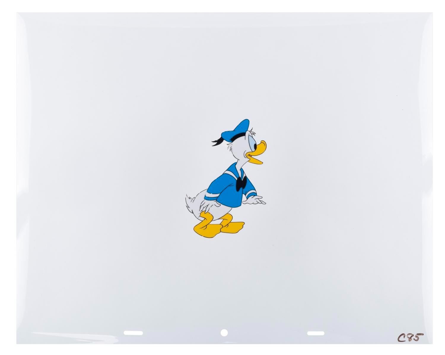 (Disney, 1950s) An original hand-painted Donald Duck production cel from an unknown production. With a character image size measuring 4.5” x 3.25”, the 12.5” x 16” cel is in very good condition with light line loss around the tail, left arm, and back of the head, and paper residue from previous mounting.