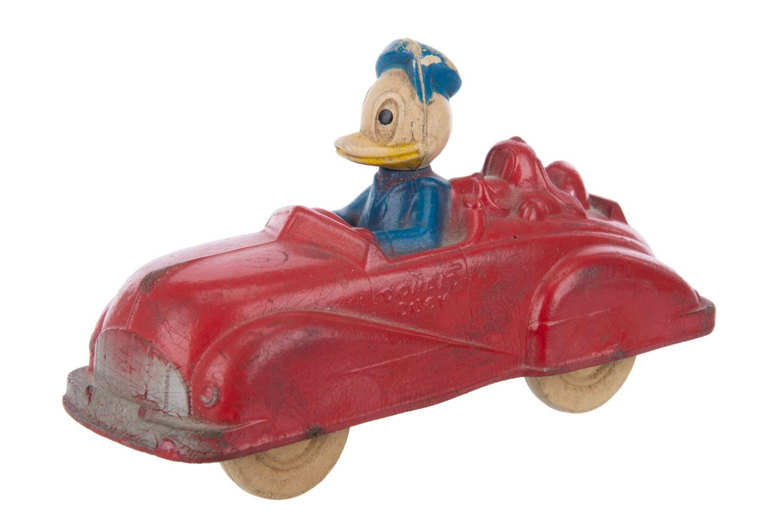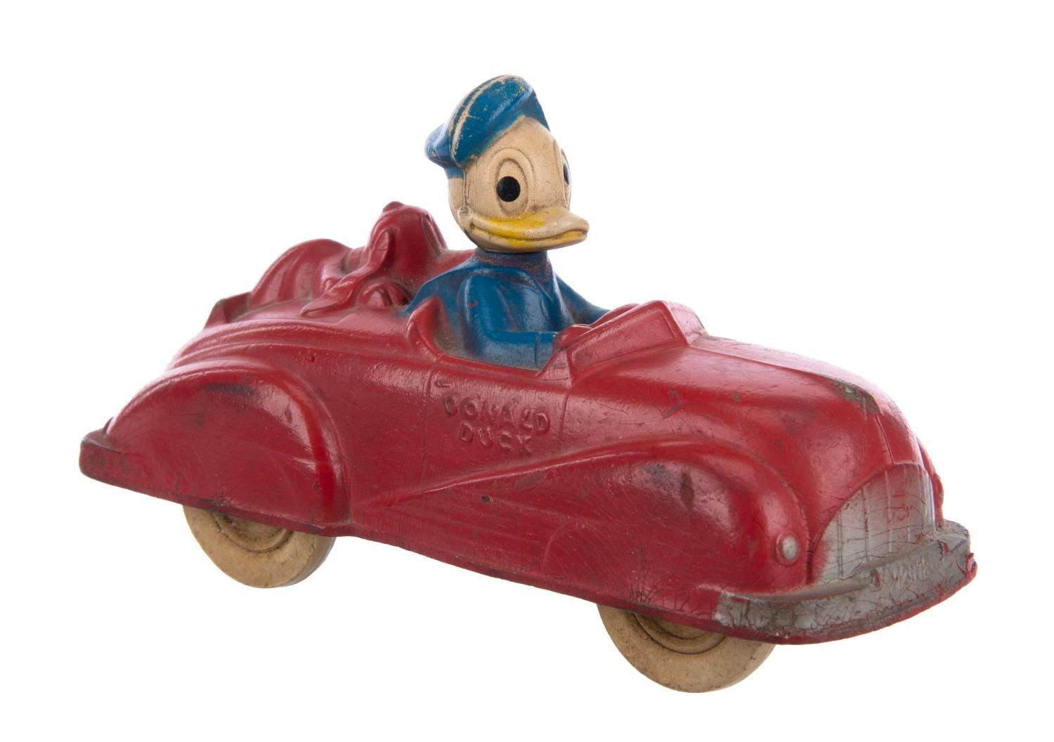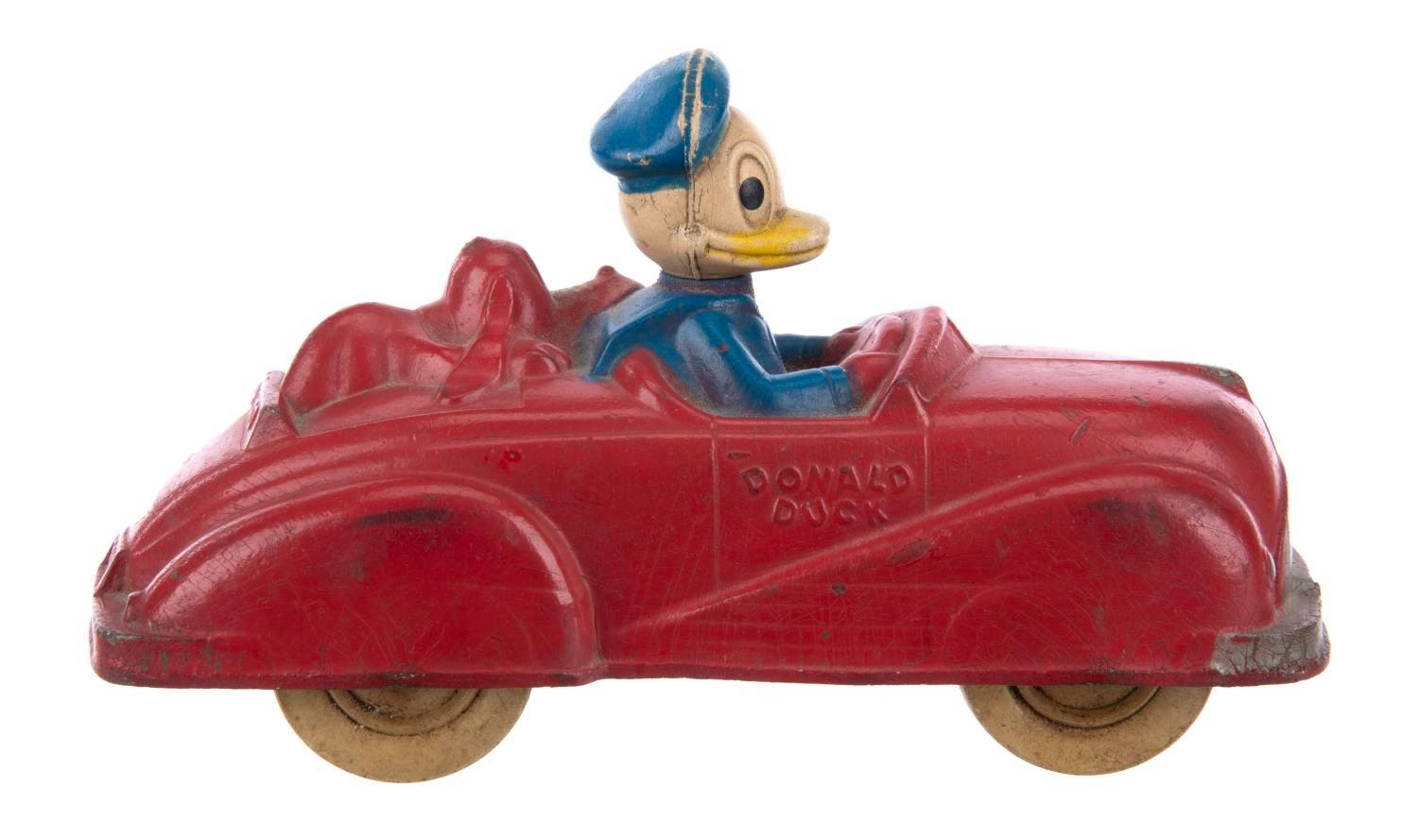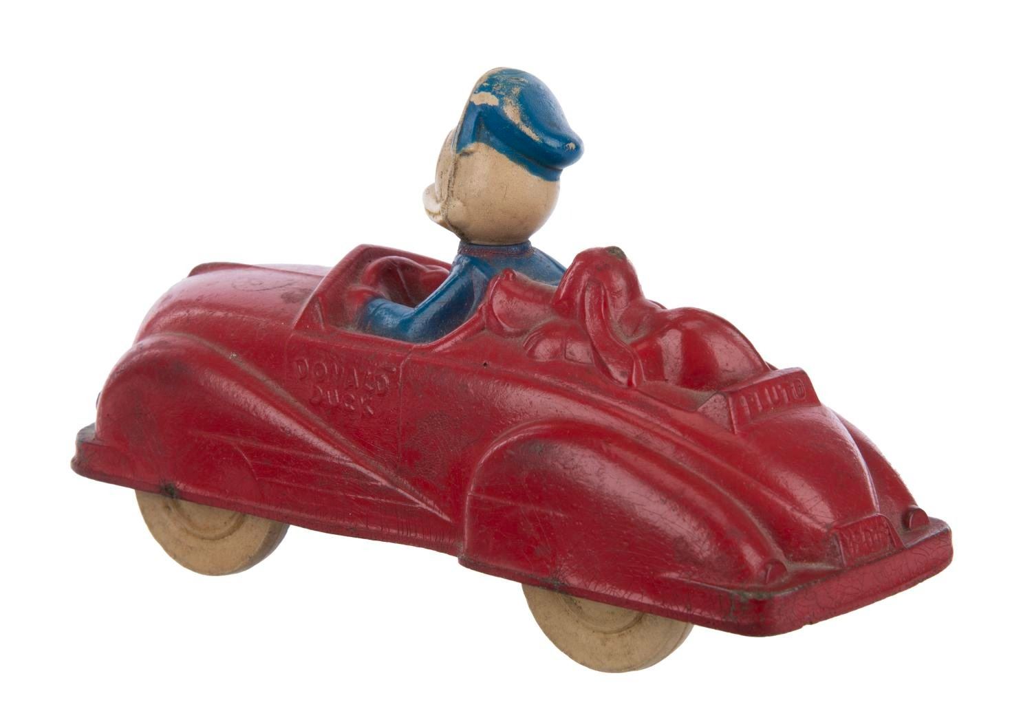 (Viceroy/Sunroco, 1950s) A Donald Duck and Pluto toy roadster by Viceroy Toys and Sunroco (Sun Rubber Co.). The rubber toy was manufactured in four base coat colors including red, yellow, white, and blue. Measuring 6.5"x2.25"x4" tall, the toy is in good condition, exhibiting scuffs and wear to its paint.