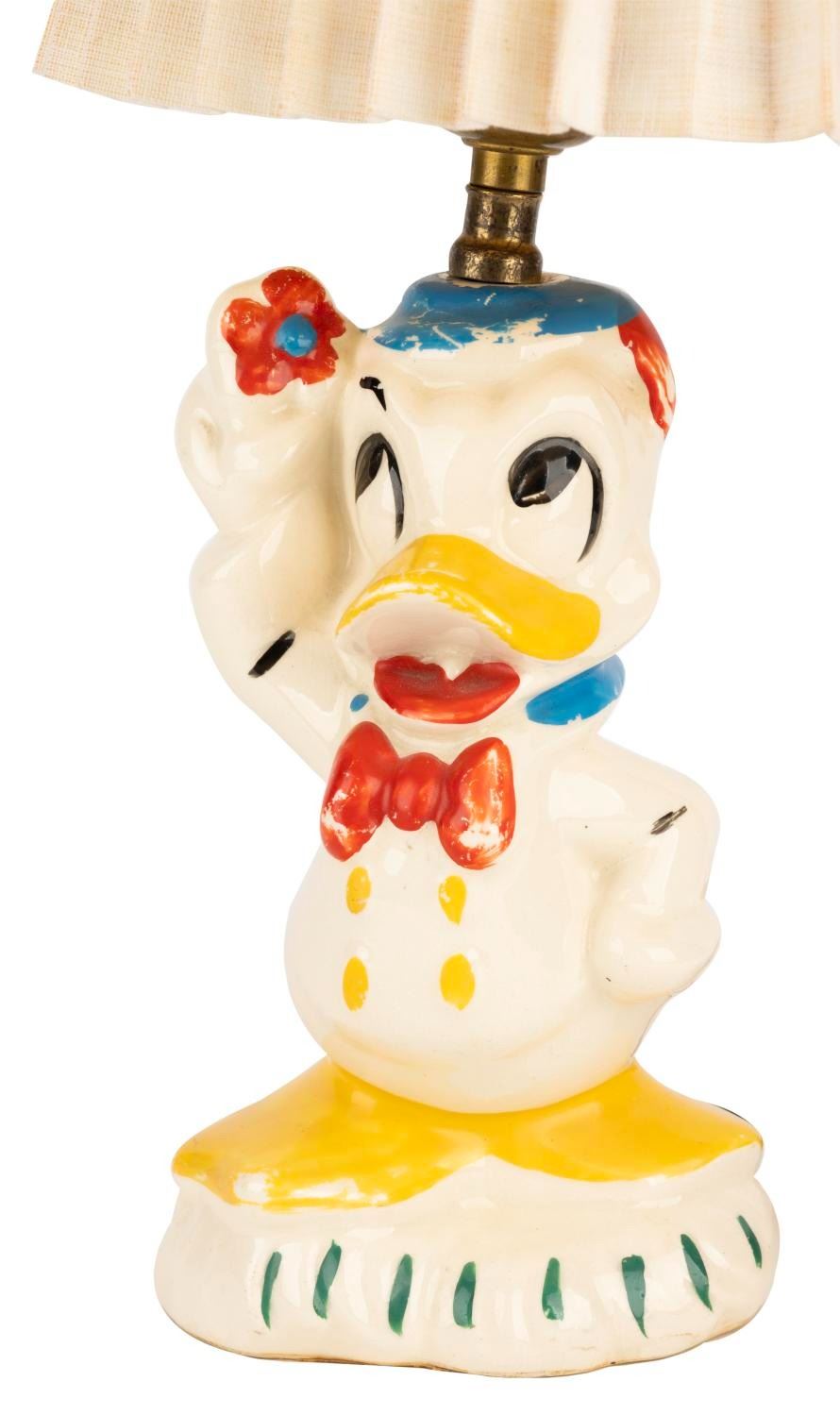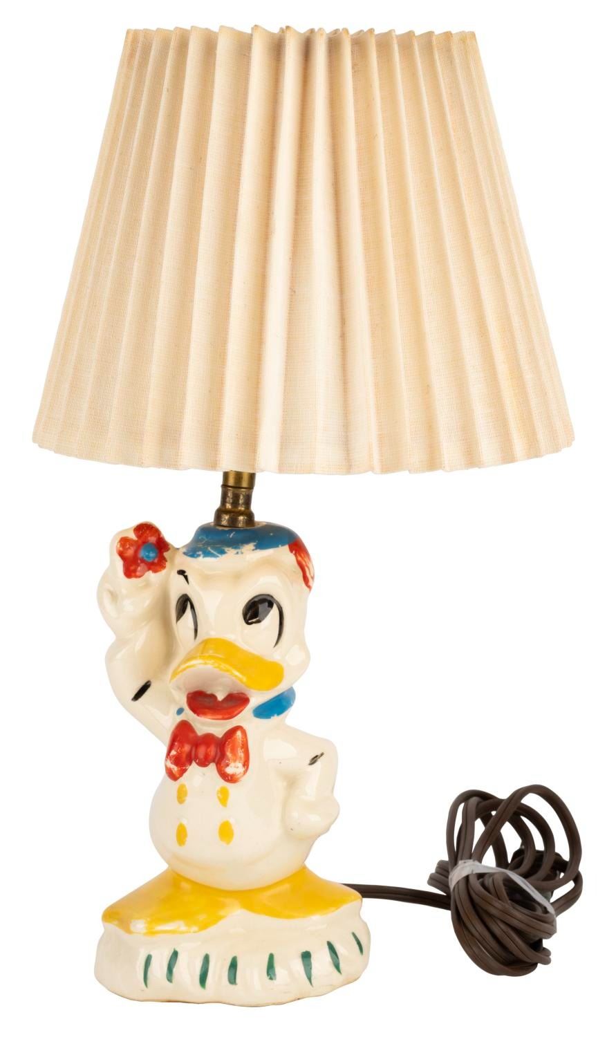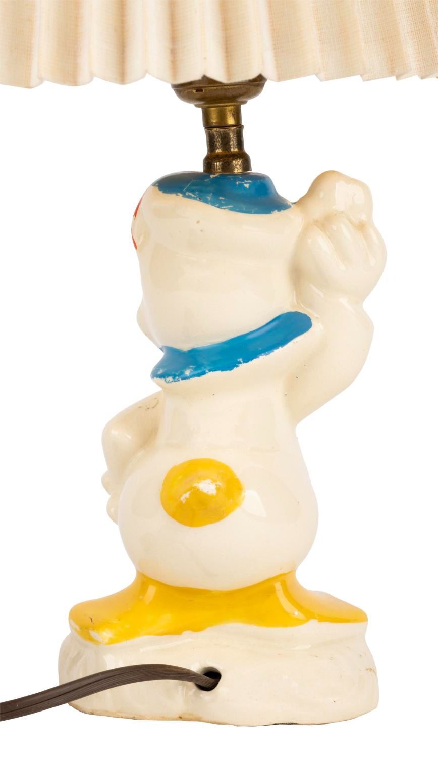 (Leeds, 1940s-60s) A Donald Duck ceramic lamp by Leeds China, which held a license for Disney Pottery starting in 1944. When tested, the lamp did not function properly, requiring repair to work. Measuring 17" tall, the lamp displays in good condition with heavy paint loss, stains, and crazing throughout.