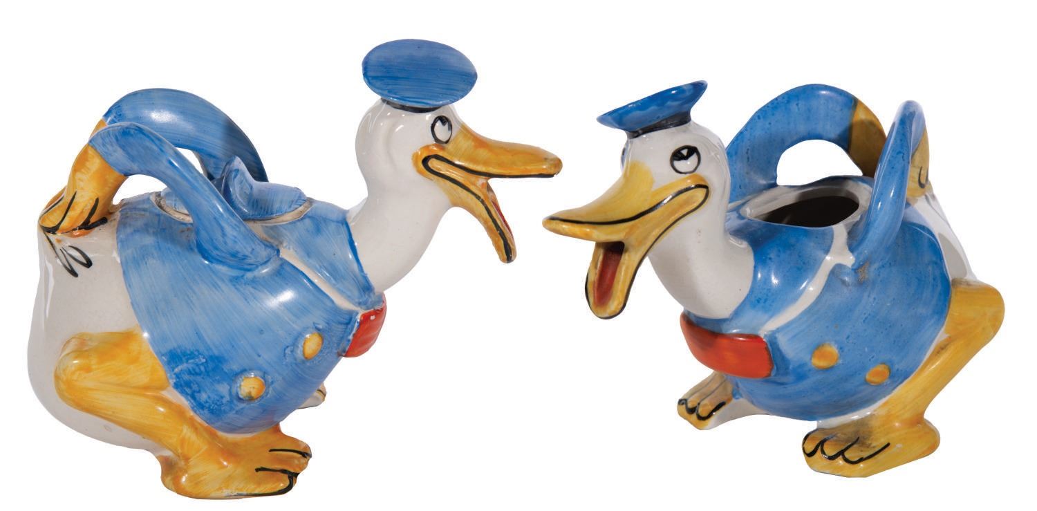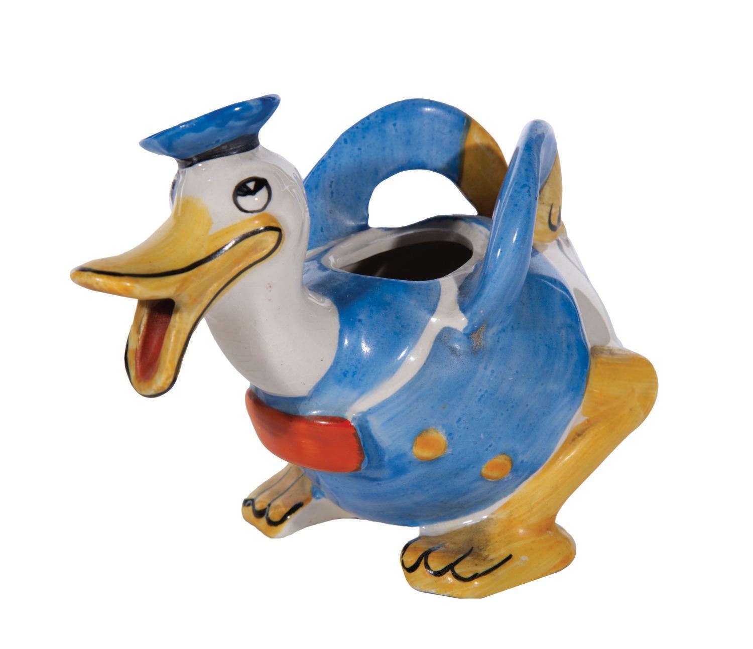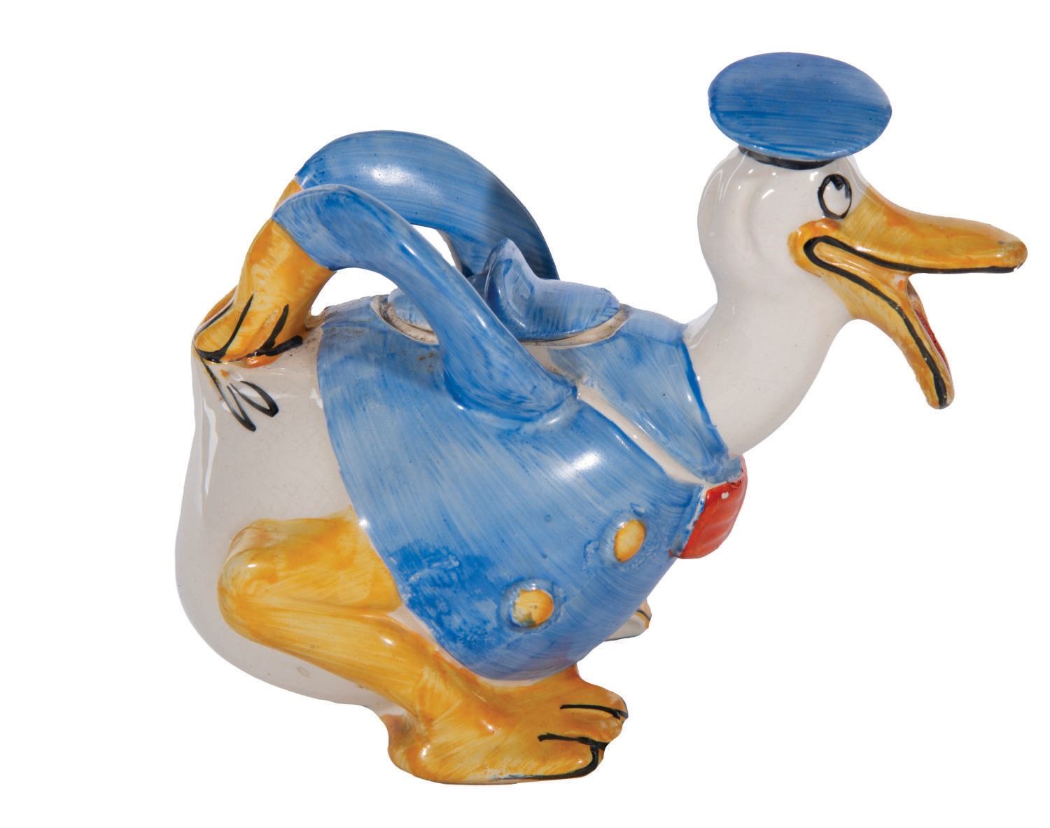 (Wade Heath, 1930s) A beautiful glazed ceramic Donald Duck Teapot and Creamer produced by Wade Heath of England in the 1930s. The teapot measures 5.5"x4" tall and the creamer measures 5"x3.5" tall. Both are in very good condition, but the creamer is missing its lid and has "Dixon" written on the rear. Both have the Wade Heath stamp and copyright on the bottom.