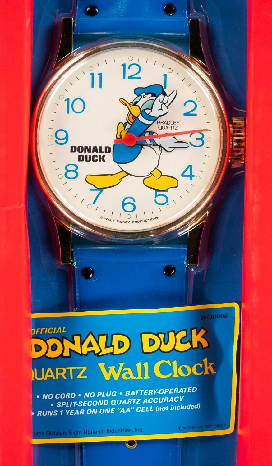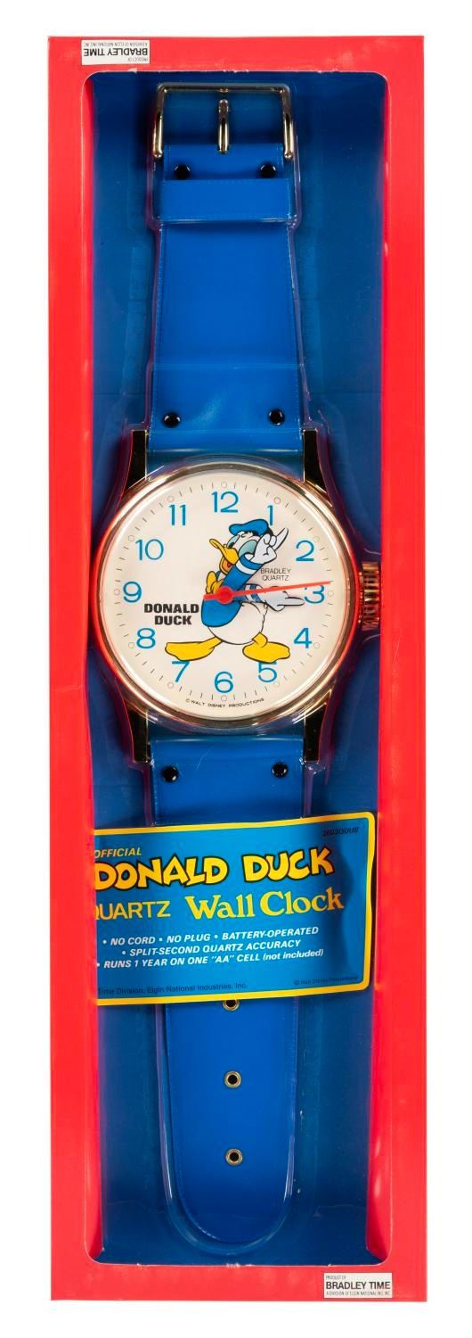 (Bradley, 1990s) A wall clock shaped like an oversized wristwatch featuring Donald Duck. The watch runs on one AA battery and has not been tested. The watch face measures 5.5” in diameter on a 26” tall band and is in fine as new condition still sealed in it’s original packaging measuring 27.5” x 8.25” x 2” deep which displays in very good condition with a light 0.5” crease on the left edge.