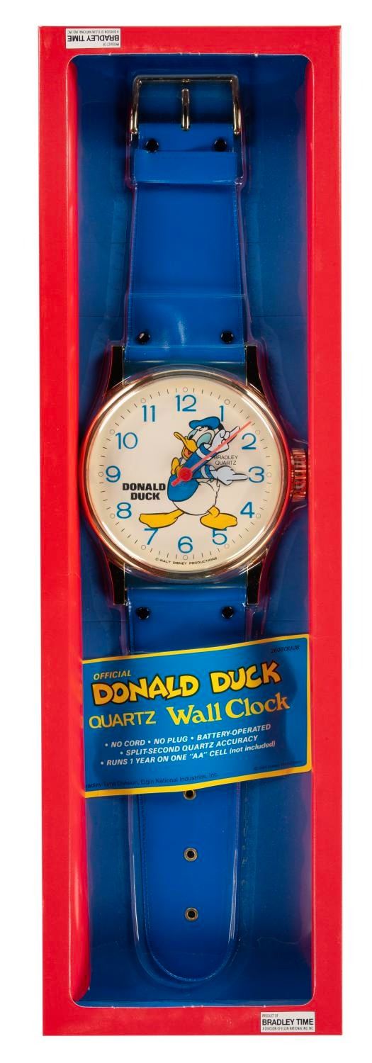 (Bradley, 1990s) A wall clock shaped like an oversized wristwatch featuring Donald Duck. The watch runs on one AA battery and has not been tested. Measuring 6.5” x 1.5” x 26” long, the unopened clock is in assumed fine condition, while the 8.5” x 2” x 27.5” long box is in very good condition with light creases and wear.
