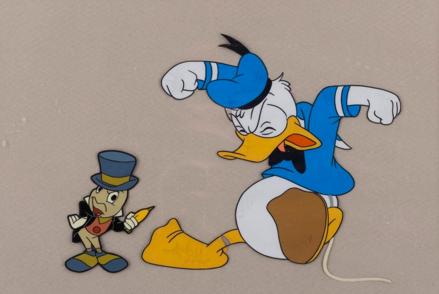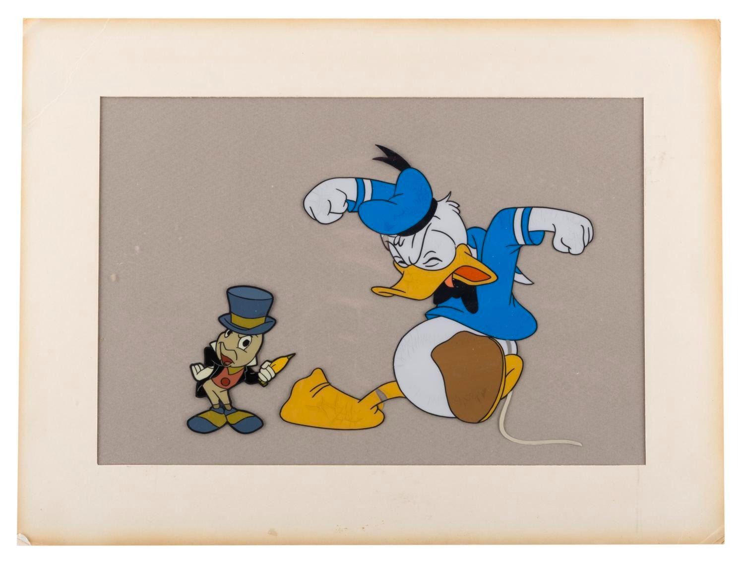 (Disney, 1959) An original hand-painted cel of Jiminy Cricket and Donald Duck. This art was used in a Walt Disney Production and released to the Art Corner of Disneyland, but gifted to an attendee of INA Spotlight in the autumn of 1959. The back of the piece bears a label very similar to the gold Art Corner label, with different wording. The characters have a total image size of 7" x 5" on the 7.25" x 10" trimmed cel. The cel displays in good condition with slight paint loss to Donald's forehead and right leg, and very faint cracks in his foot and hands. The matte is in good condition with wear and discoloration to the edges, still sealed with the gold label on the back.