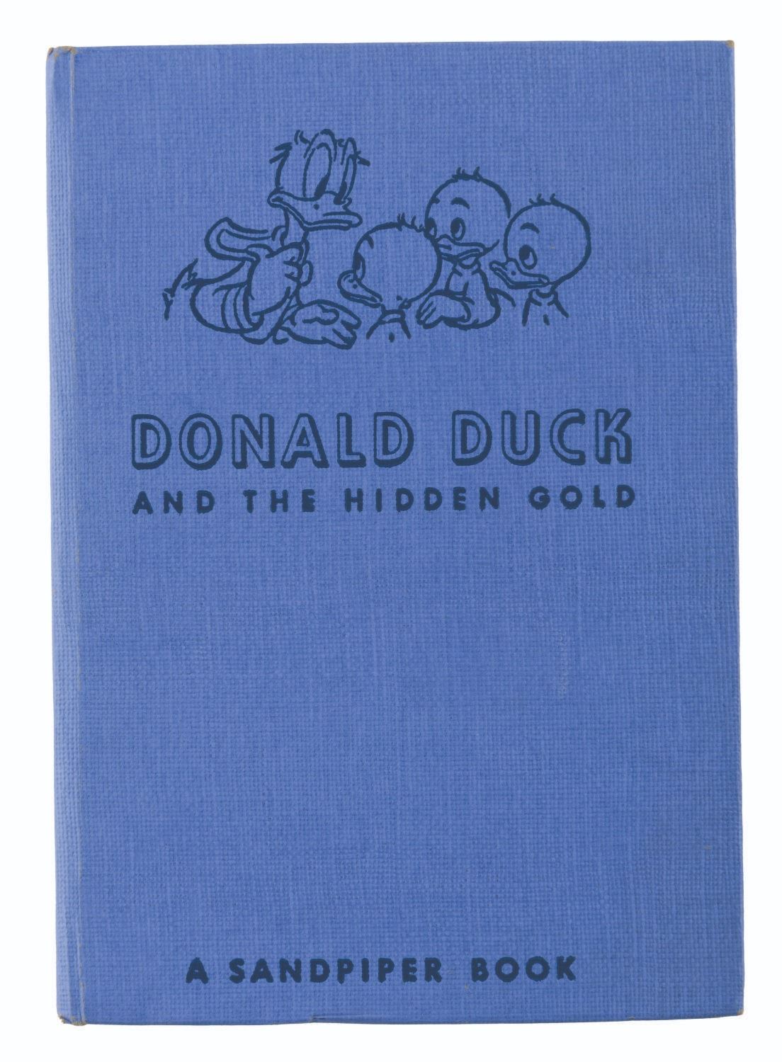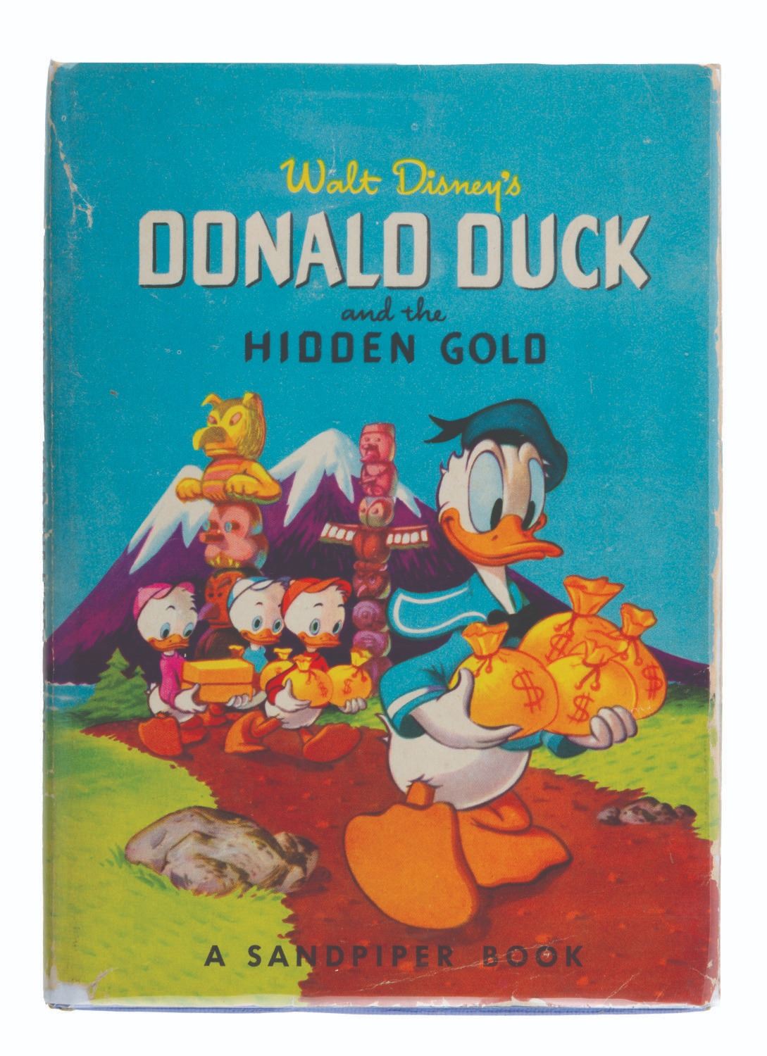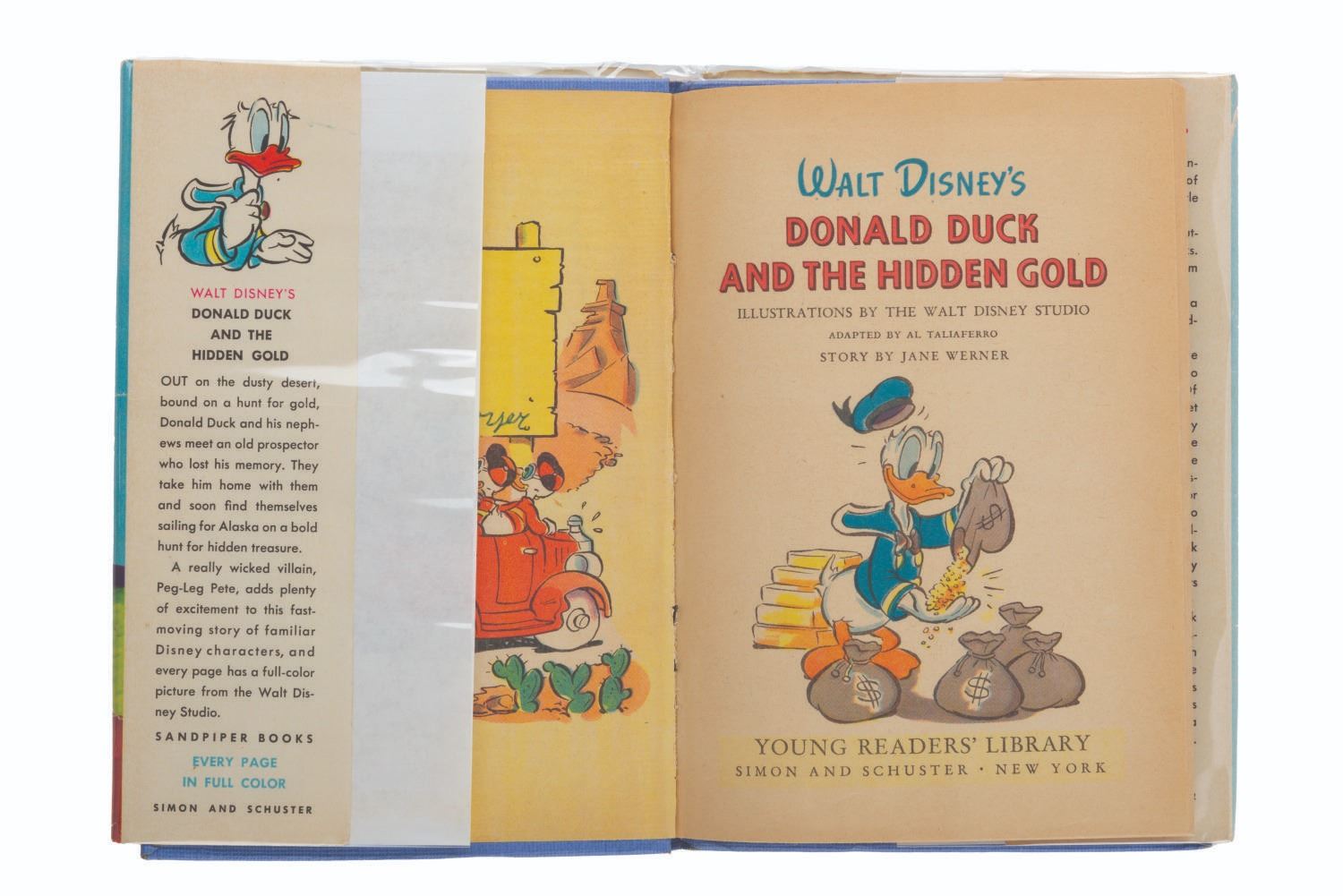 (Simon & Schuster, 1951) A hardcover Walt Disney's Donald Duck and the Hidden Gold book with dust jacket. Measuring 5.25" x 7.5", the book is in very good condition with slight browning to the pages from age. The rare dust jacket is in good condition with wear mainly along the edges and spine, including small chips at the top and bottom of the spine.