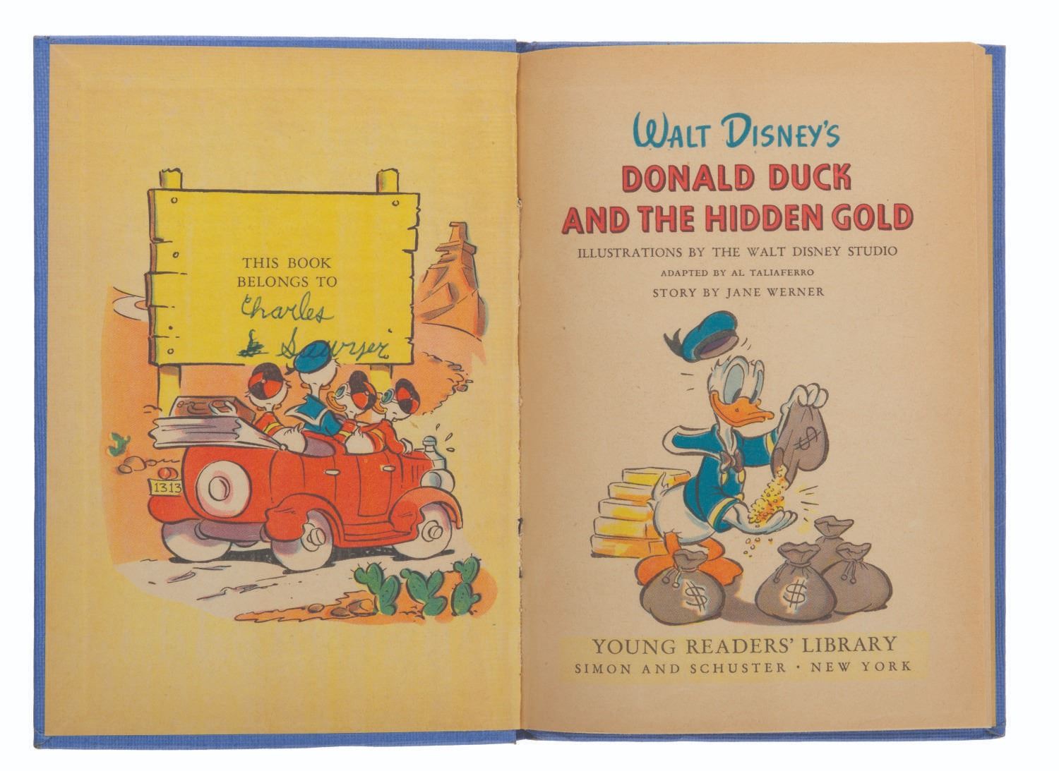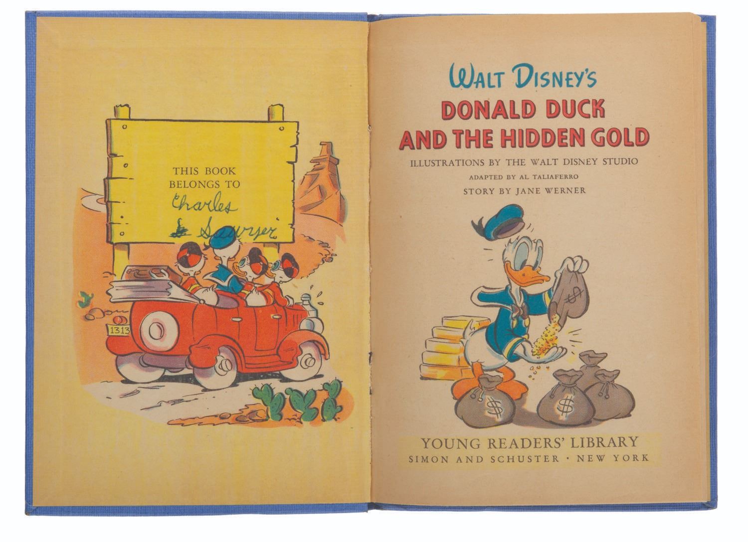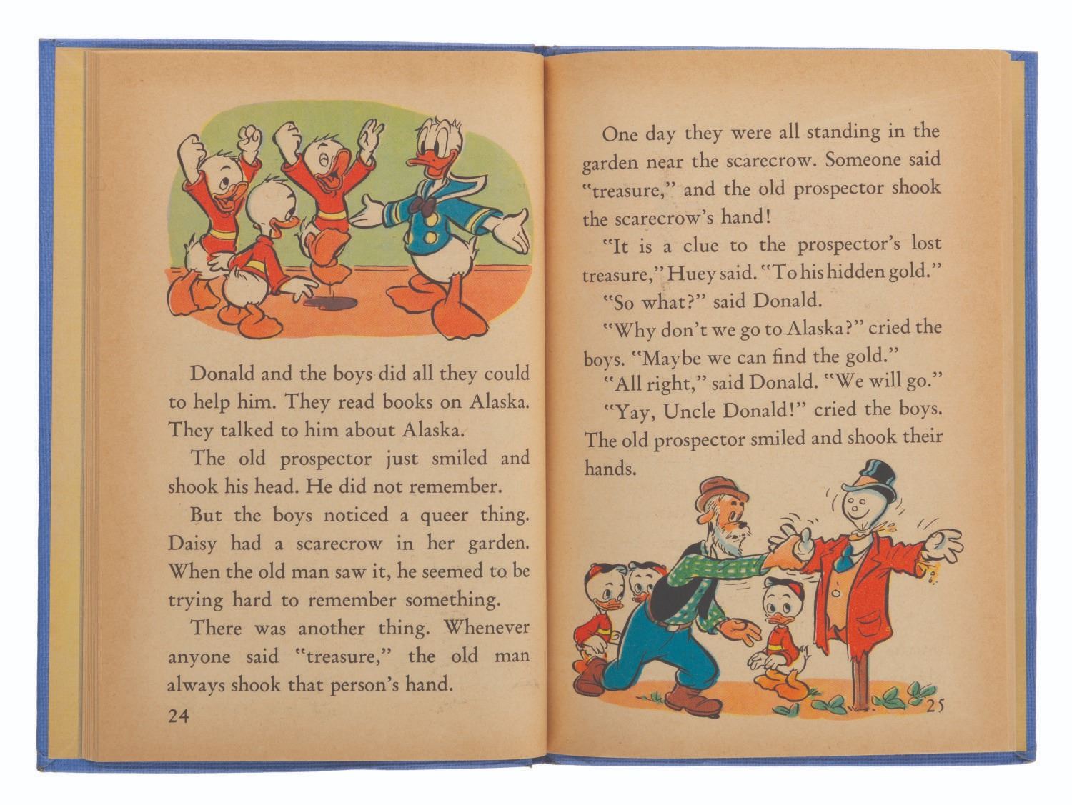 (Simon & Schuster, 1951) A hardcover Walt Disney's Donald Duck and the Hidden Gold book with dust jacket. Measuring 5.25" x 7.5", the book is in very good condition with slight browning to the pages from age. The rare dust jacket is in good condition with wear mainly along the edges and spine, including small chips at the top and bottom of the spine.