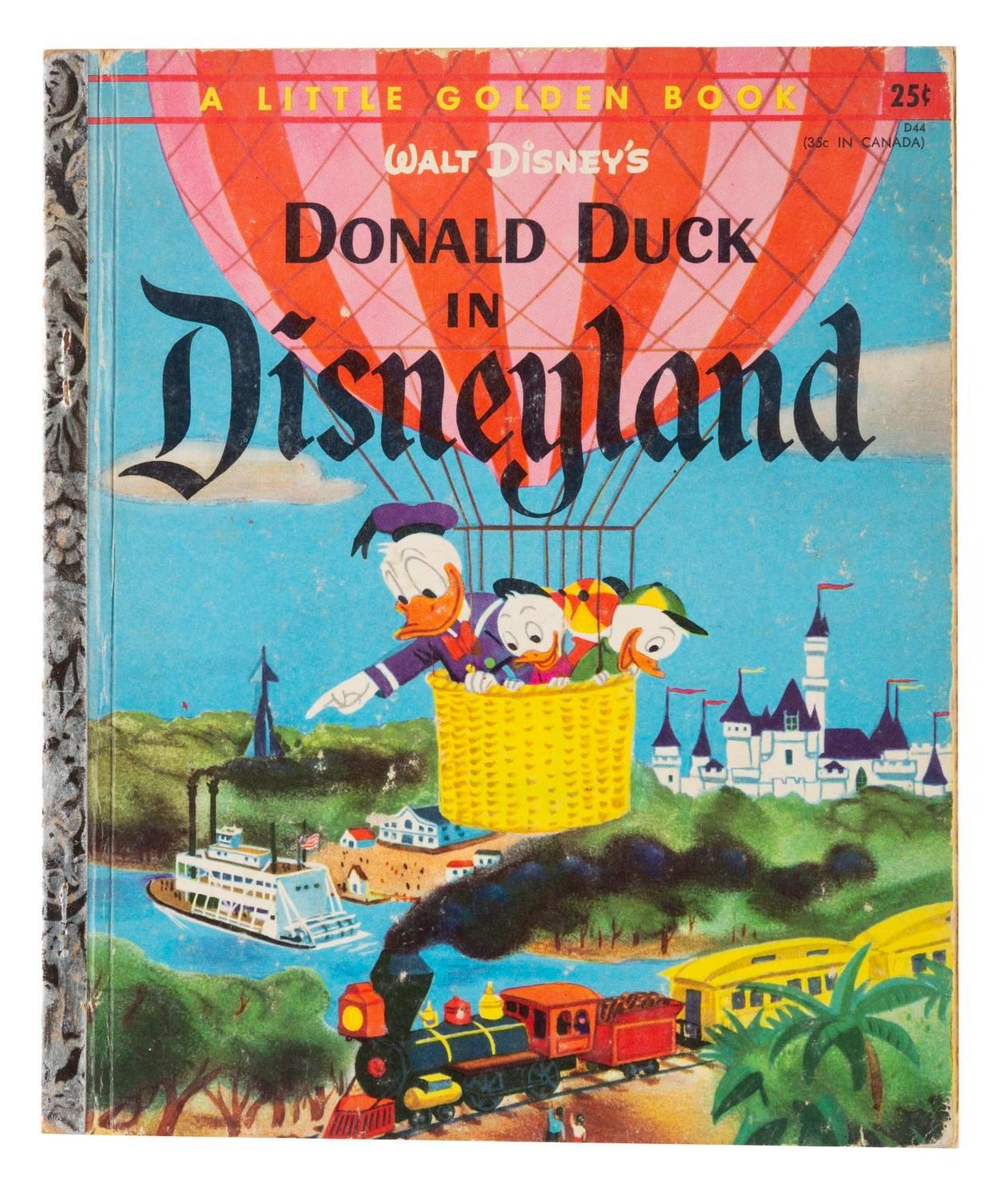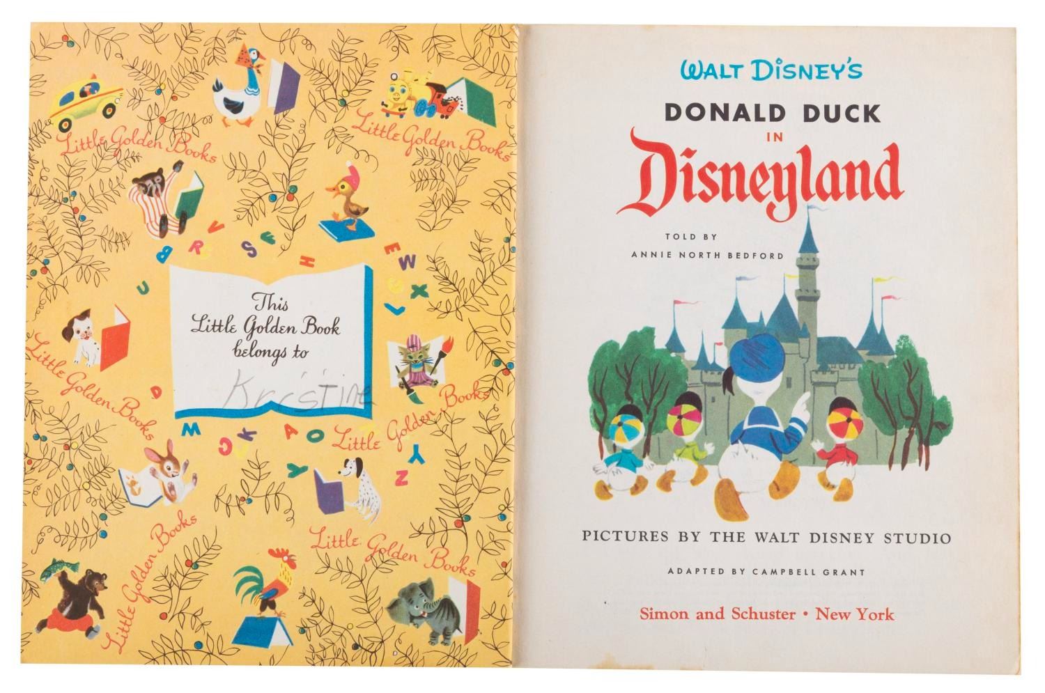 (Whitman, 1955) A Little Golden Book of Donald's adventures in Disneyland with his nephews. Measuring 6.5" x 7.75", the book is in good condition with scuffs and edge wear to the cover, a name written in pencil inside, and spots of discoloration in the text of a few pages.