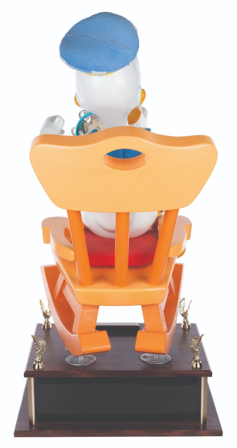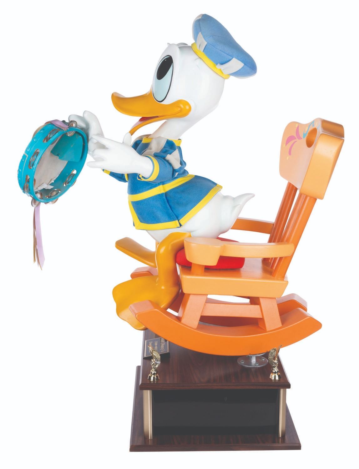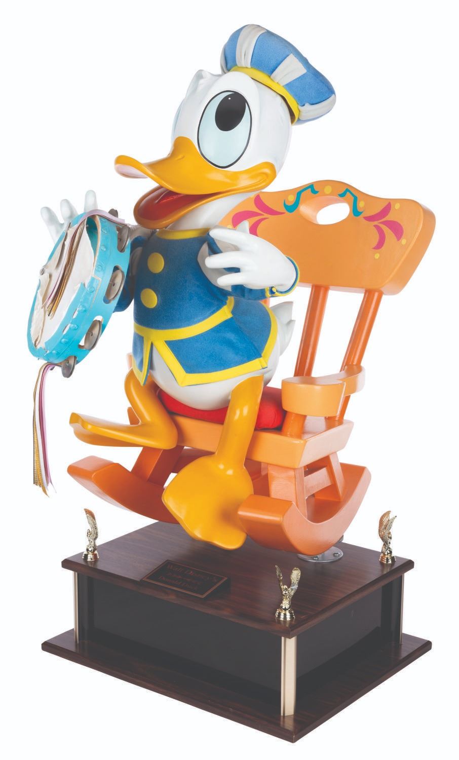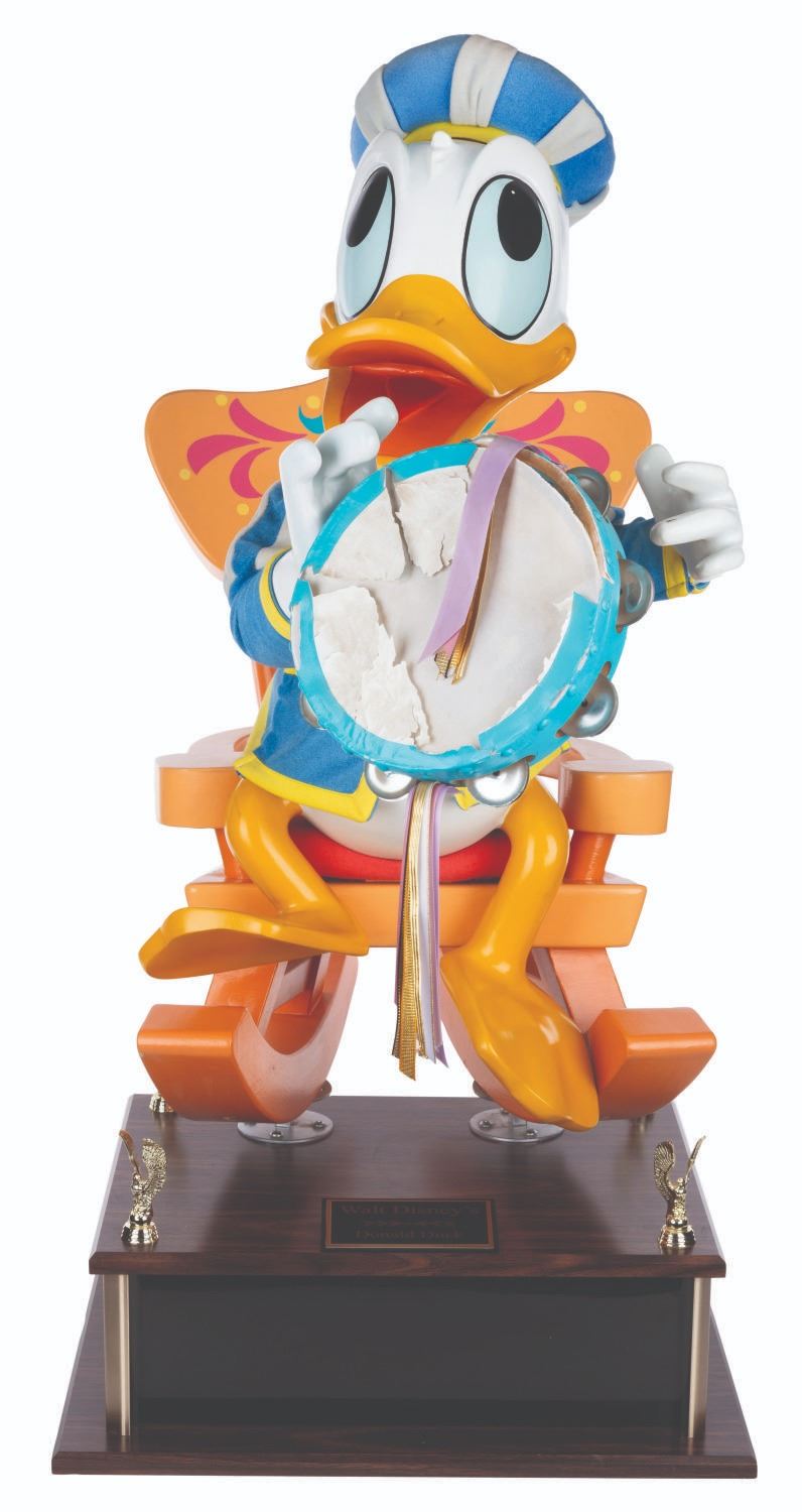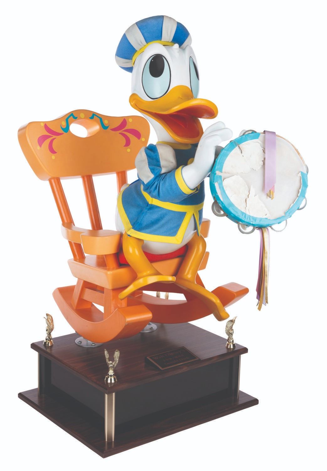 (Disney, 1987-2000s) An original Disney Store display figure of Donald Duck playing the tambourine. This figure was part of a scene titled "Mickey’s Magical Music Shoppe” featuring beloved Disney characters in medieval attire and playing instruments. Measuring 16” x 29” x 34” tall on a 20” x 7” x 16” base for a full height of 41”, the figure displays in very good condition with light oxidation on the tambourine metal, most of the tambourine cover torn and missing, scuffs, wear from store use, and heavy cracks on the chair up to 8” long. Due to size and weight, special shipping arrangements are required. Please inquire before bidding.