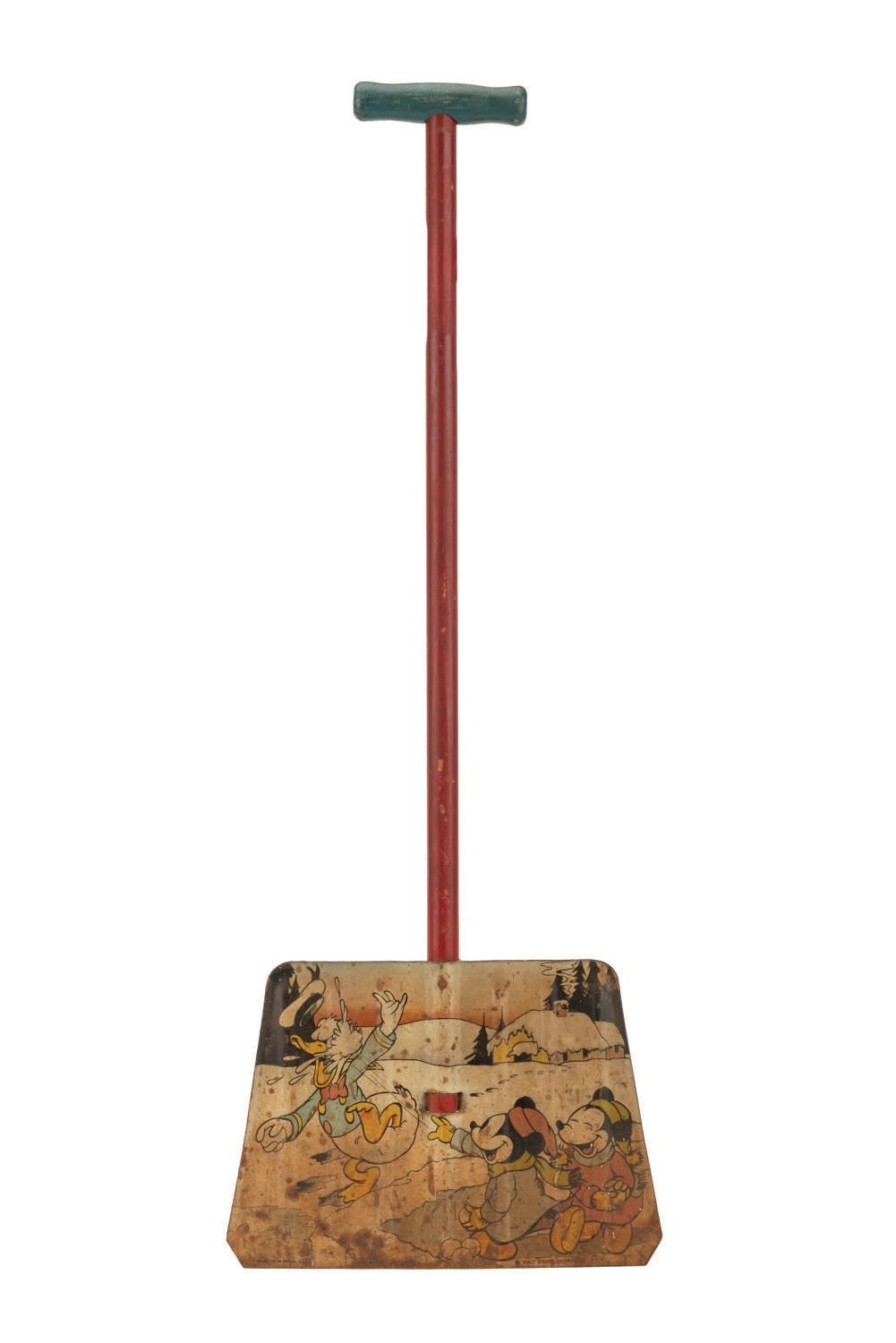 (Ohio Art, 1930s) A tin litho snow shovel featuring Donald Duck and Mickey Mouse's nephews. The children's-size shovel features imagery of Mickey Mouse's nephews throwing snowballs at Donald. Measuring 26.25" long and 10" at its widest, the shovel is in fair condition, exhibiting much oxidation and spots of discoloration, scuffs, minor dents, and wear throughout metallic and wooden parts.
