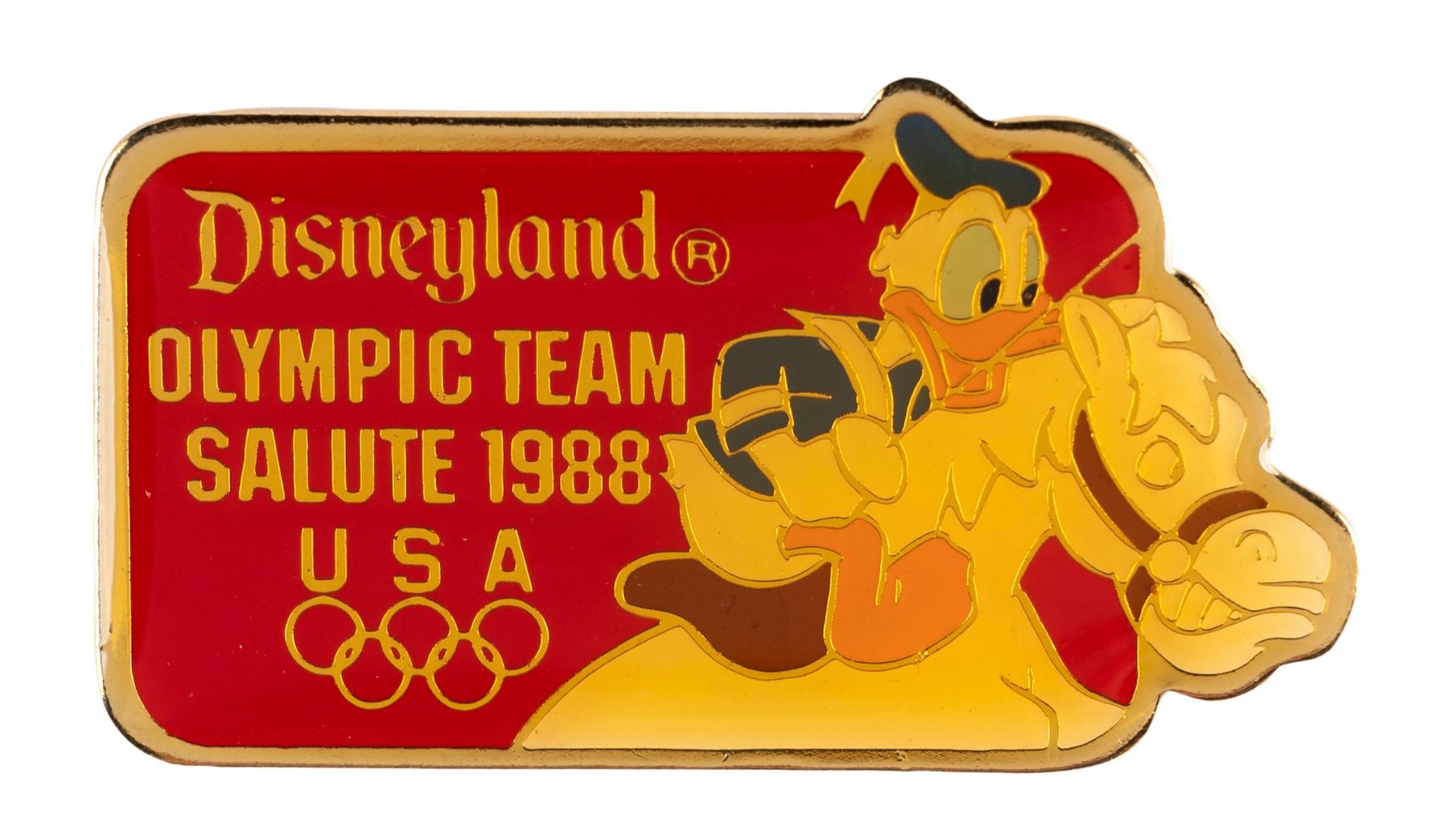 (Disneyland, 1988) A Disneyland Olympic Team Salute 1988 pin, featuring Donald Duck on horseback. Measuring 1.5” wide, the pin is in very good condition with color shift from age.
