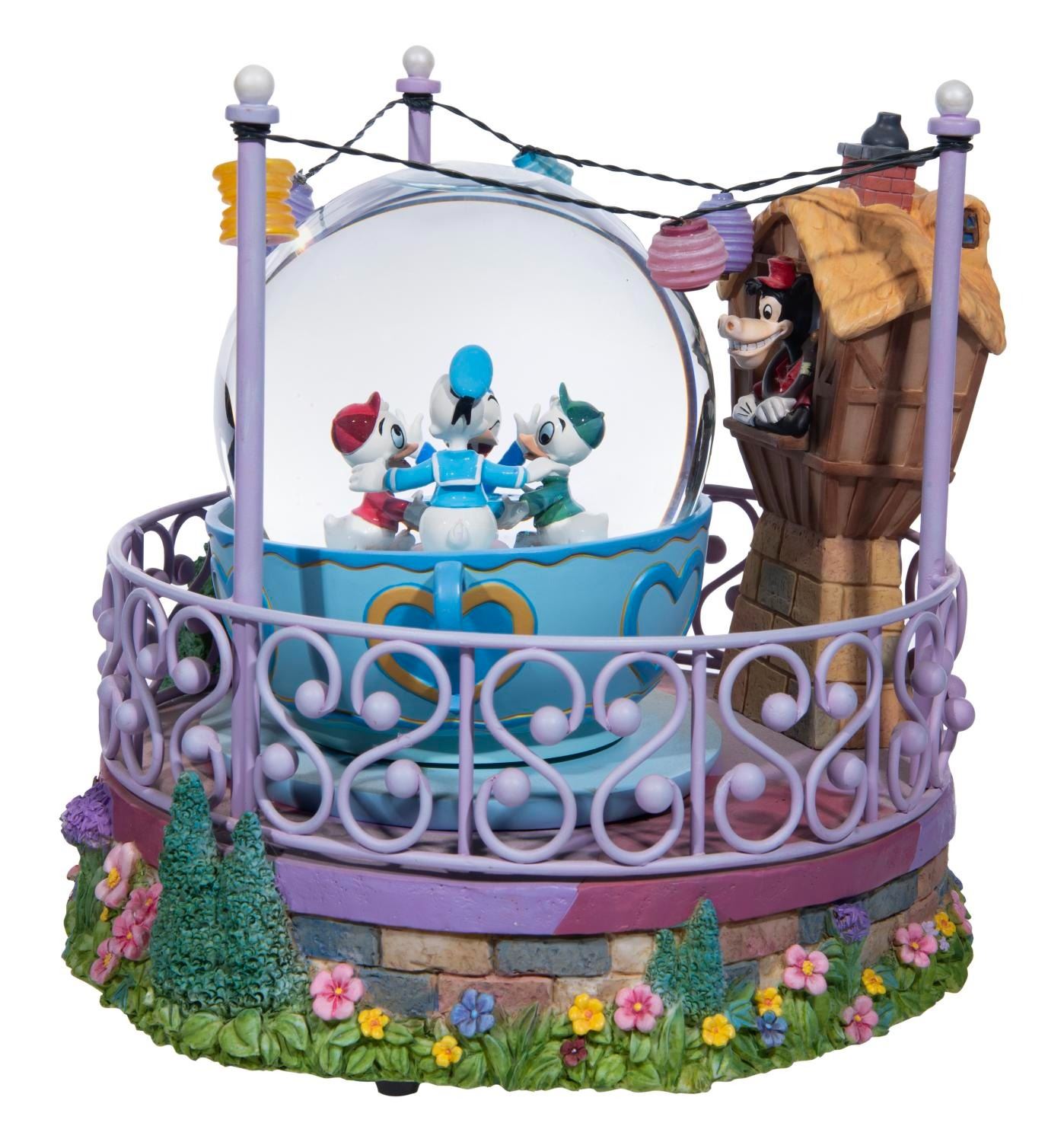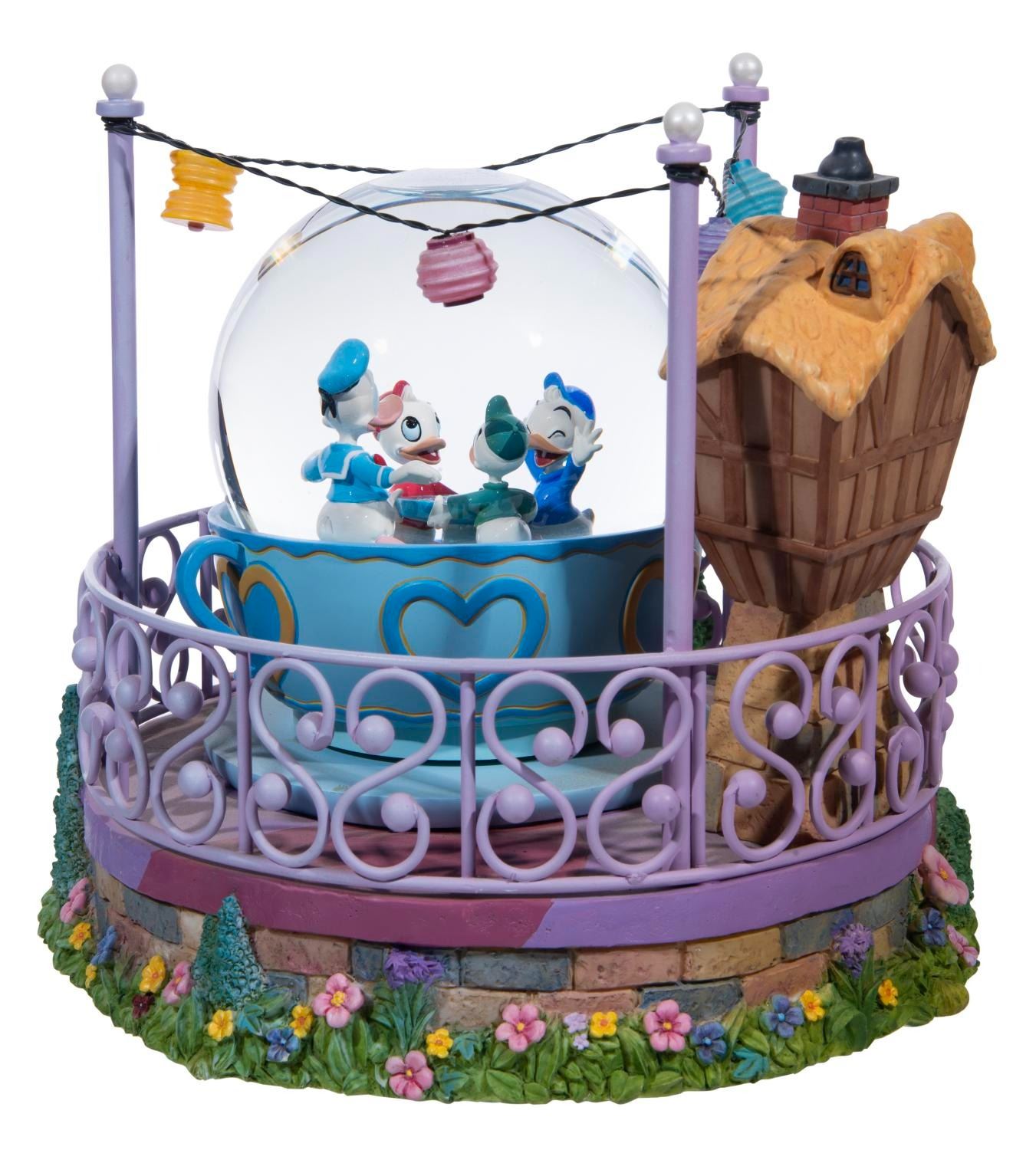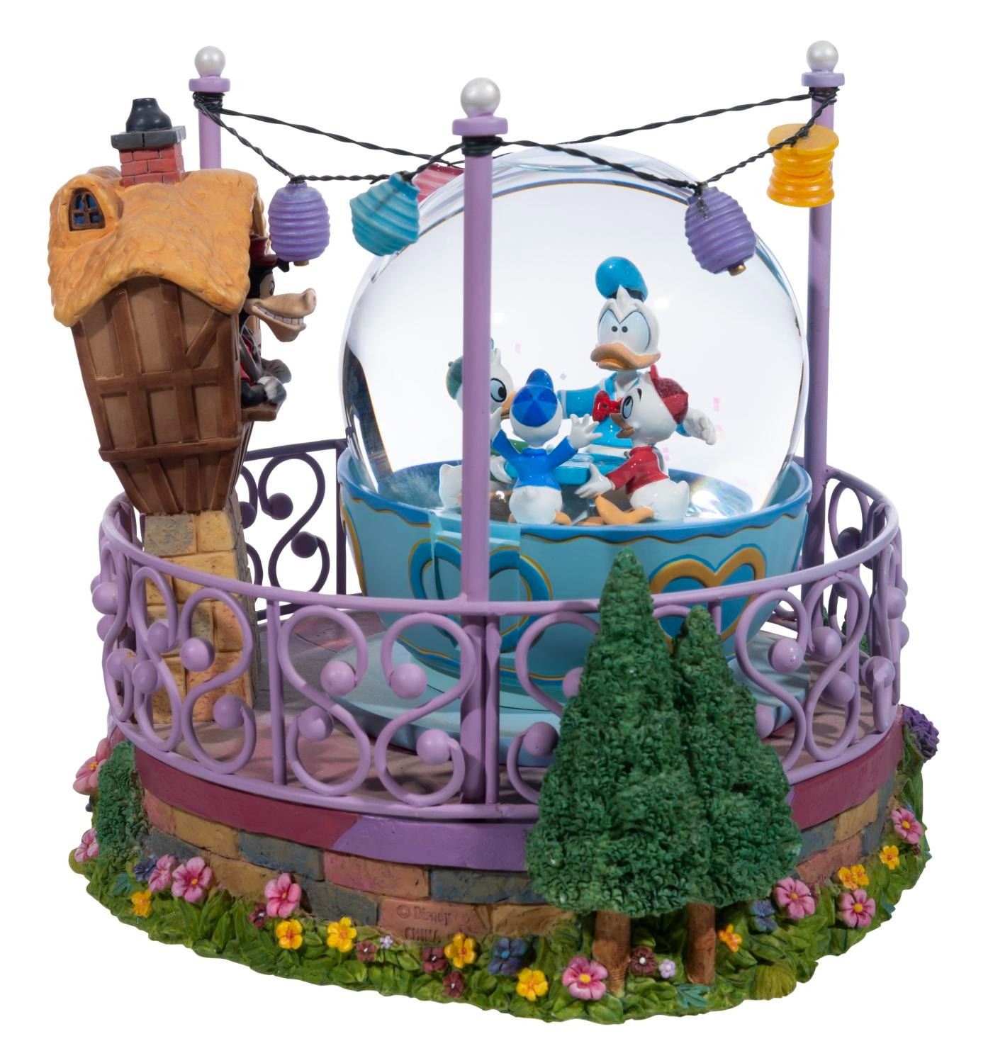 (Disney, 2000s) A "Donald's Mad Tea Party" snow globe from the Disney Catalog featuring Donald Duck, Huey, Dewey, and Louie, and Horace Horsecollar. Tested for function, the festive lanterns no longer illuminate and the musical feature does not work. Measuring 8.5" tall and 8.5" in diameter, this sculpted resin and glass piece otherwise displays a fine condition.