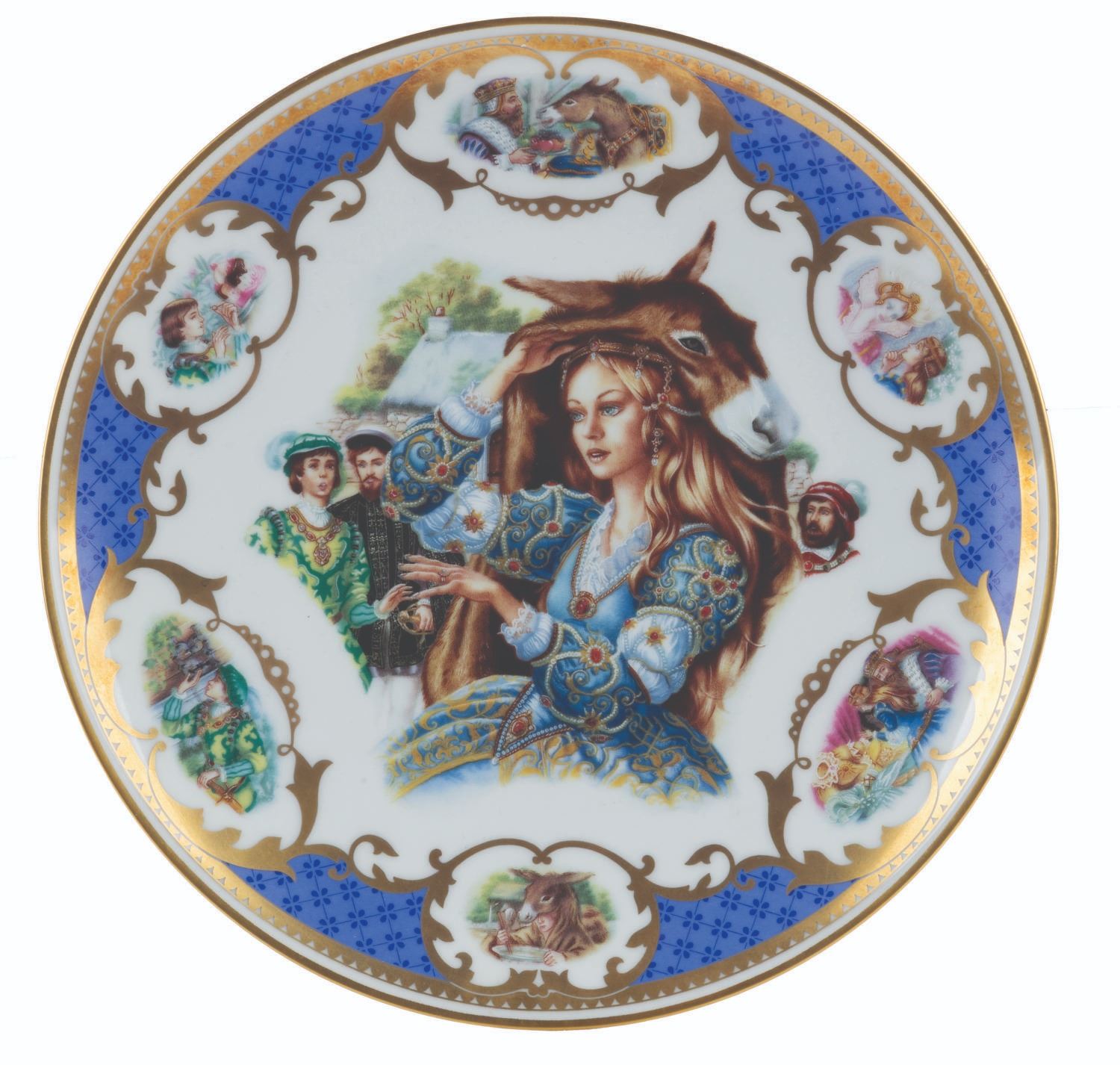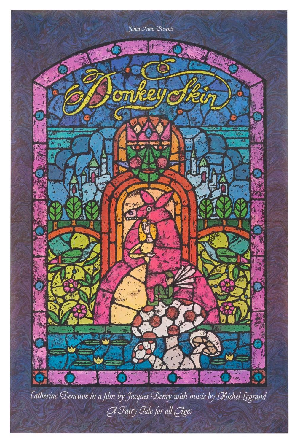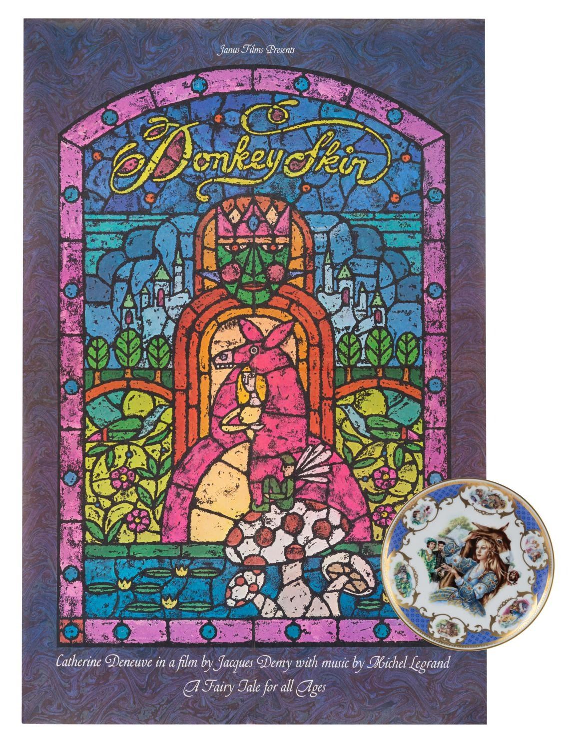 (Sogou/Janus Films, 1985) A "Donkey Skin" theatrical release poster, together with a porcelain plate of the same fairy tale from Sogou. The poster features a stained glass art design, and the plate is marked "1983 F.P. Paris" and "Porcelaine De Limoges" on the reverse. Measuring 27" x 41", the poster is in very good condition with original holds and light handling wear. The 9" diameter plate is in fine condition.
