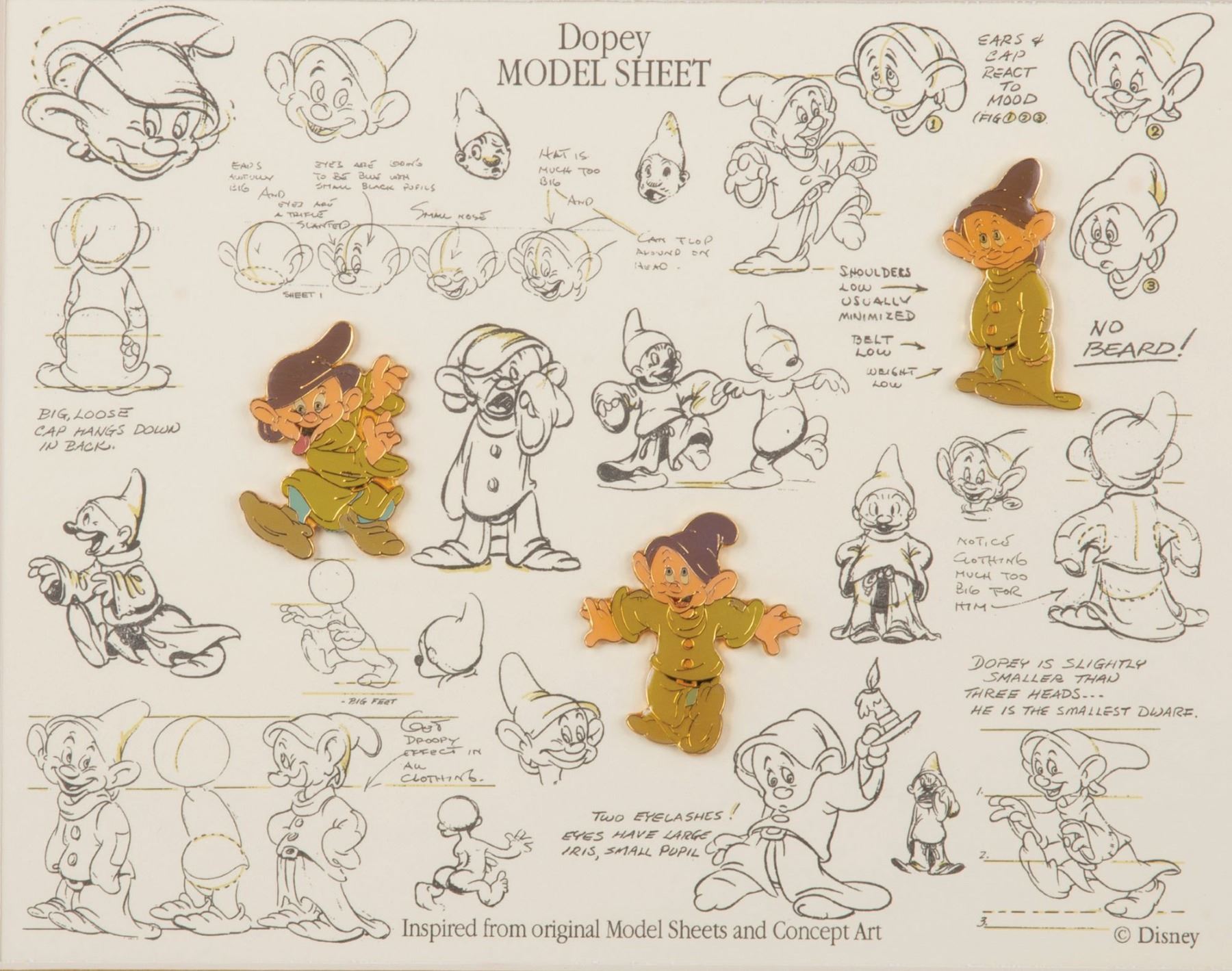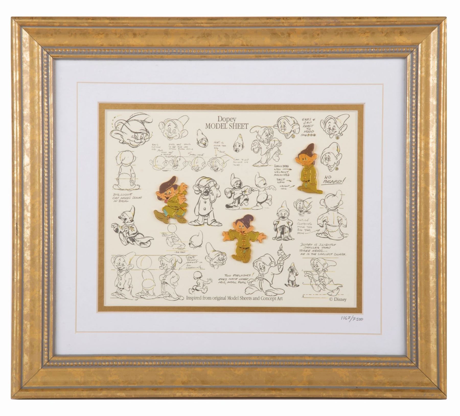 (Disney, 1999) A framed set of three Dopey pins themed to his model sheet. Released in a Limited Edition of 7500, the framed set numbered 1167 measures 13.5” x 15.5” and displays in fine condition.