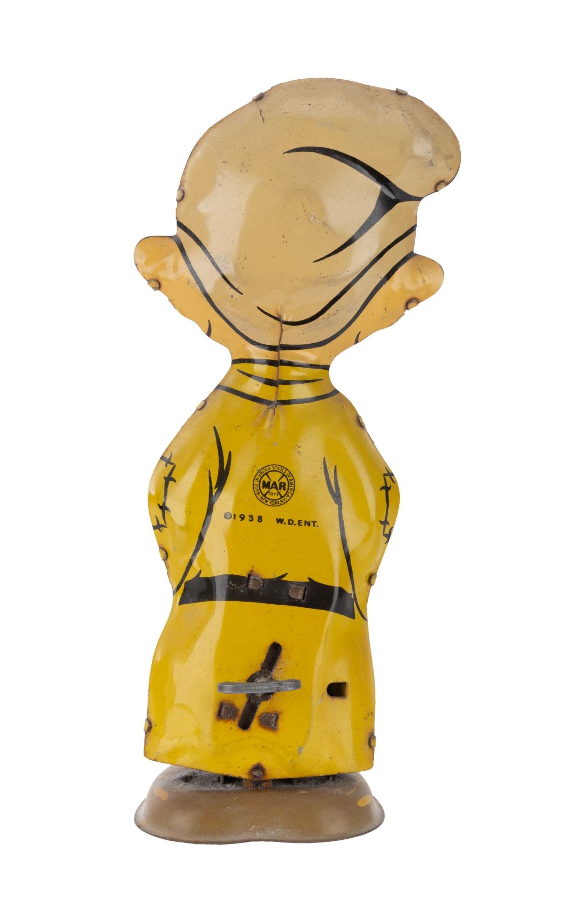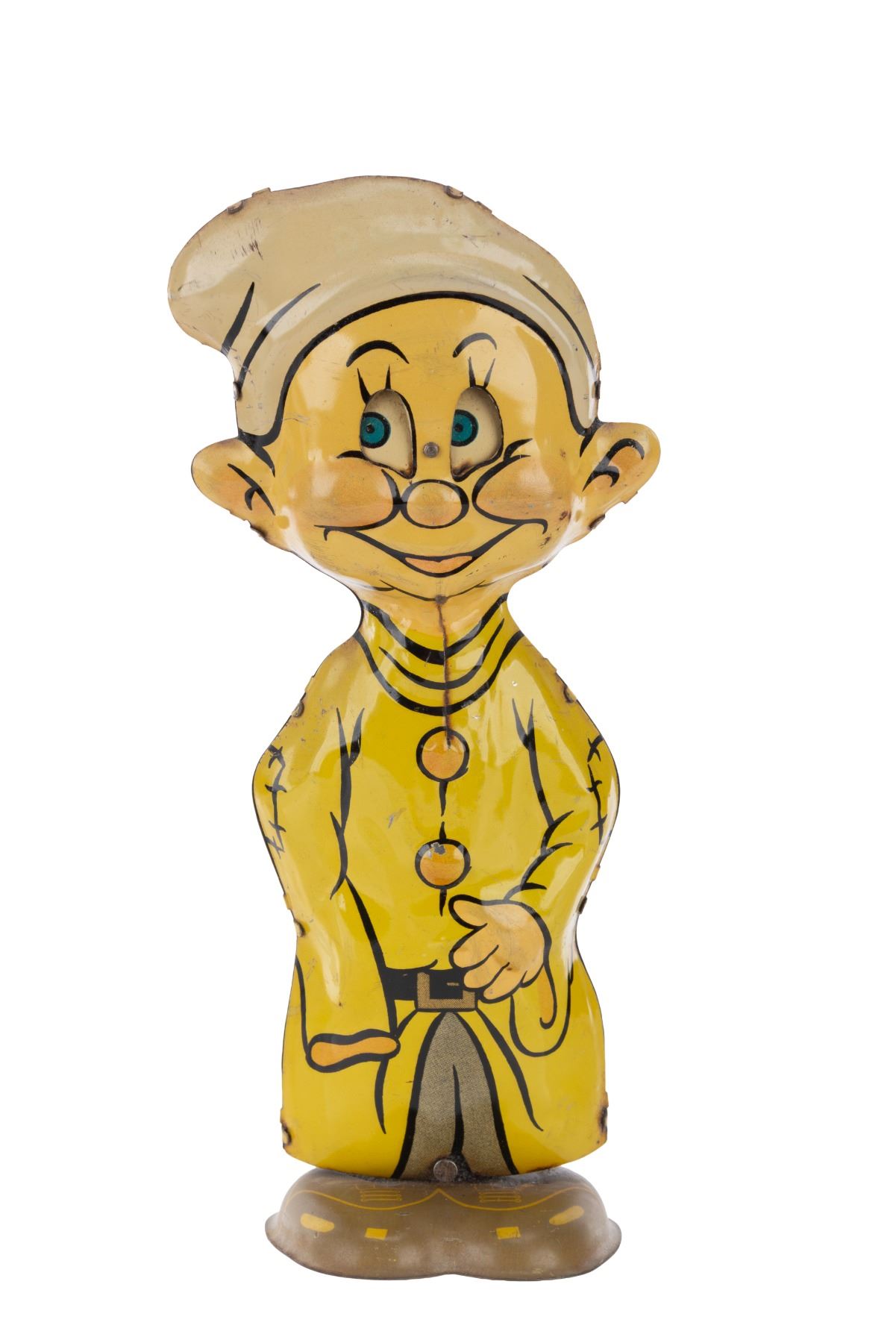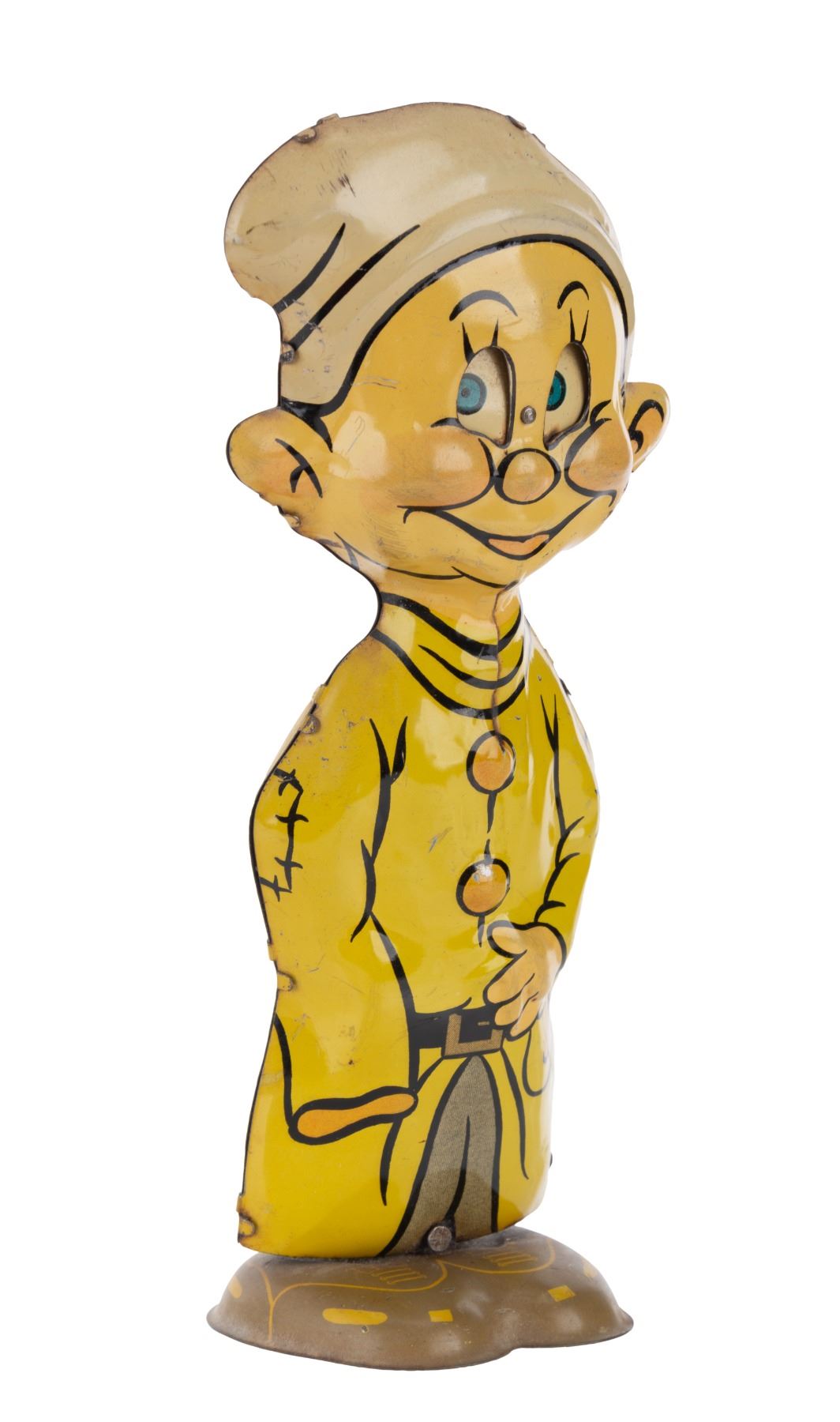 (Marx, 1938) A tin-litho wind-up toy of Dopey from "Snow White and the Seven Dwarfs." When wound, Dopey waddles as his eyes move. The winding mechanism still functions, but at a reduced strength from the original design. Measuring 8" tall, Dopey is in good condition with light soiling, scuffing, oxidation, and spots in his eyes.