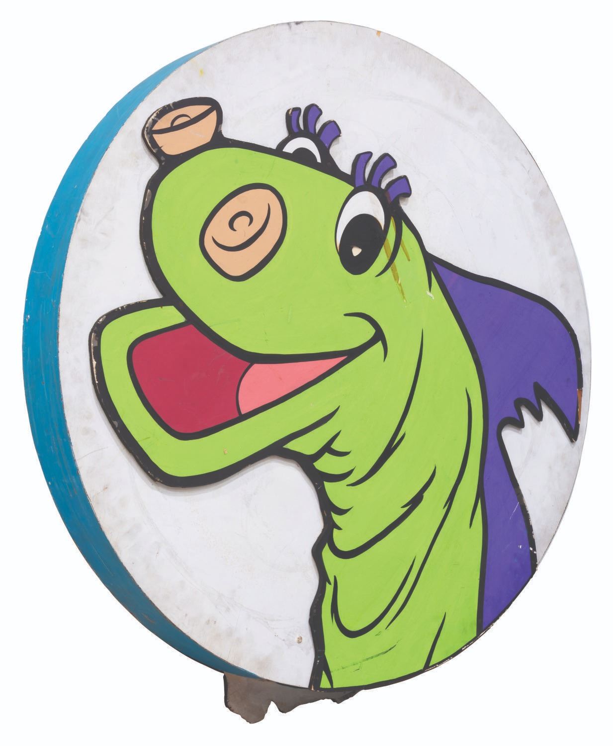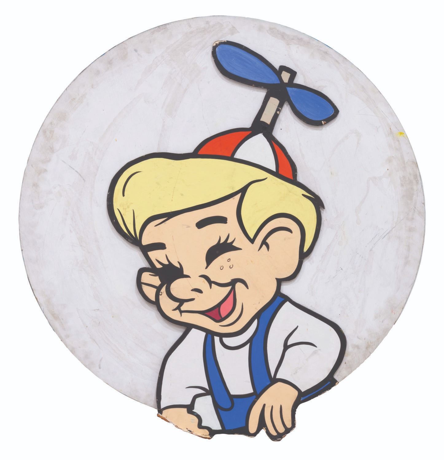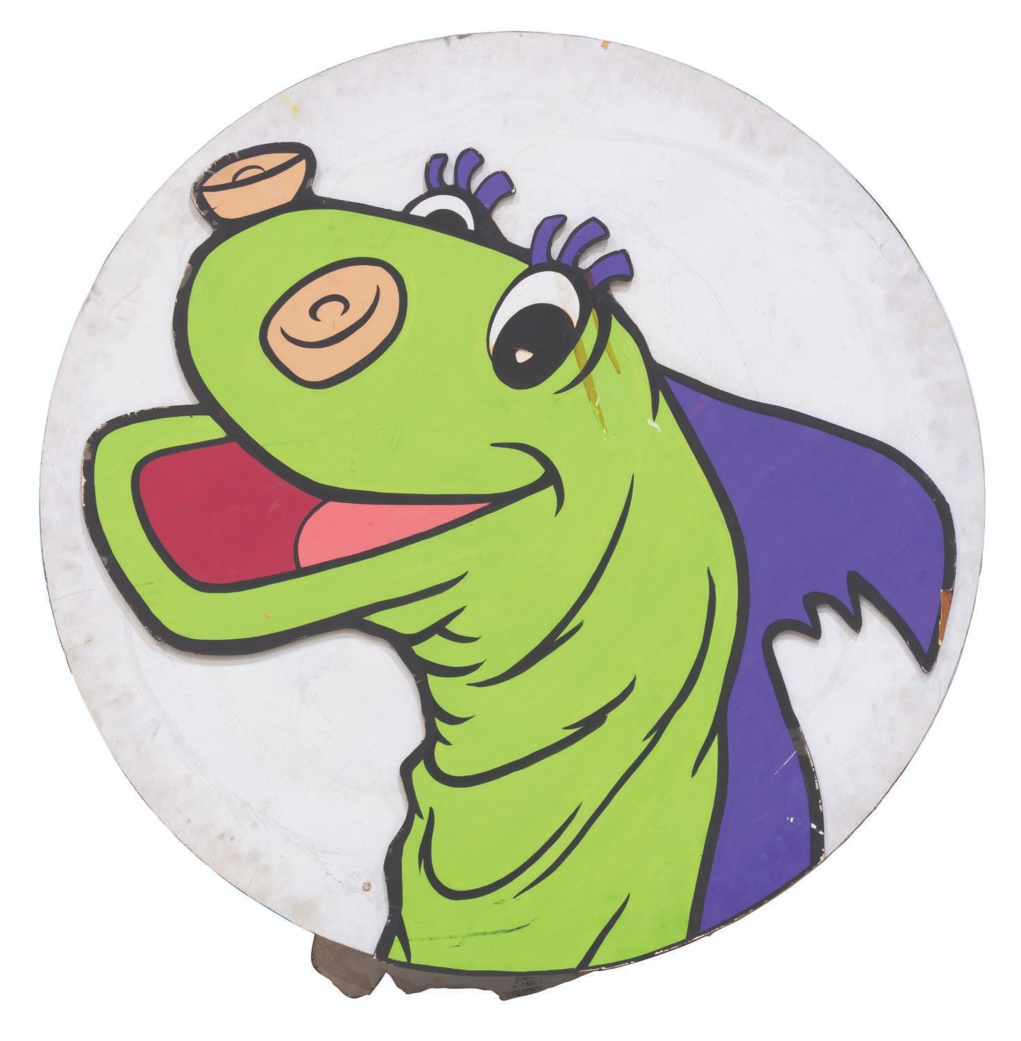 (Clampett, 1960s) A large double-sided “Beany and Cecil” display with Beany on one side, and Cecil on the other. Constructed of metal and wood and measuring 36” in diameter and 4” wide, the sign displays in fair condition with peeling, residue stains, a break in Beany’s right hand, soiling, and discoloration from age. Due to size and weight, this item requires special shipping arrangements. Please inquire before bidding.