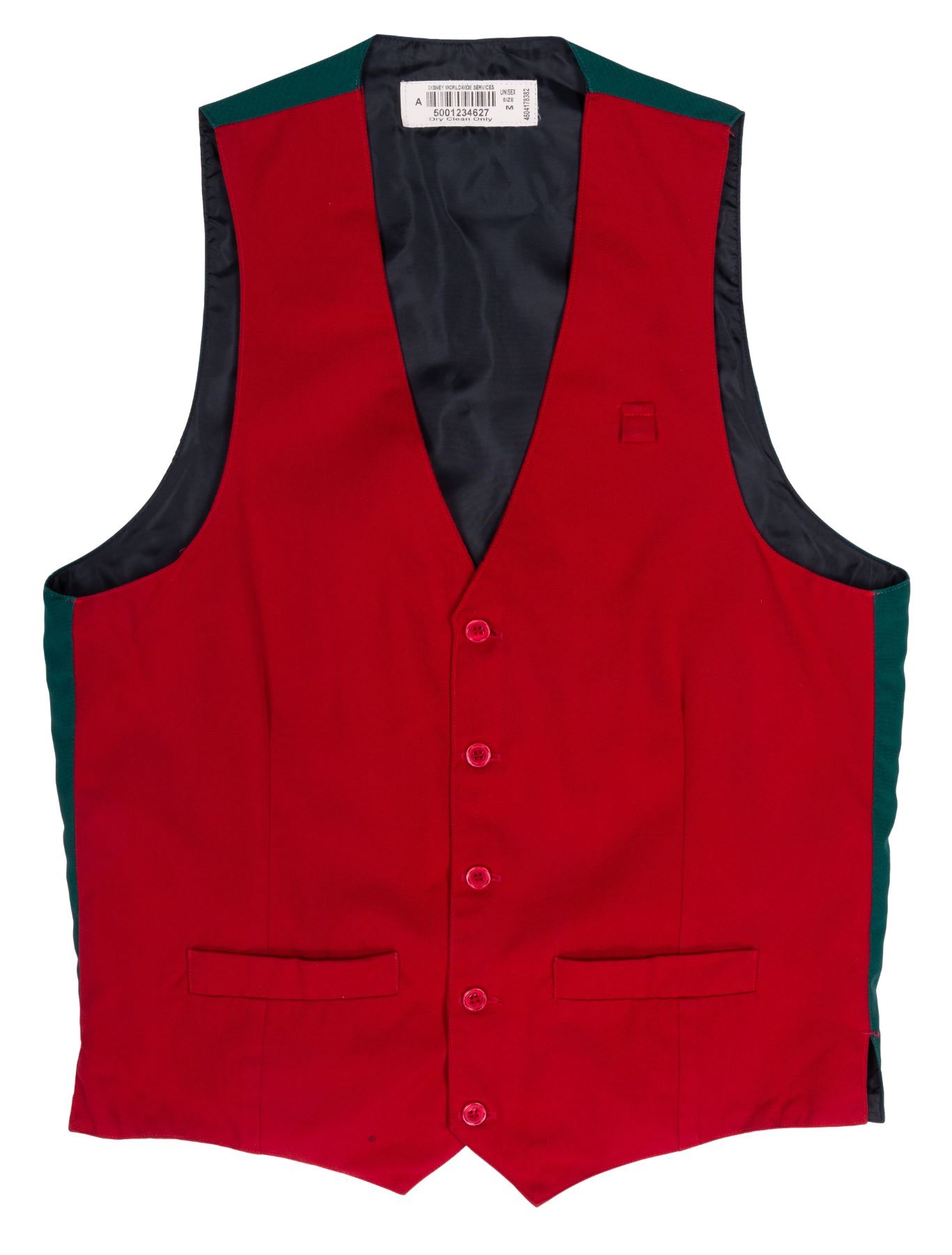 (Walt Disney World, 1980s-90s) A waistcoat worn by Downtown Disney Marketplace Cast Members working during the Holiday Season. Labeled a size unisex M, the waistcoat is in good condition with a stain on the lower bottom right.
