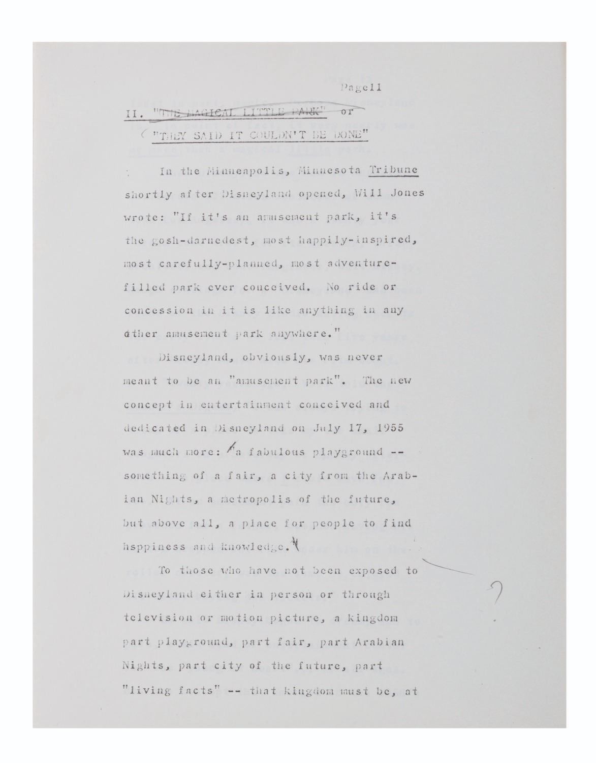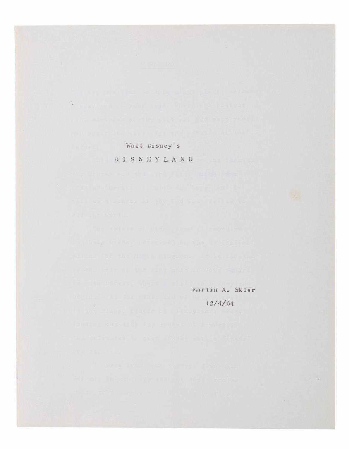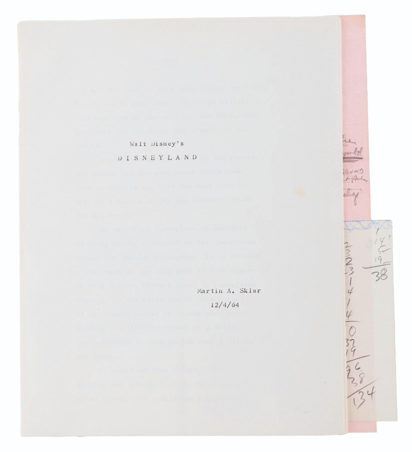(Disneyland, 1964) An early 17-page draft of Walt Disney's Disneyland book by Disney Legend Marty Sklar. Marty joined Disneyland a month before the Park opened, working for publicity and marketing, eventually becoming head of Walt Disney Imagineering. During his tenure, Marty oversaw numerous publications, press releases, and speeches, including "Walt Disney's Disneyland," which narrated the story of the Park's first ten years. The draft of this publication includes two pages of notes and correction marks from the editing process. Measuring 8.5" x 11" in a 9.5" x 14.75" manila folder, the draft is in good, production-used condition with creases, discoloration, and stains to the outer folder.